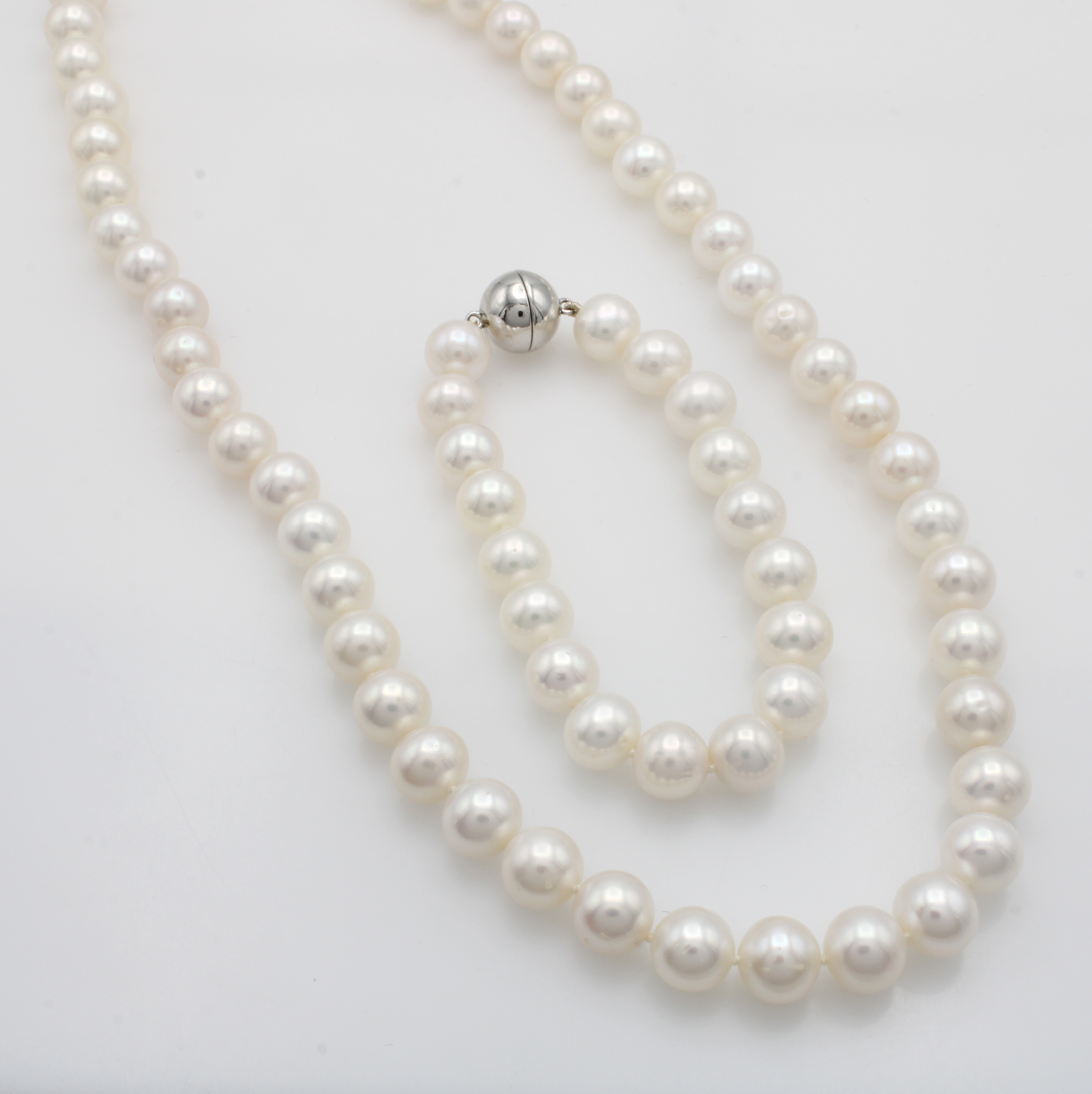 Set best. aus Süßwasserzuchtperlenkette und -armband, Magnetschl. 925er Silber, weiße Perlen ca. 9-10 mm, L. Kette: ca. 84 cm, L. Armband ca. 19 cm Schätzpreis: 1450, - EUR