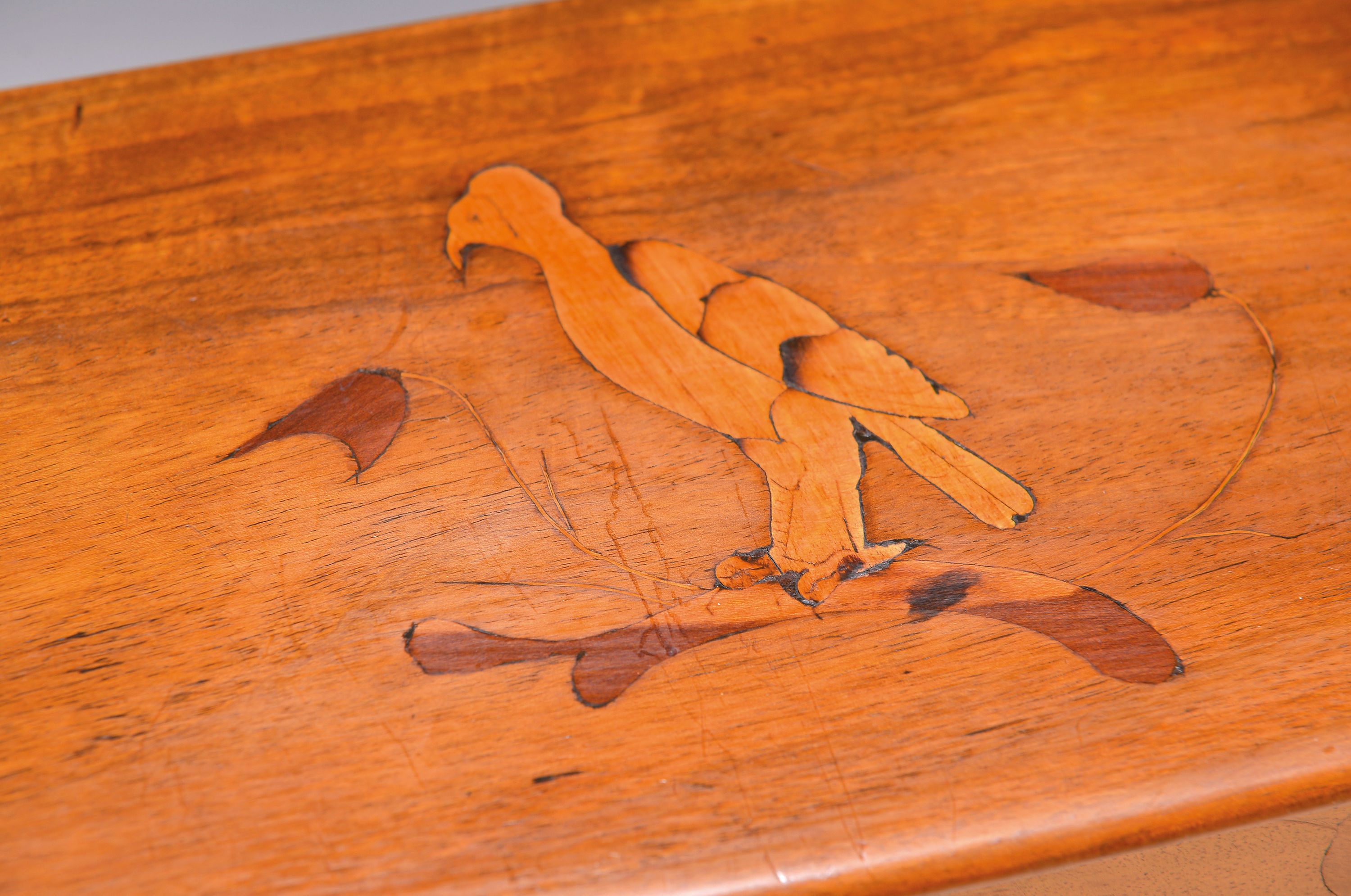 mit Vogel und stil. Eicheln intarsiert, drei Schubladen, ca. 18 x 33 x 17 cm, EZ