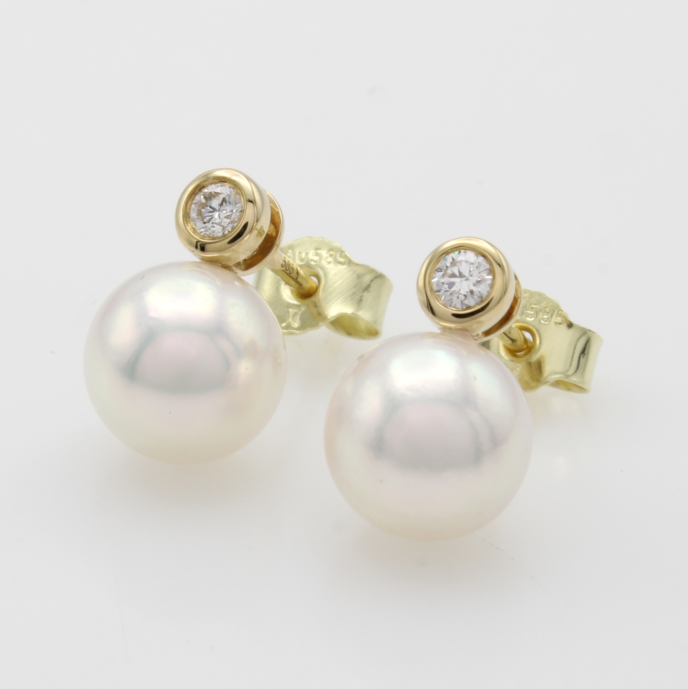 Paar Ohrstecker mit Akoyazuchtperlen und Brillanten, GG 585/000, 2 weiße Perlen ca. 8-8.5 mm, 2 Brill. in Zargenfassungen zus. ca. 0.10 ct Weiß/si Schätzpreis: 1520, - EUR