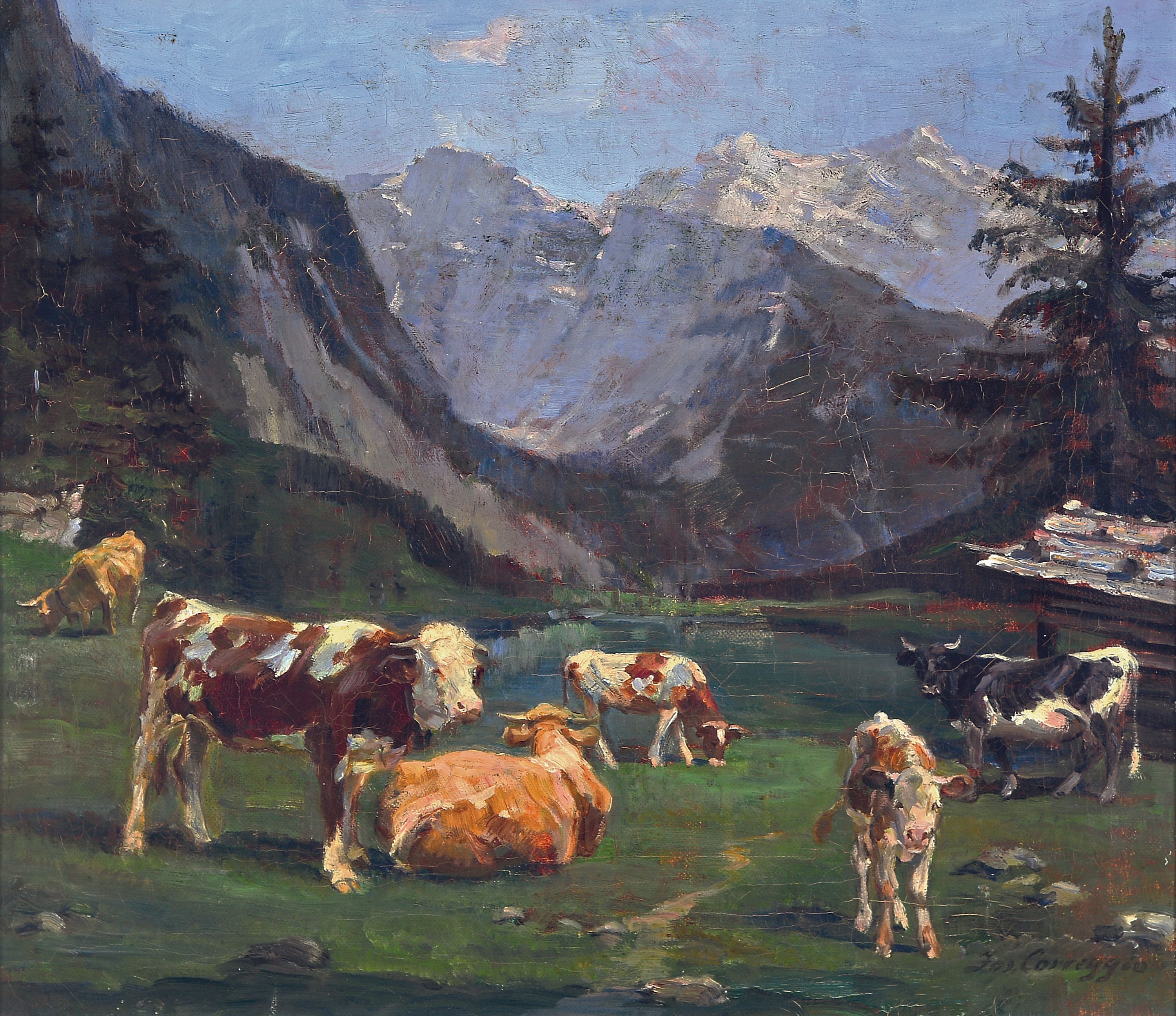Josef Corregio, 1810 Wolfratshausen -1891 München, Fleckvieh im Hochgebirge, Öl/Lwd,