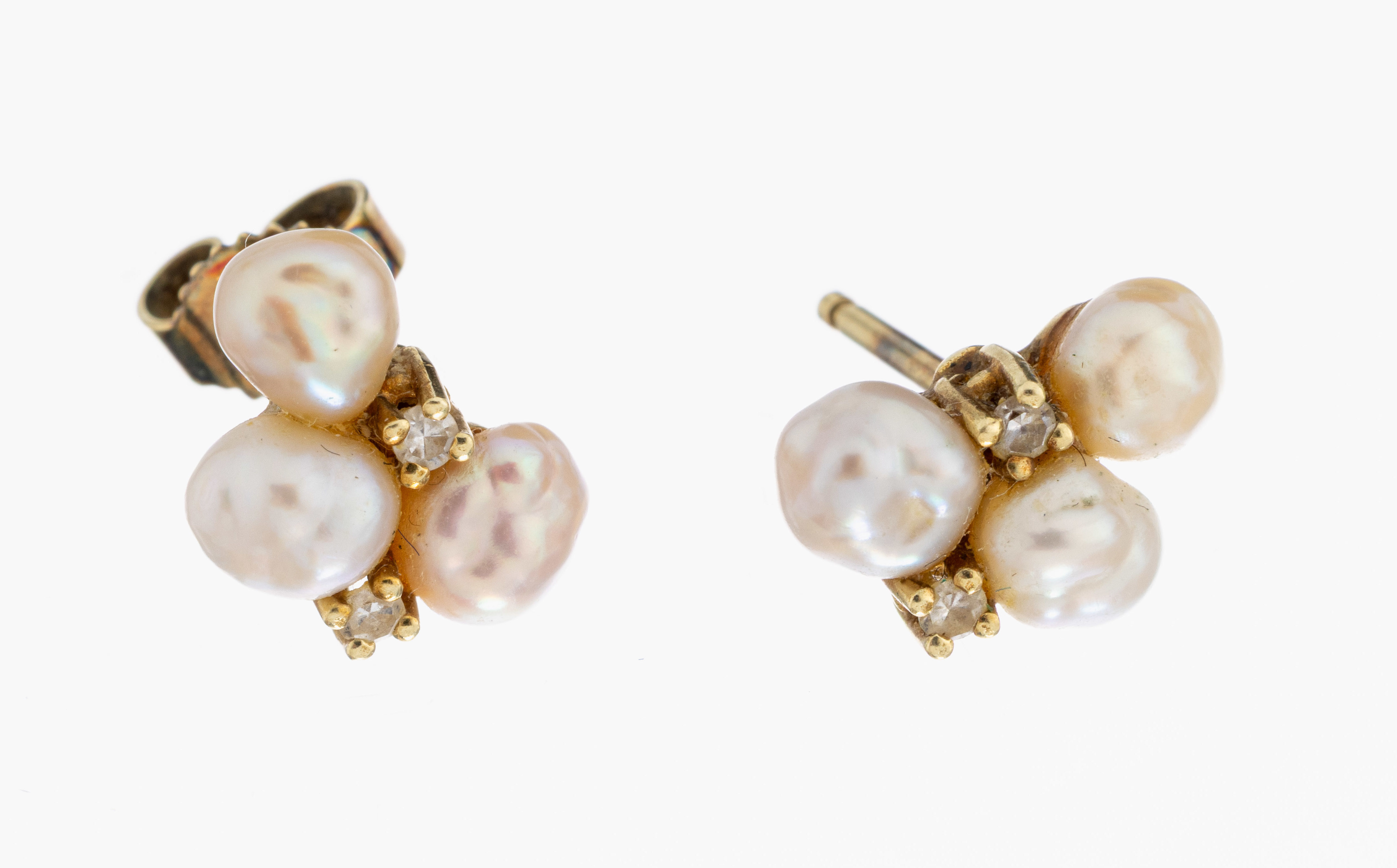Paar 14 kt Gold Perl-Diamant-Ohrstecker, GG585/000, 6 unrunde Zuchtperlen, 4 kl. 8/8- Diamanten, ca. 1.9 g, 1 Brisur fehlt