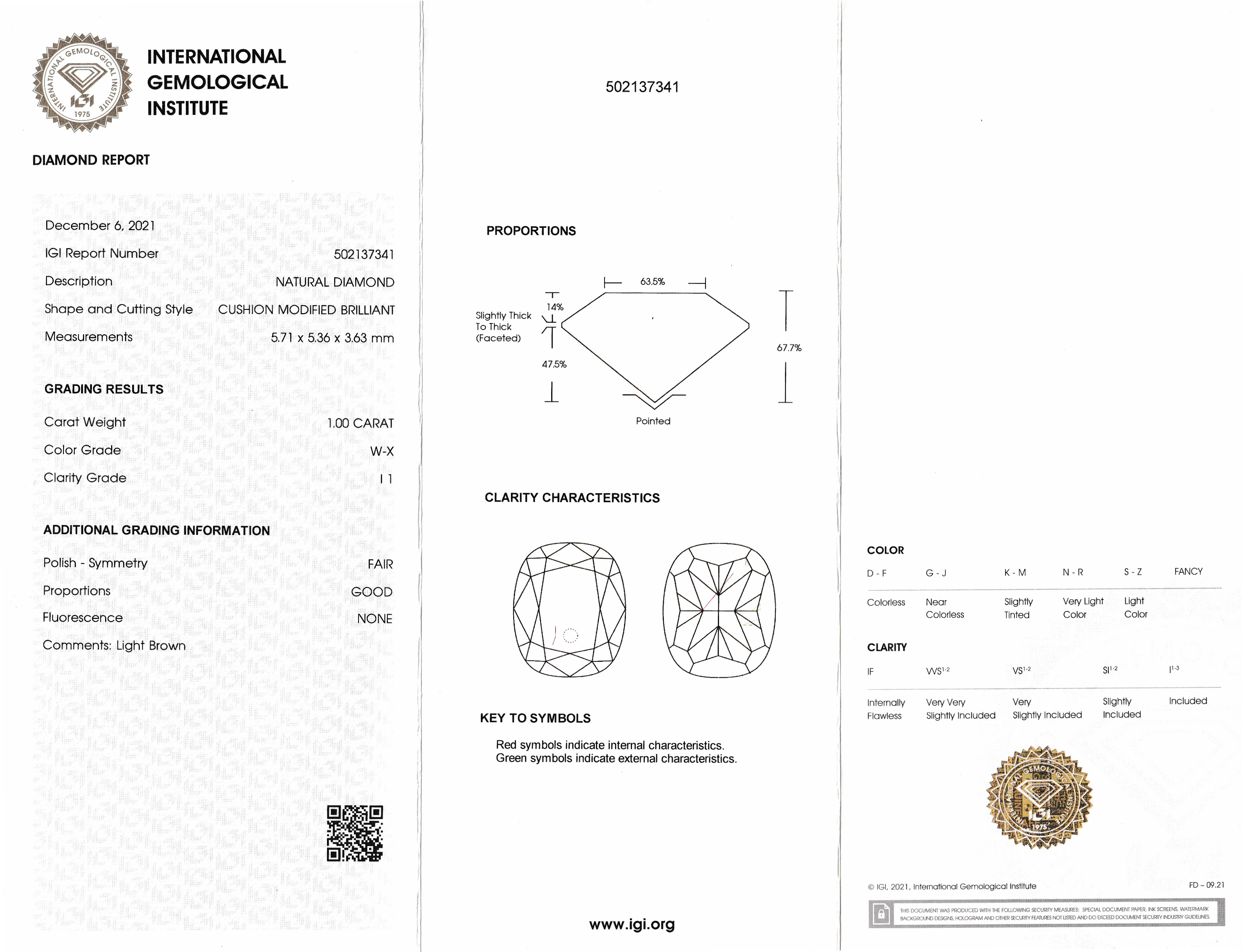 Loose diamond in Cushion-Cut, 1.00 ct , Light Brown (W-X)/p1, sealed, IGI expertise Valuation Price: 2185, - EUR