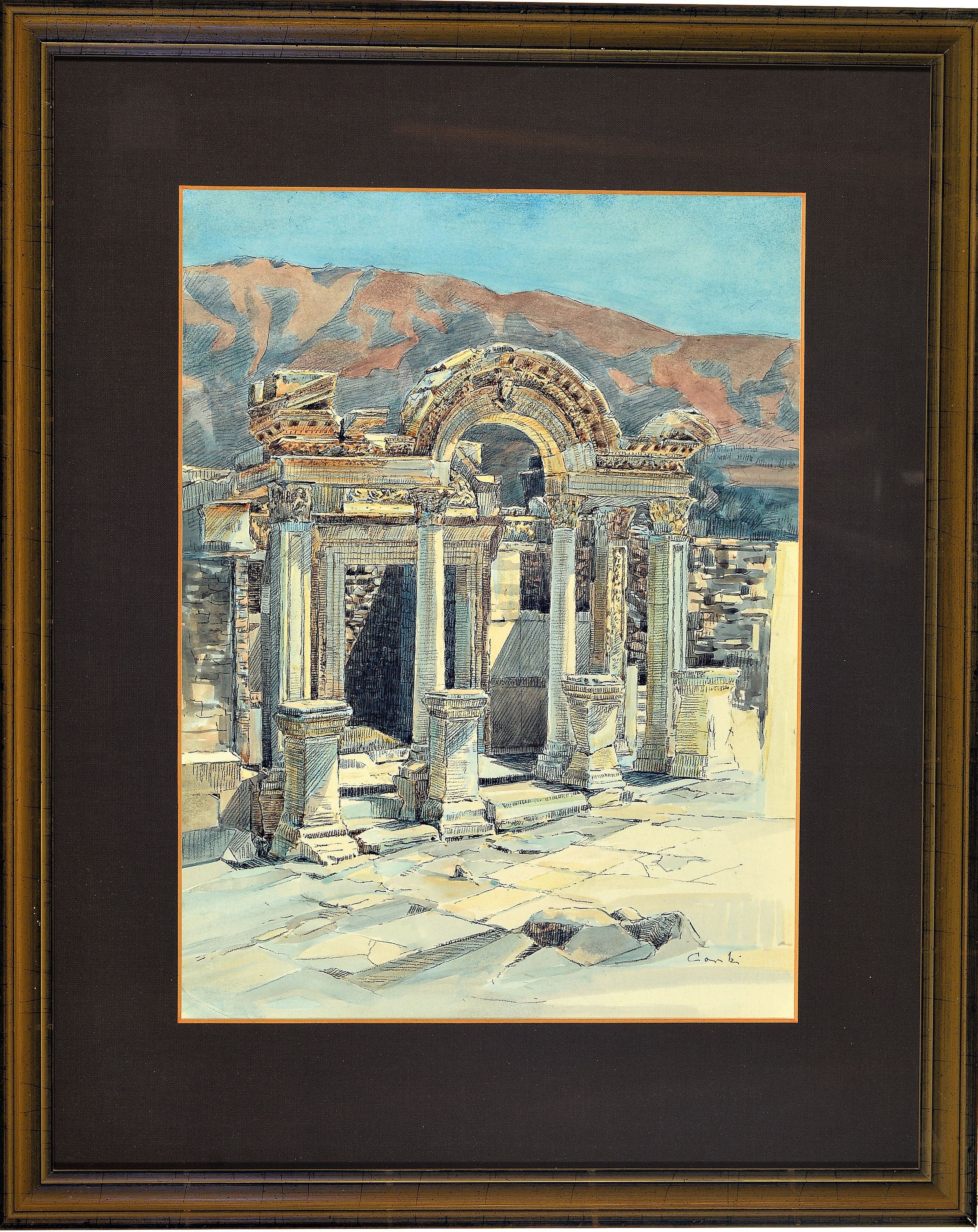 Ruinenlandschaften, signiert, rückseitig auf Rahmung gestempelt Mergel Wiesbaden,