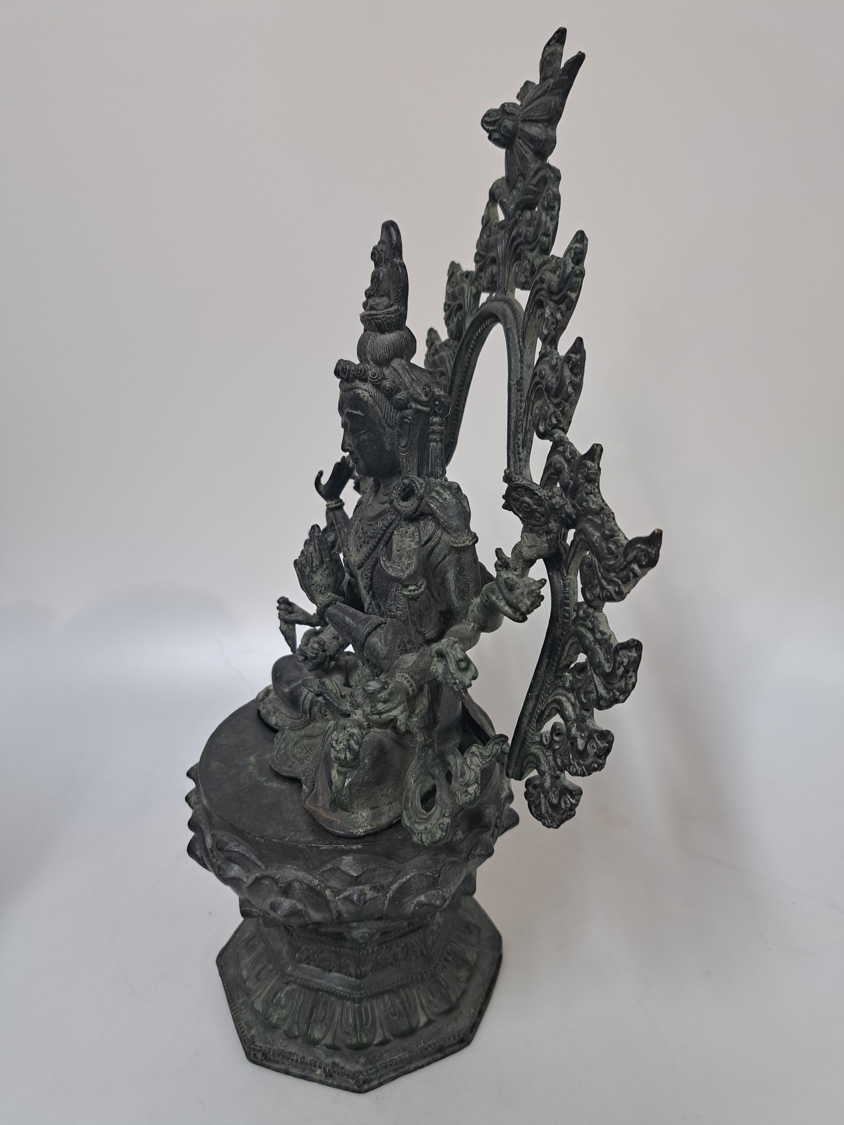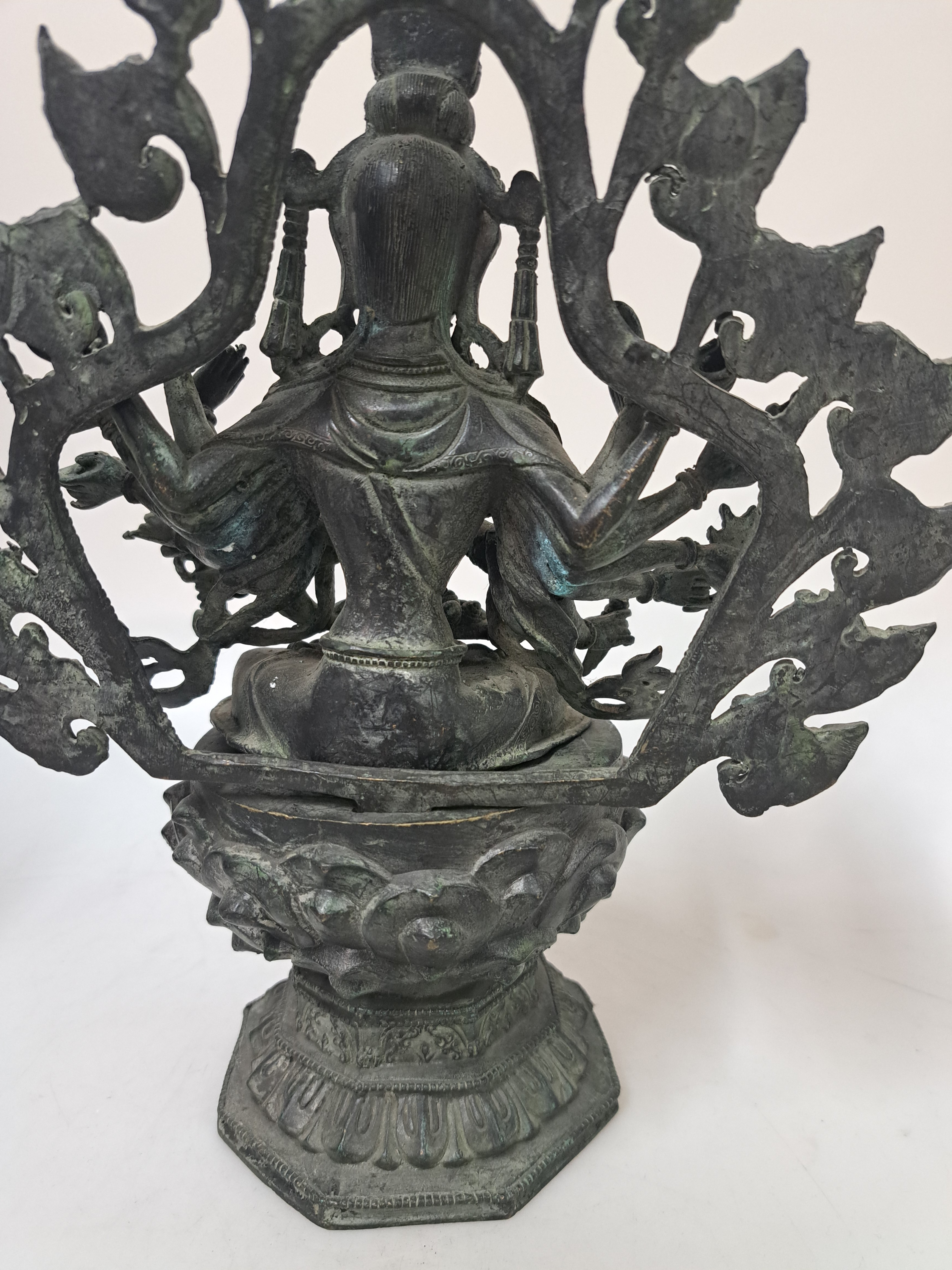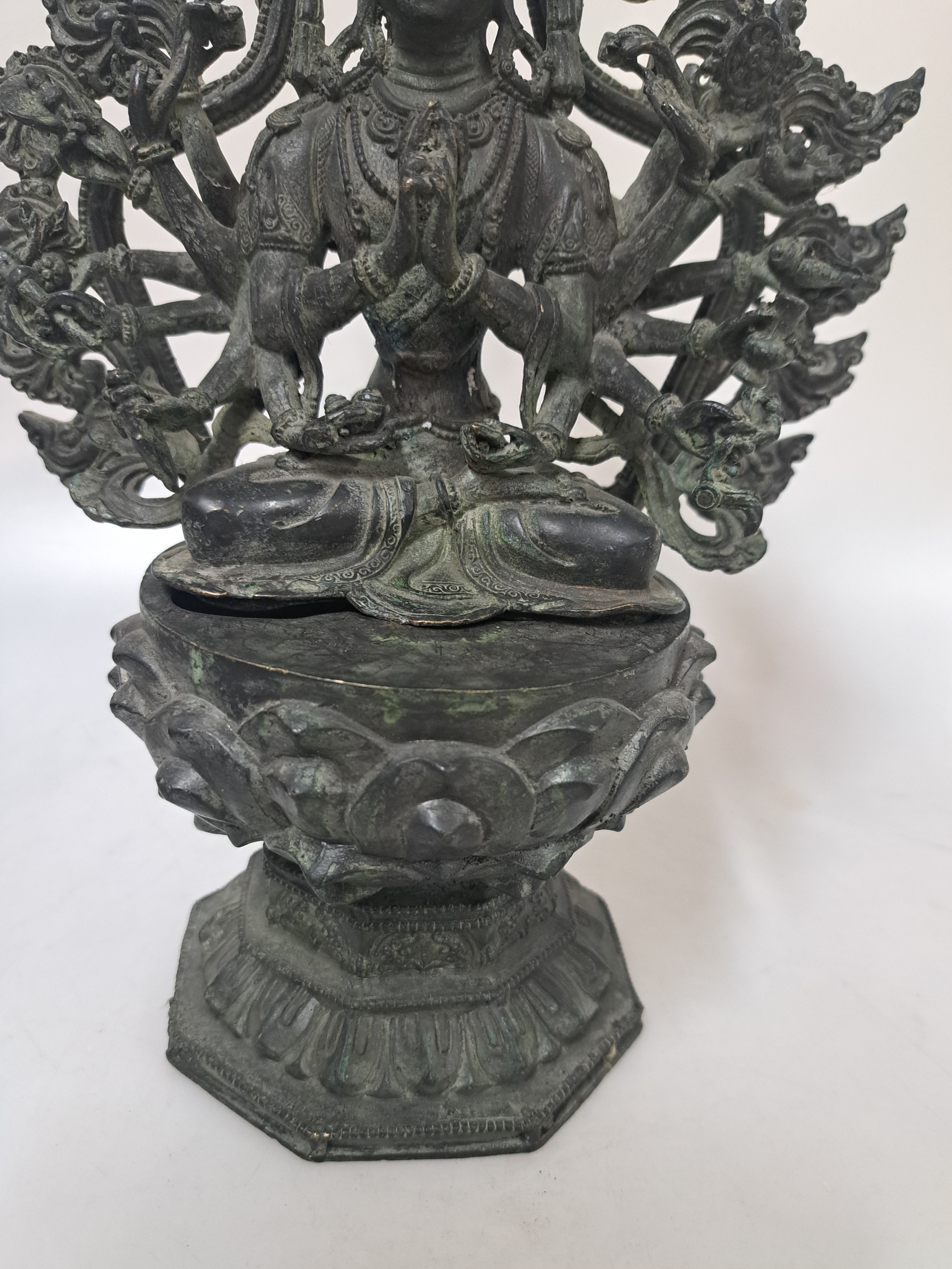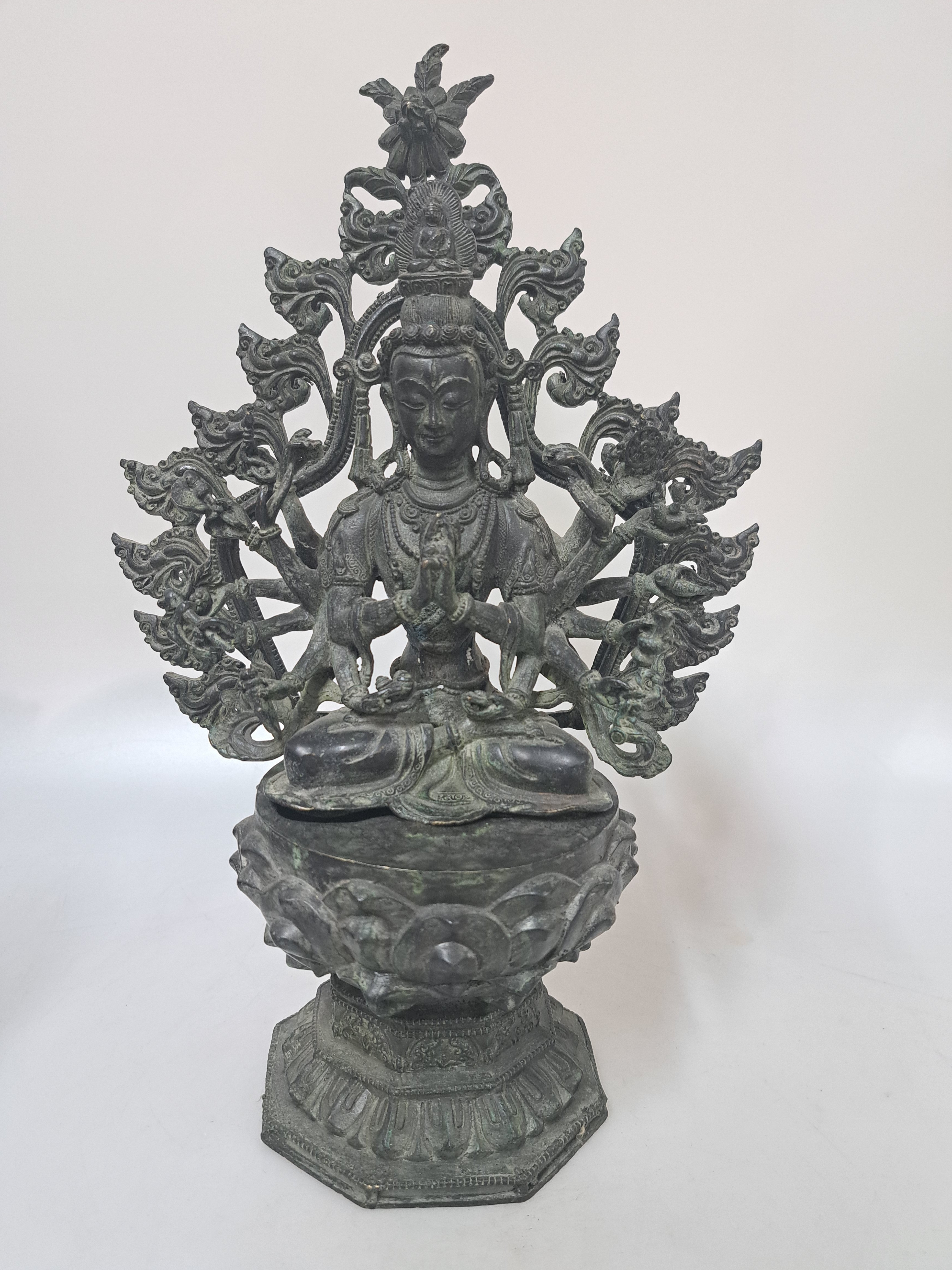 Avalokiteshvara figure, China, 20th century, bodhisattva of universal compassion, 18 arms, with attributes, on a high lotus throne, mandorla, three parts, height approx. 34cm