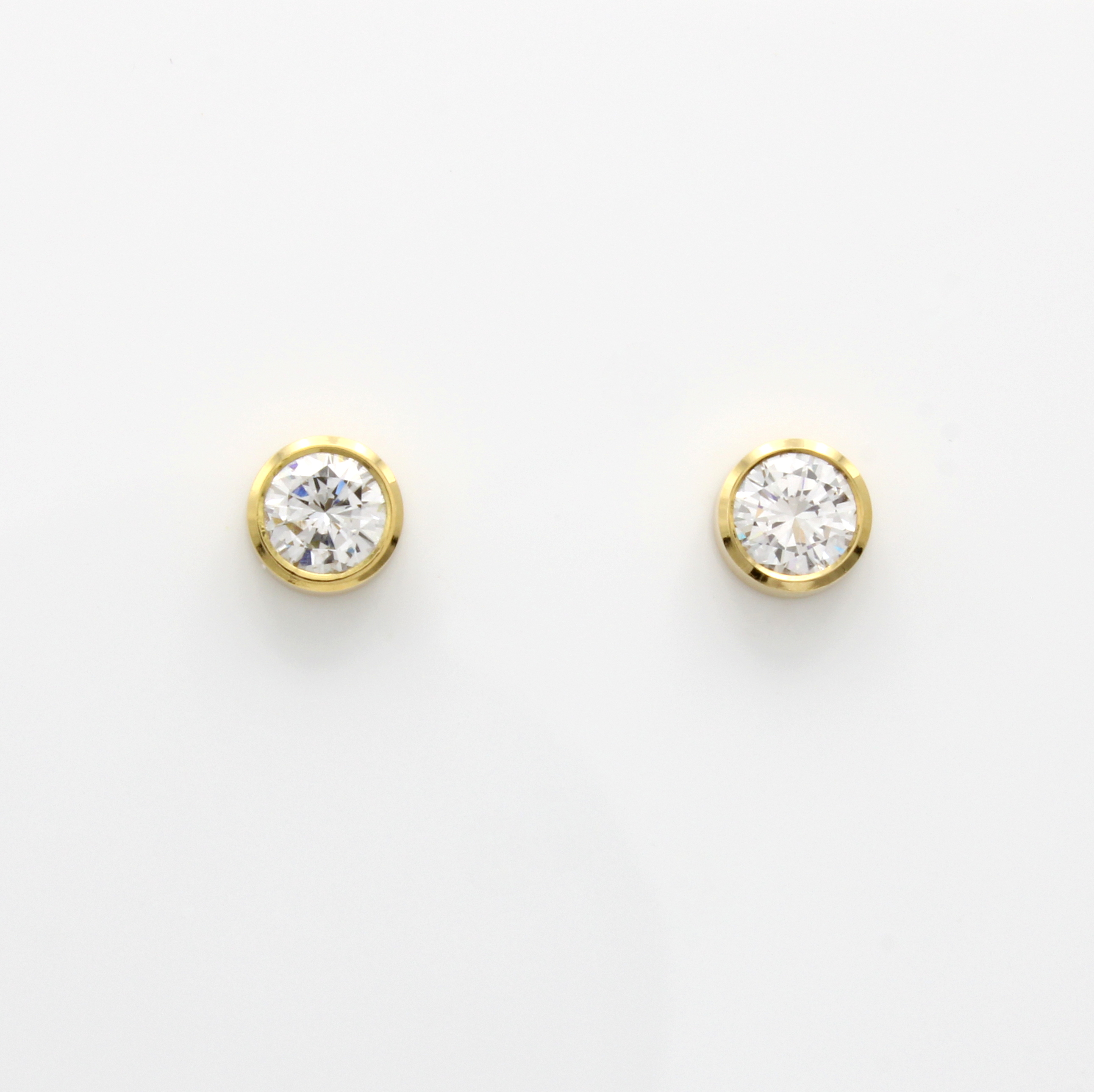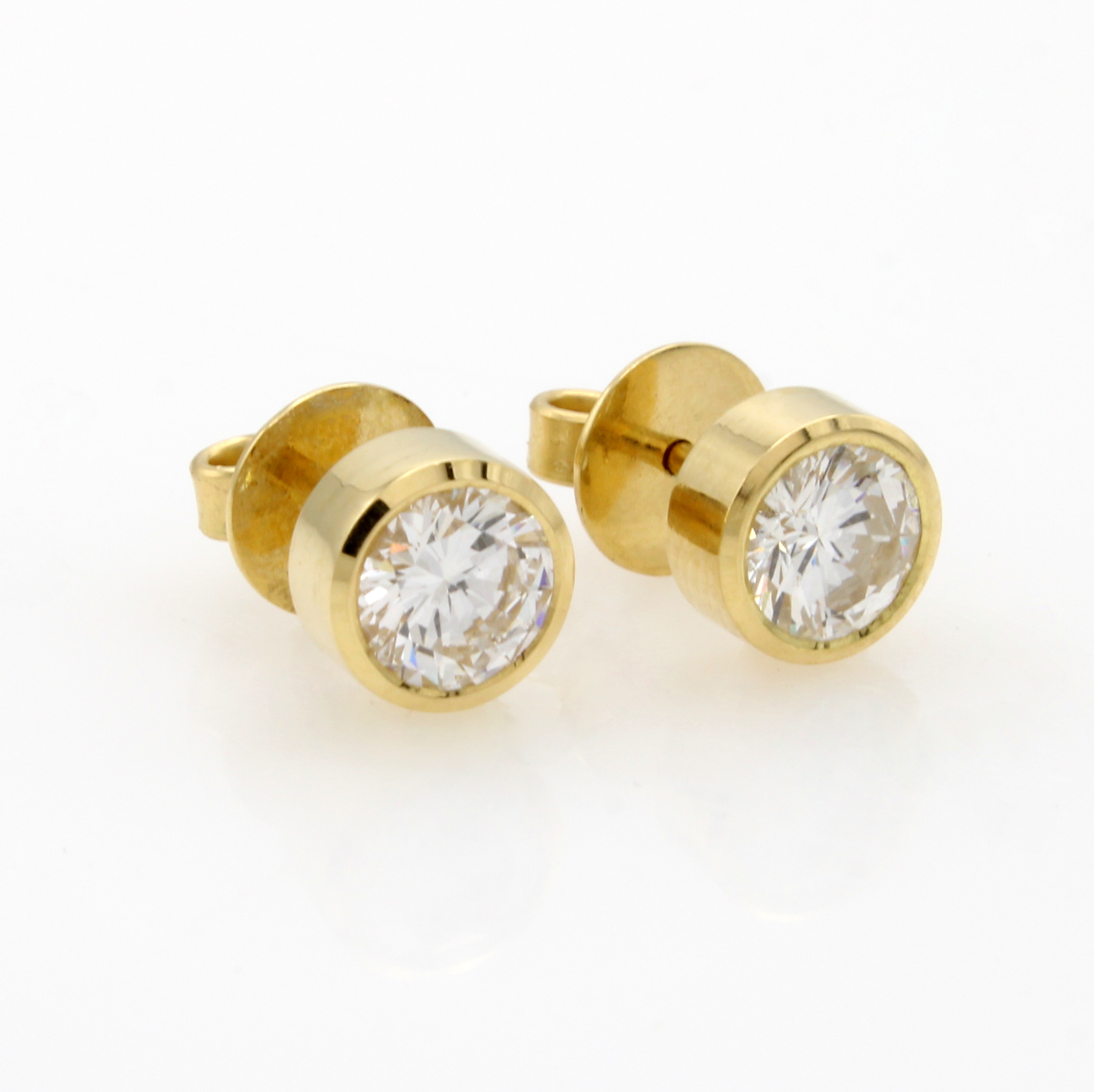 Paar Ohrstecker mit Brillantsolitären, GG 750/000, 2 Brill. in glatten Zargenfassungen zus. ca. 1.13 ct feines Weiß-Weiß/vs-si, Goldschmiedearbeit Schätzpreis: 5650, - EUR
