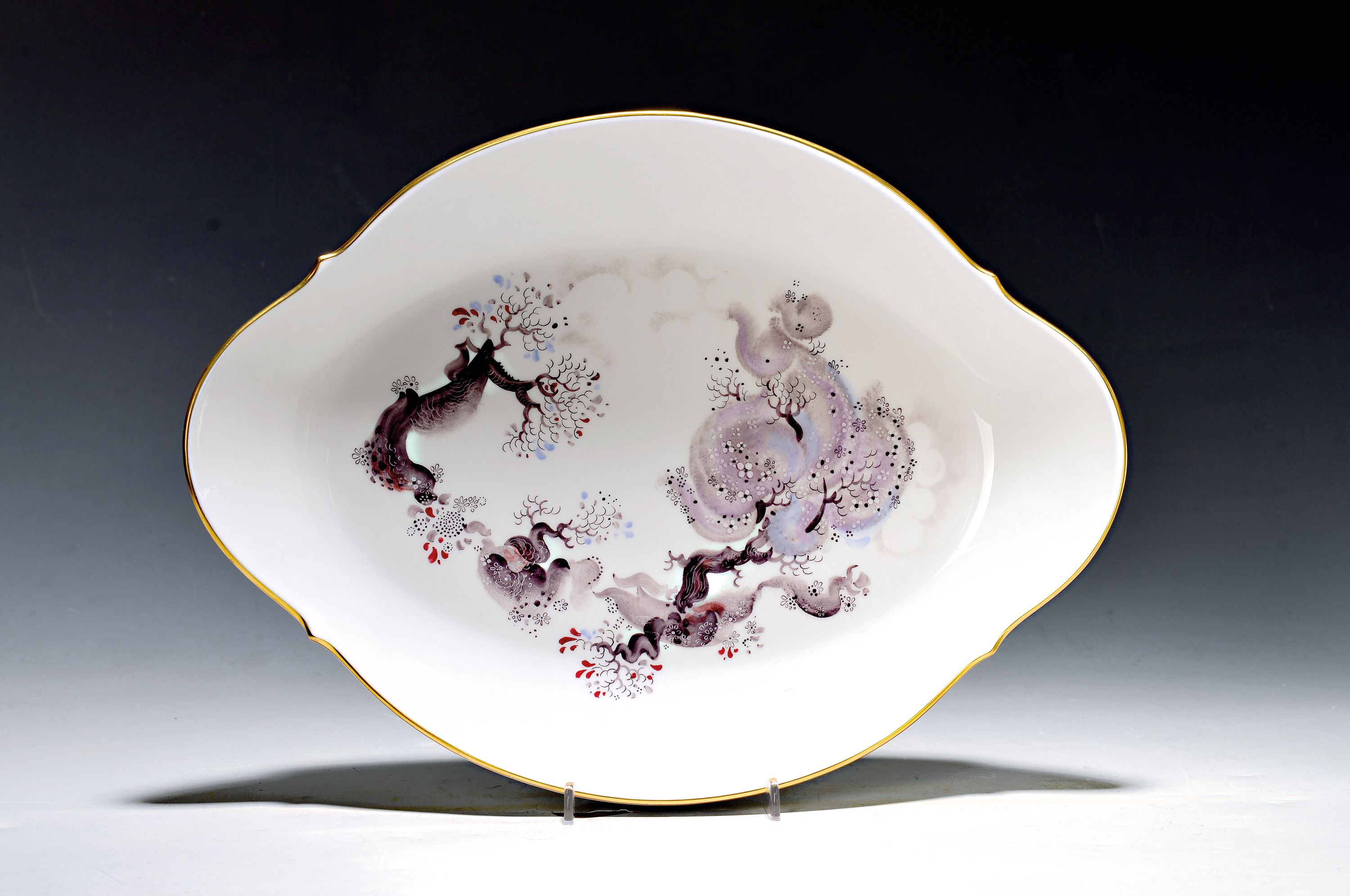 Vierpassige Platte "Mandelbäumchen", Meissen, 1980er-Jahre, 2.Wahl, Porzellan, Goldrand, 36x27 cm