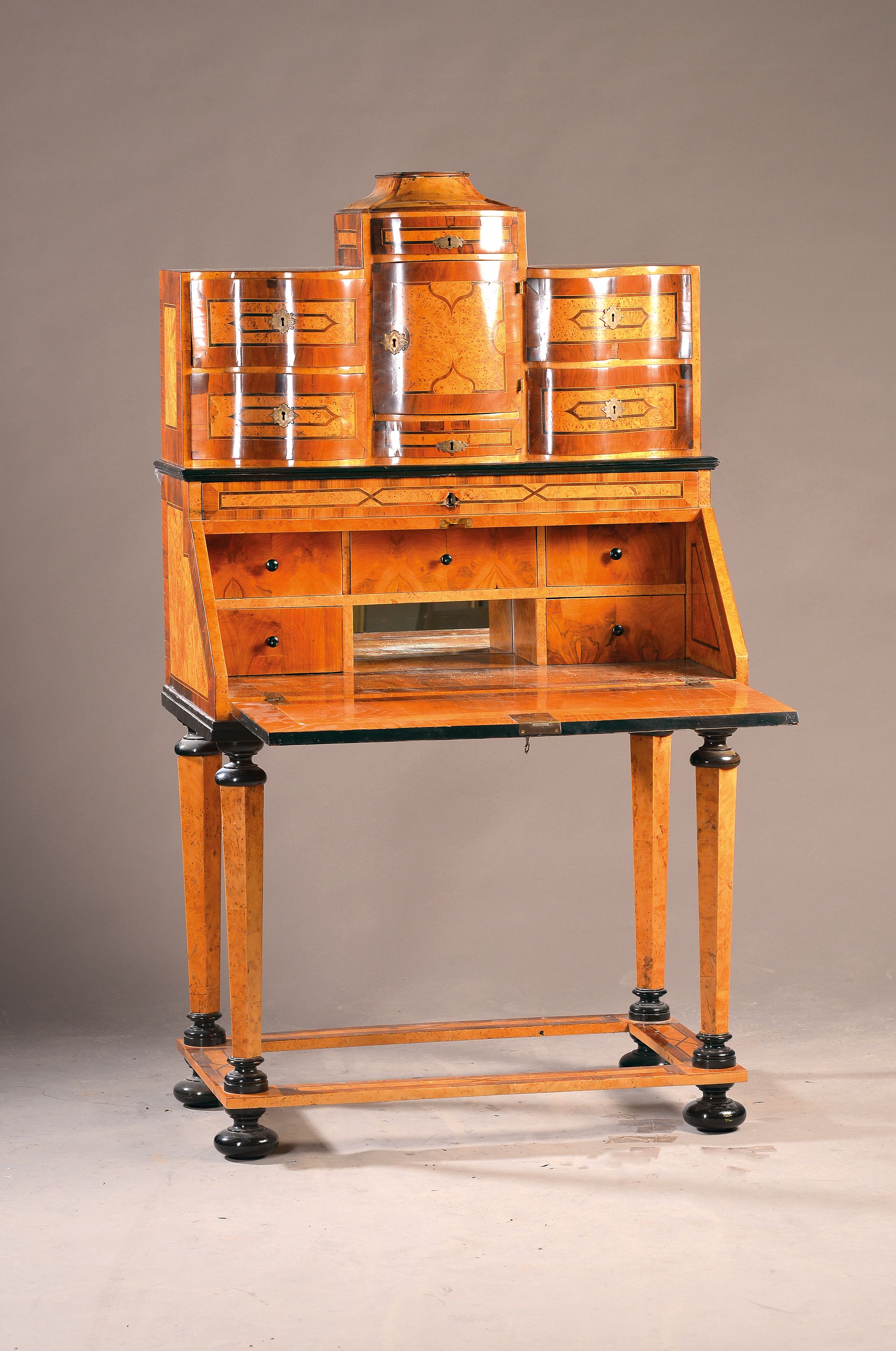 Ahornfurnier, z.T. schwarz abgesetzt, Marketerie, Unterbau, Schlösser, Scharniere