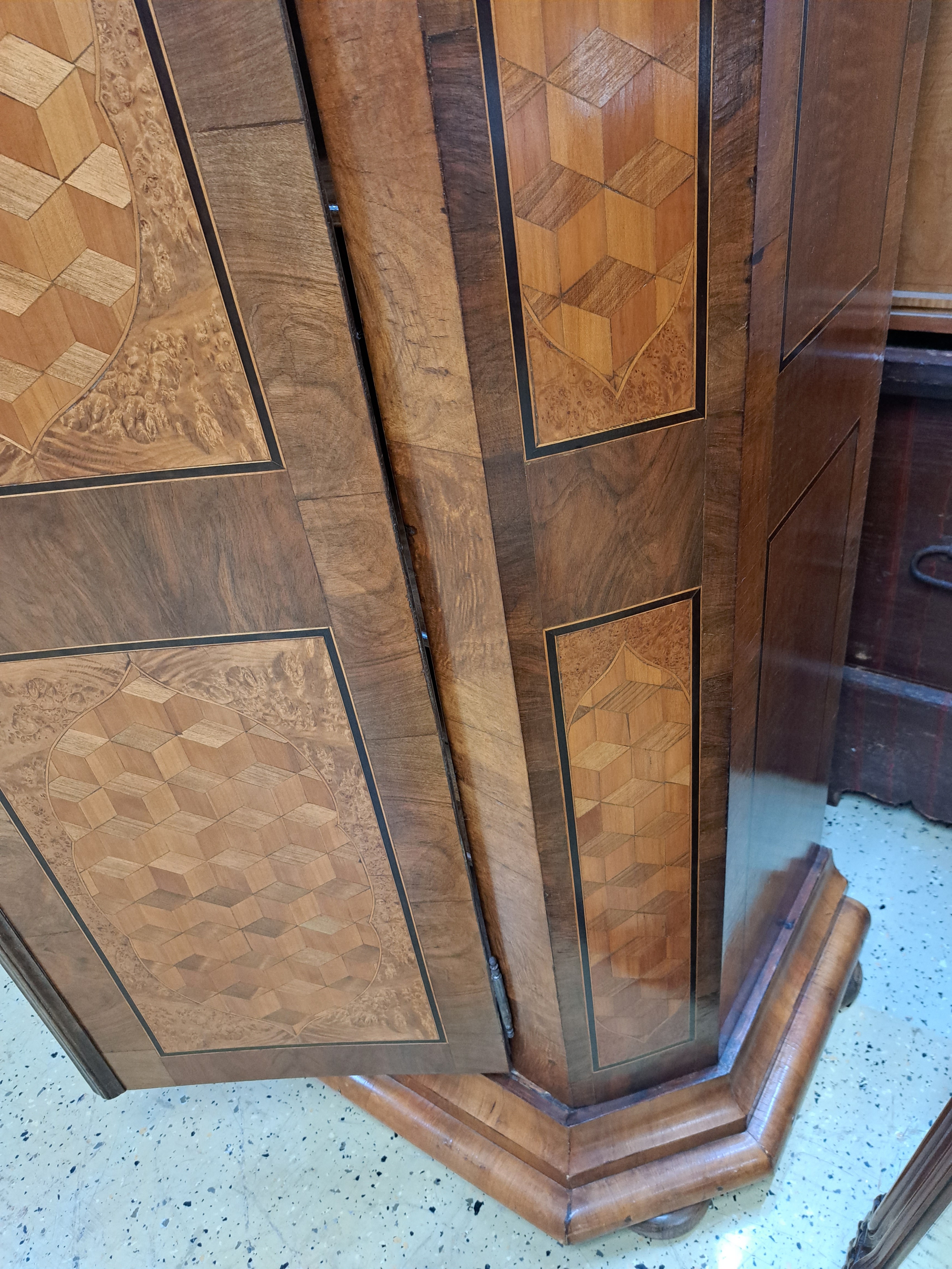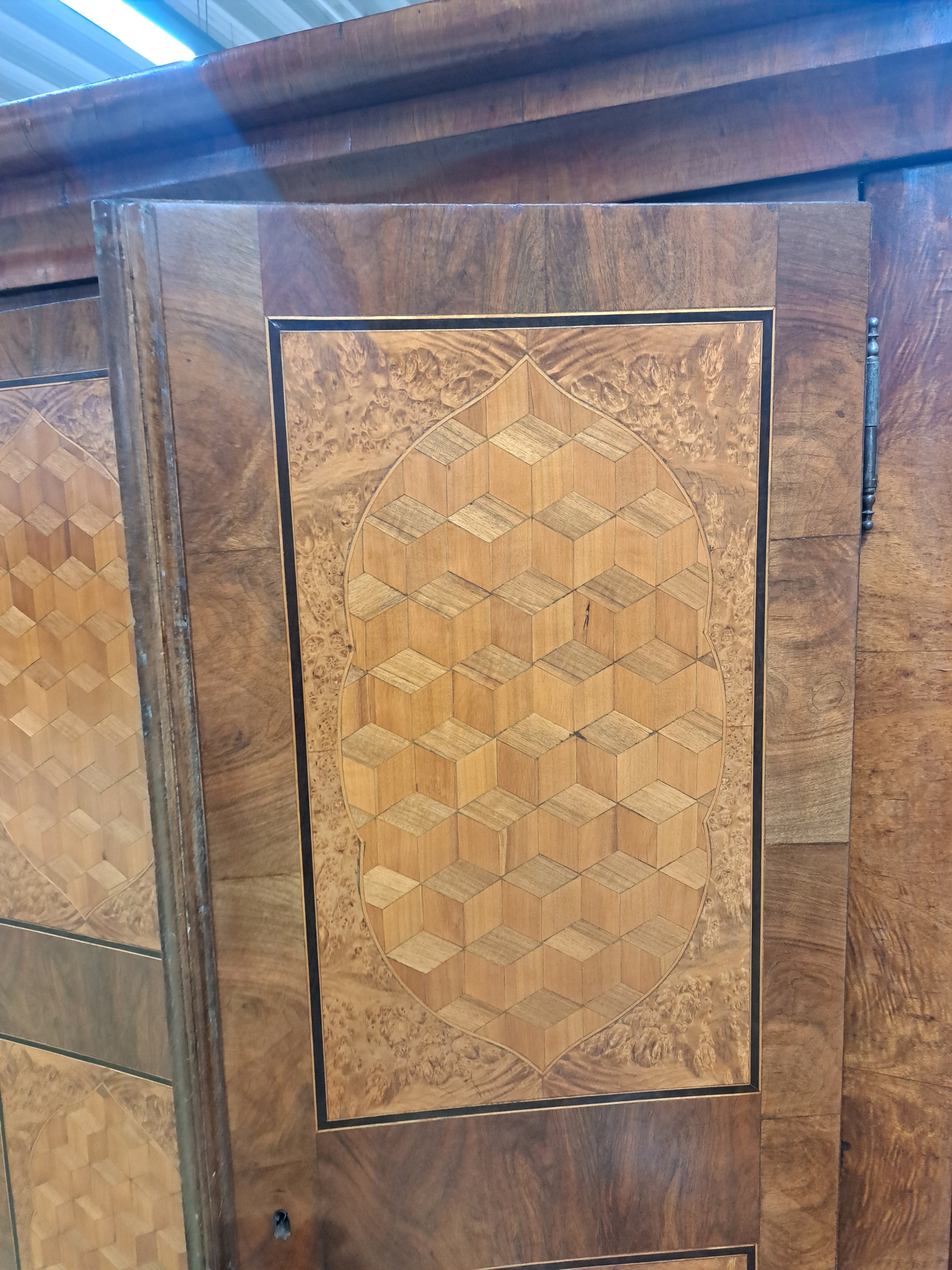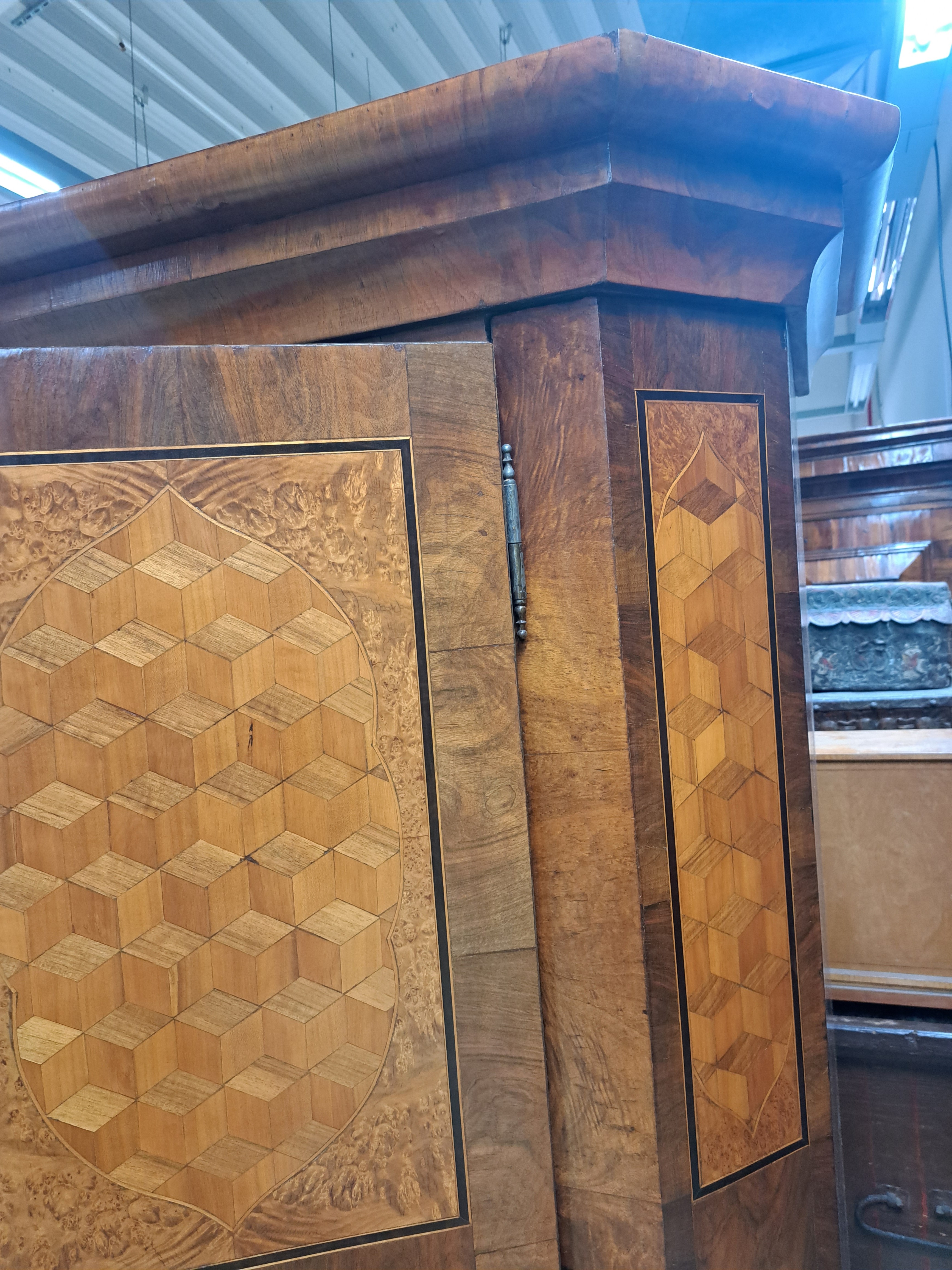 Biedermeierschrank, um 1830/40, Nußbaumfurnier, Türen mit aufwendigen Würfelintarsien aus diversen Hölzern, ca. 194 x 172 x 64 cm, EZ 2