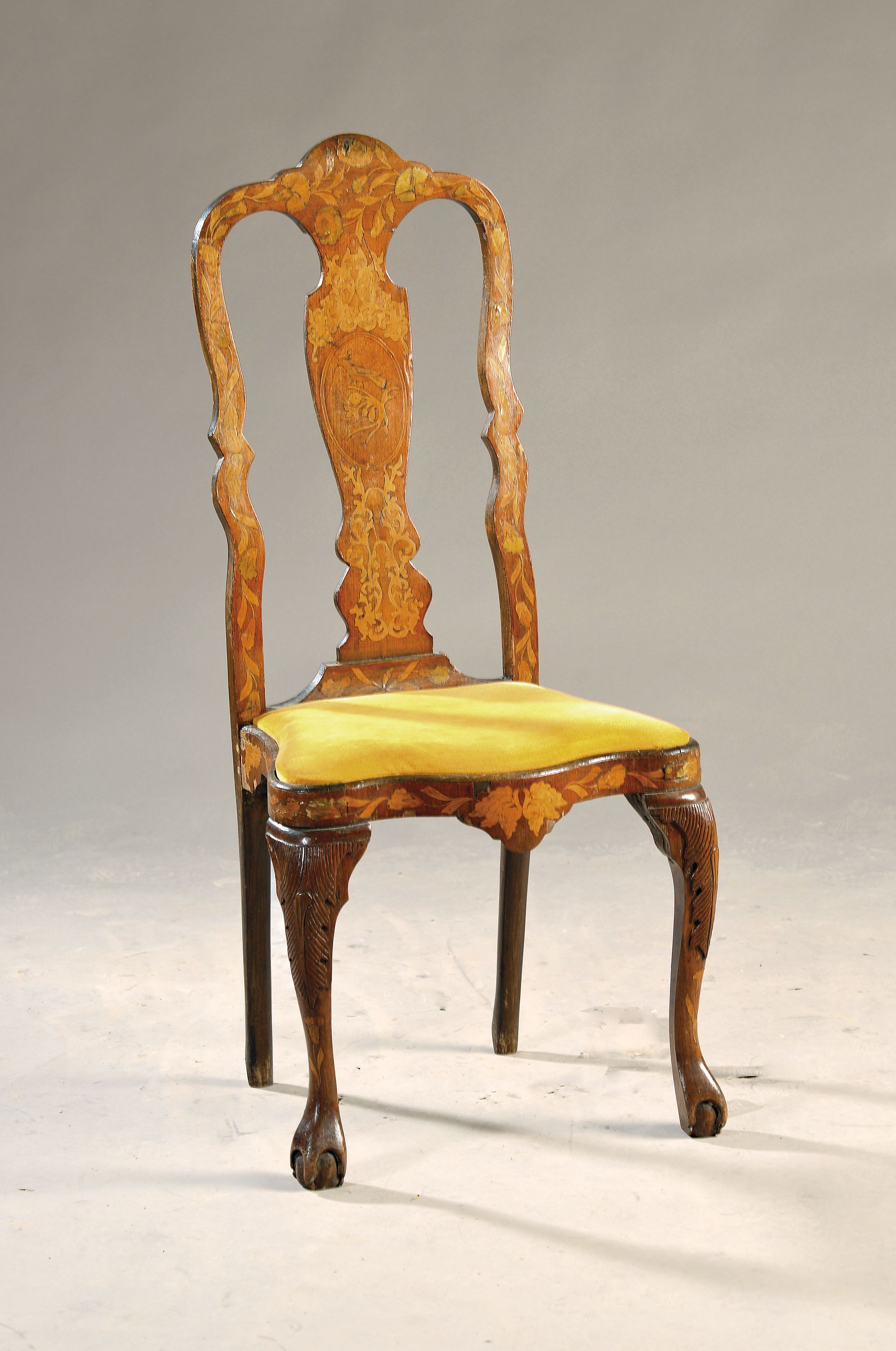 Stuhl, wohl Niederlande, um 1750, Nussbaum, aufwendig intarsiert aus diversen Hölzern,