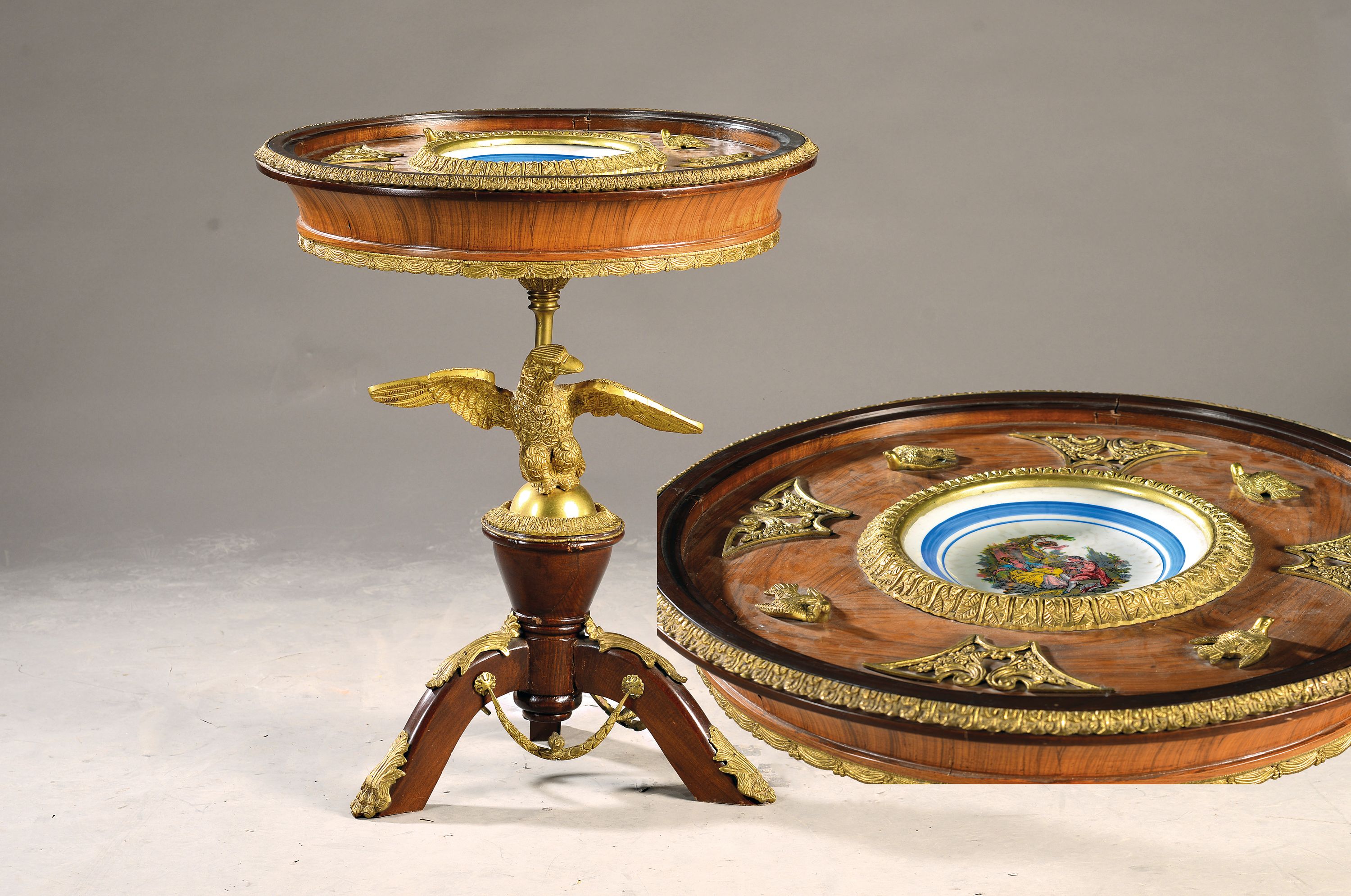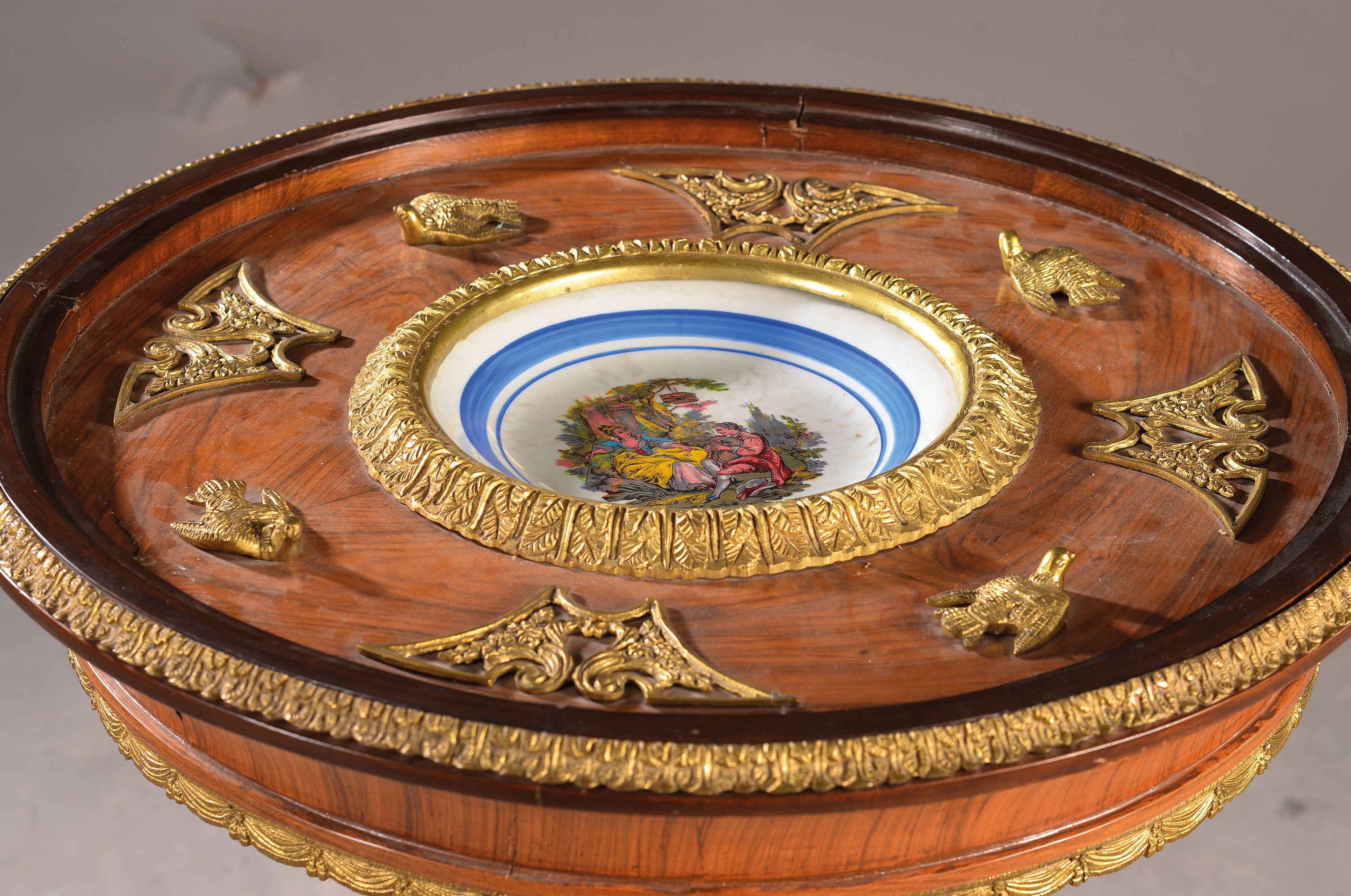 Tisch mit eingelassenem Teller, Frankreich, 19.Jh., Nußbaumfurnier, aufwendige Messingapplikationen