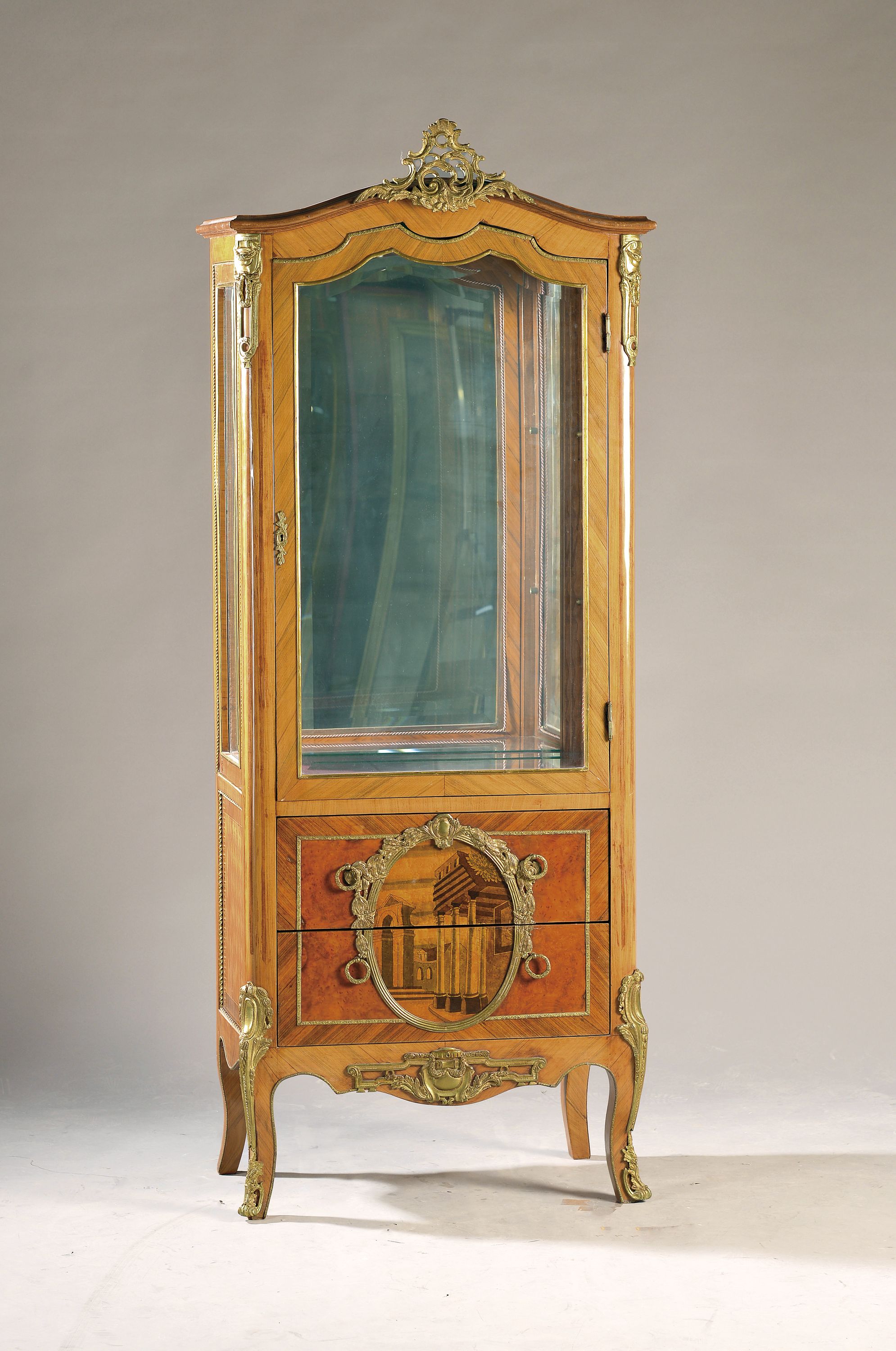 Rückwand verspiegelt, aufwendige Messingapplikationen und Messingleisten, 2 Schubladen,