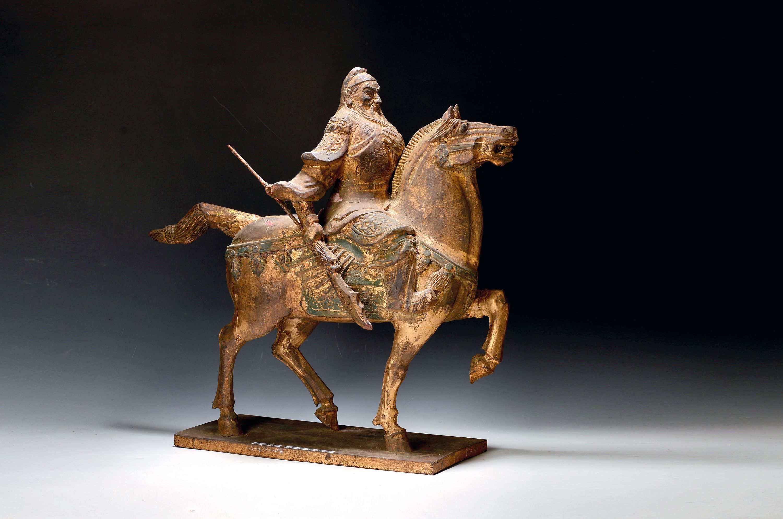 Reiterstandbild des General Guang Gong 1. Hälfte 19. Jh., Keramik, Reste alter Vergoldung, rest., auf Holzplatte montiert, H. ca. 56cm