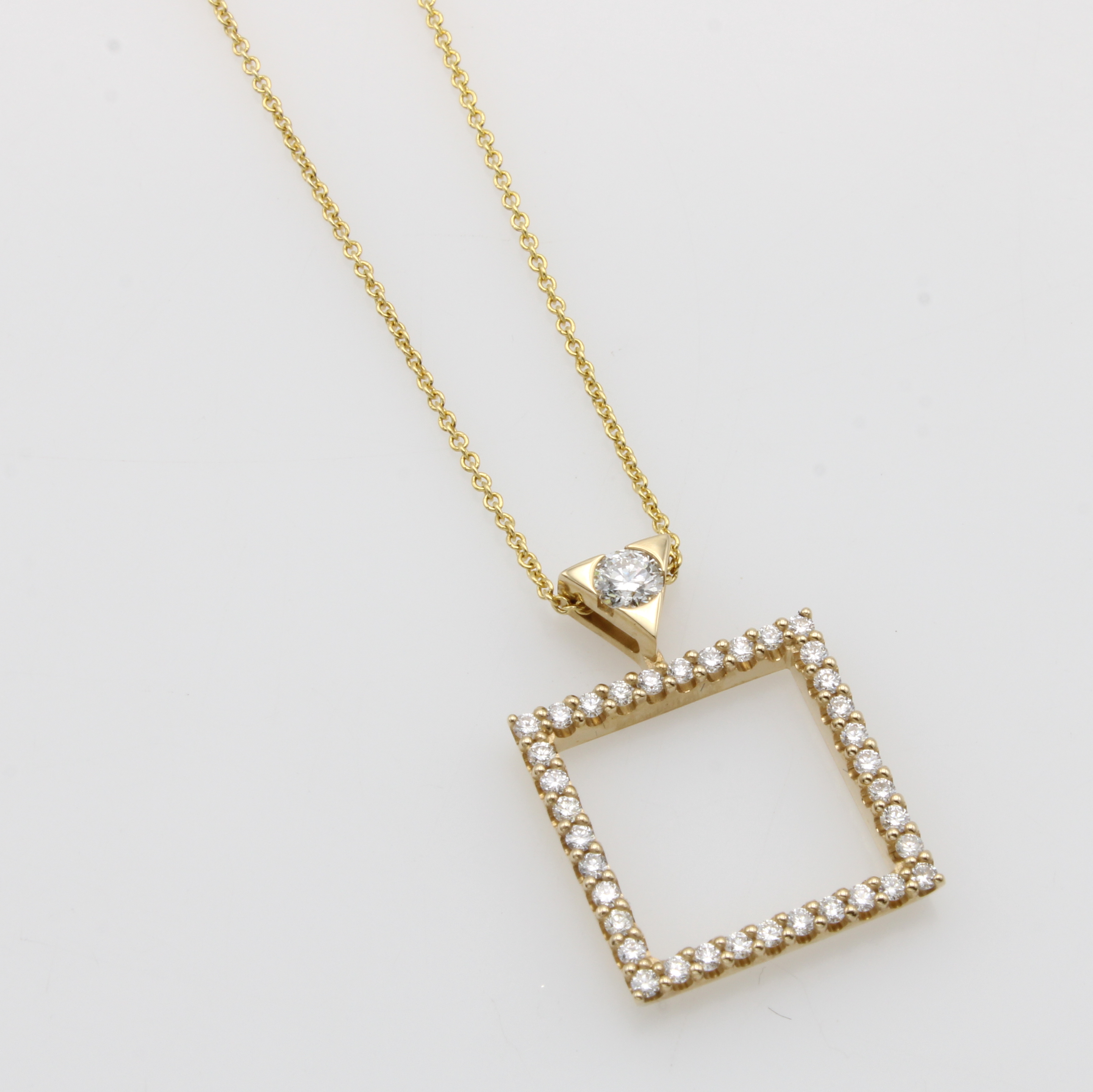 Anhänger mit Brillanten an Kette, GG 585/000, Solitär u. Besatzbrill. zus. ca. 0.45 ct Weiß/si, Carréeform, in L. ca. 43 und 45 cm zu tragen Schätzpreis: 2140, - EUR