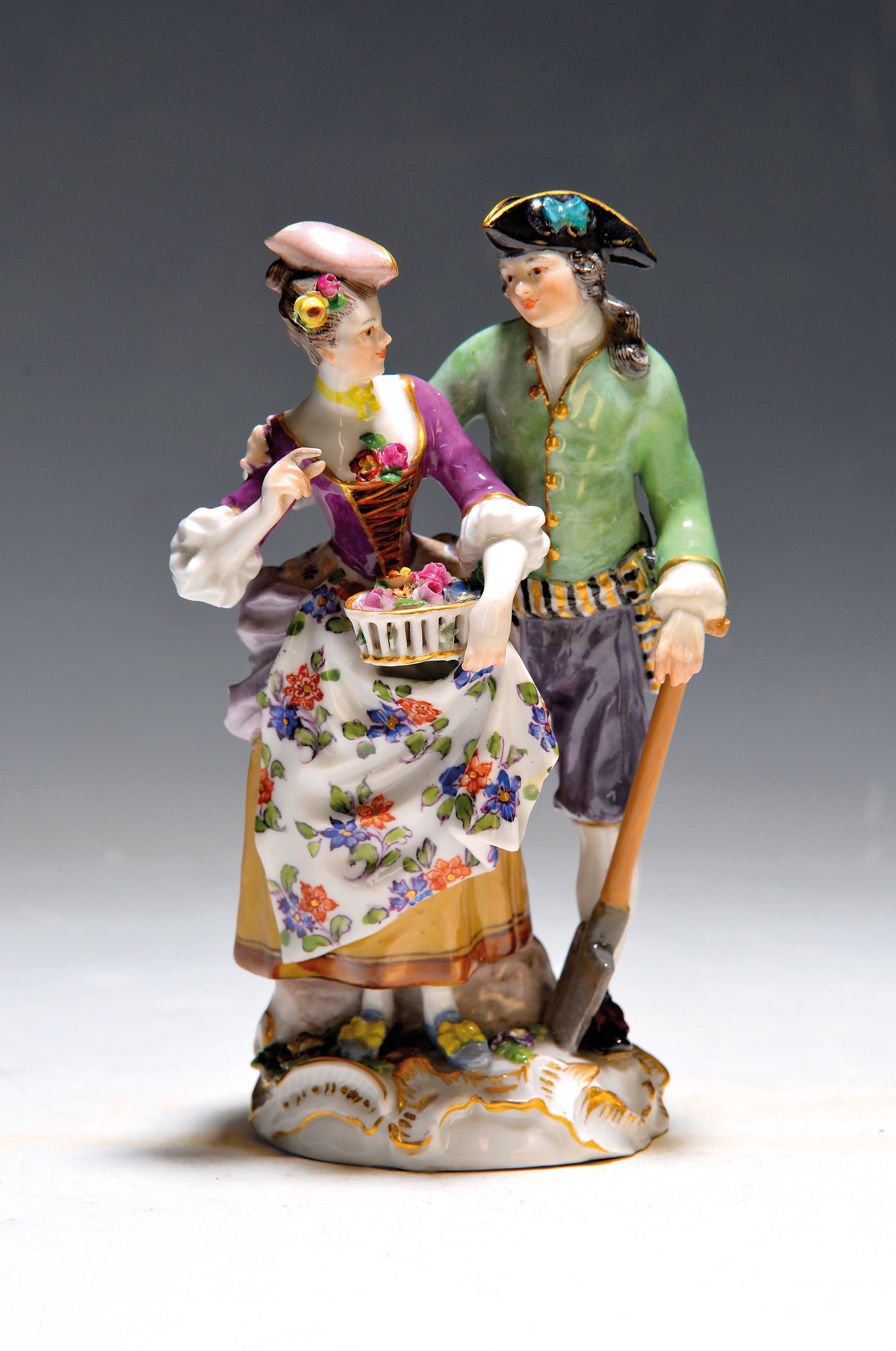 Porzellangruppe, Meissen, um 1910, galantes Gärtnerpaar, polychrome Bemalung, Rocaillensockel,
