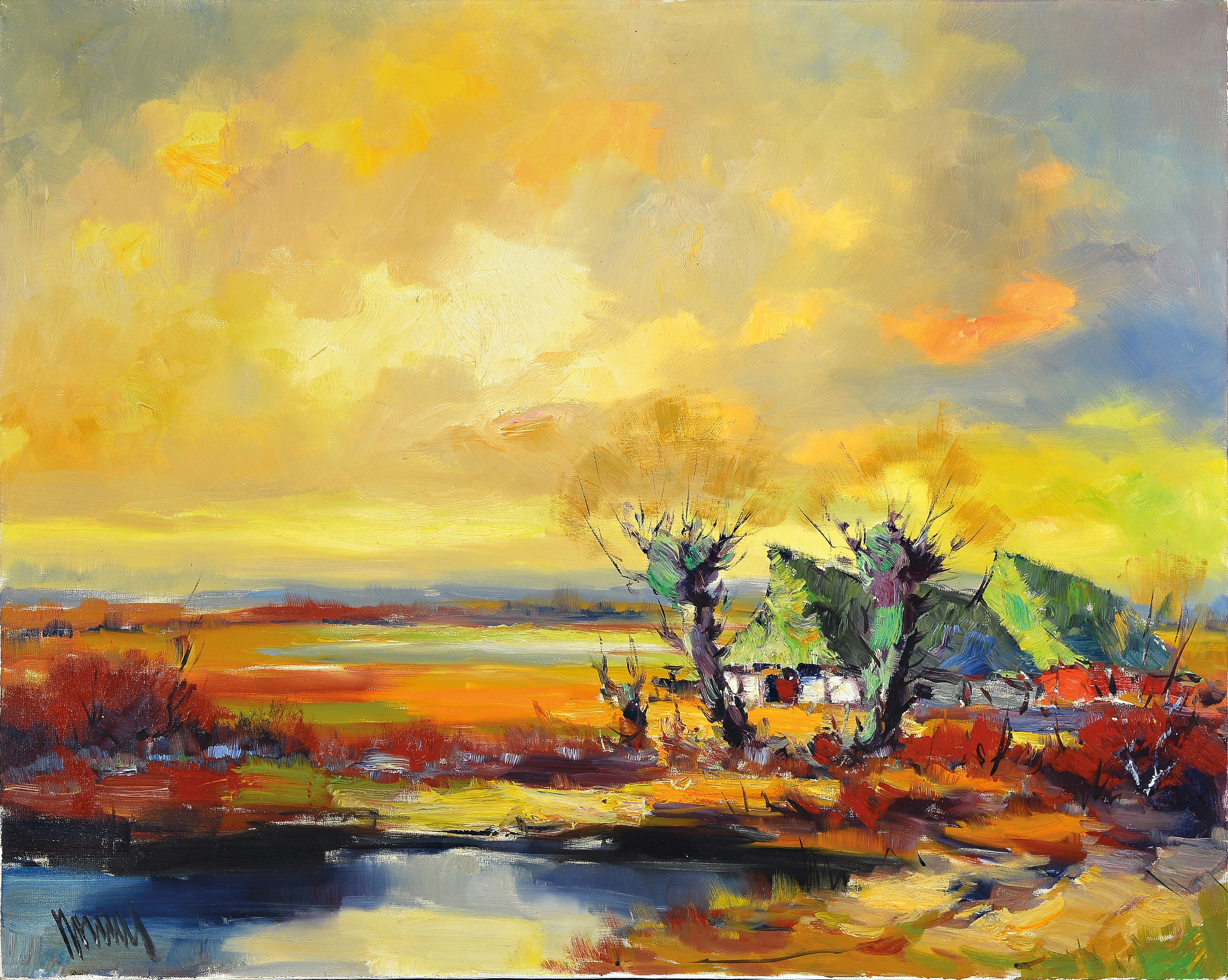 Unbekannter zeitgenössischer Künstler, Landschaft mit Bauernhaus, Öl/Lwd, links