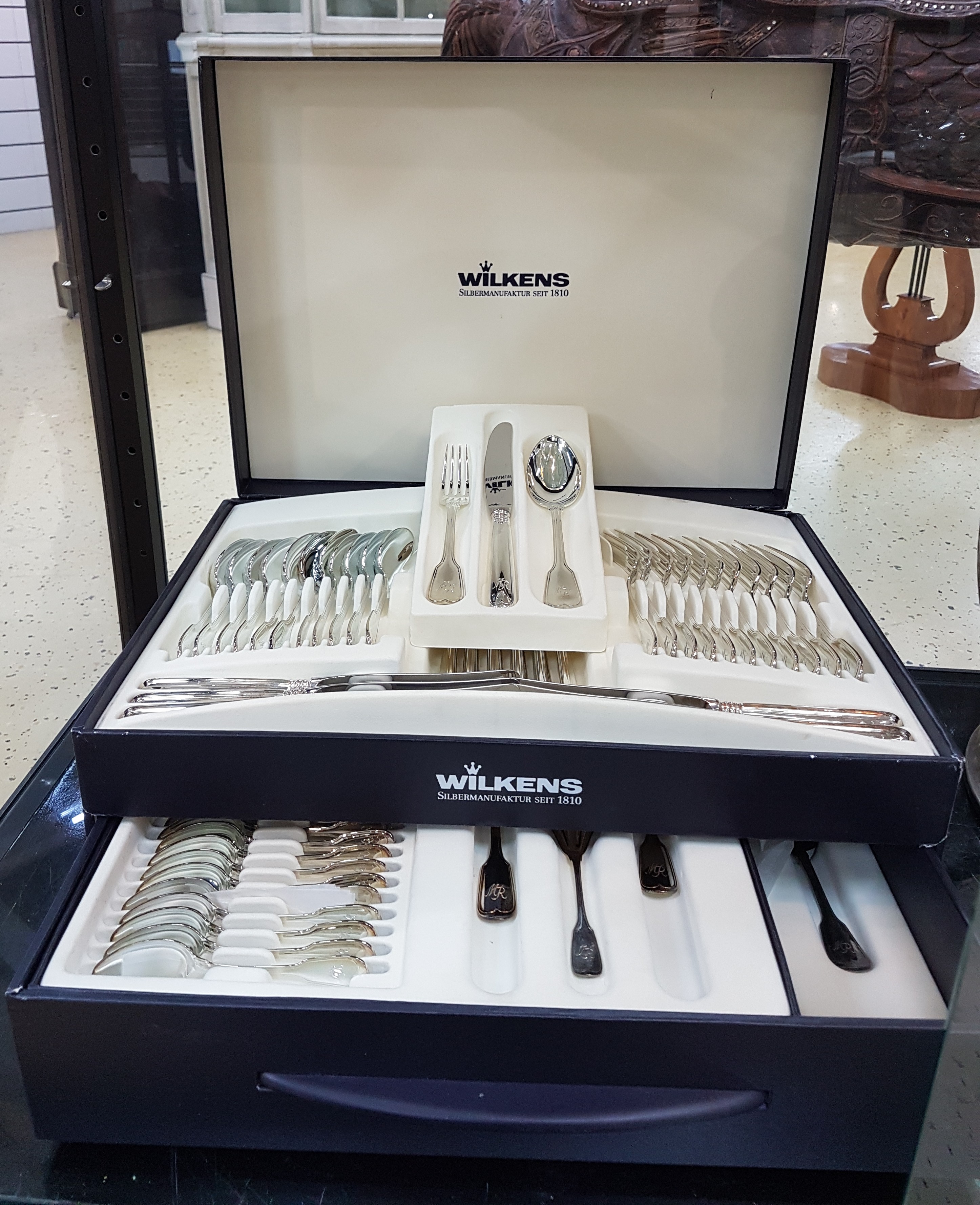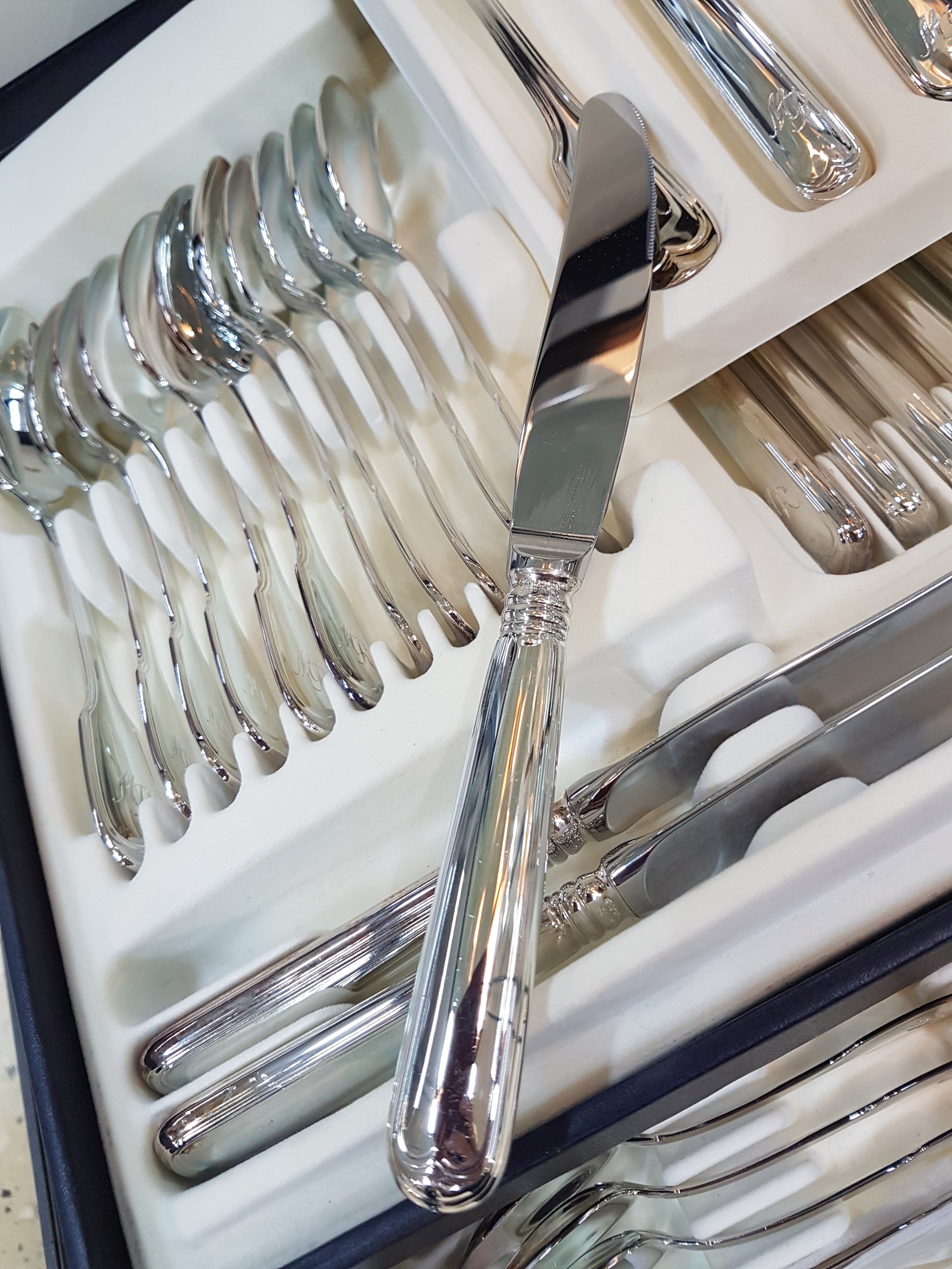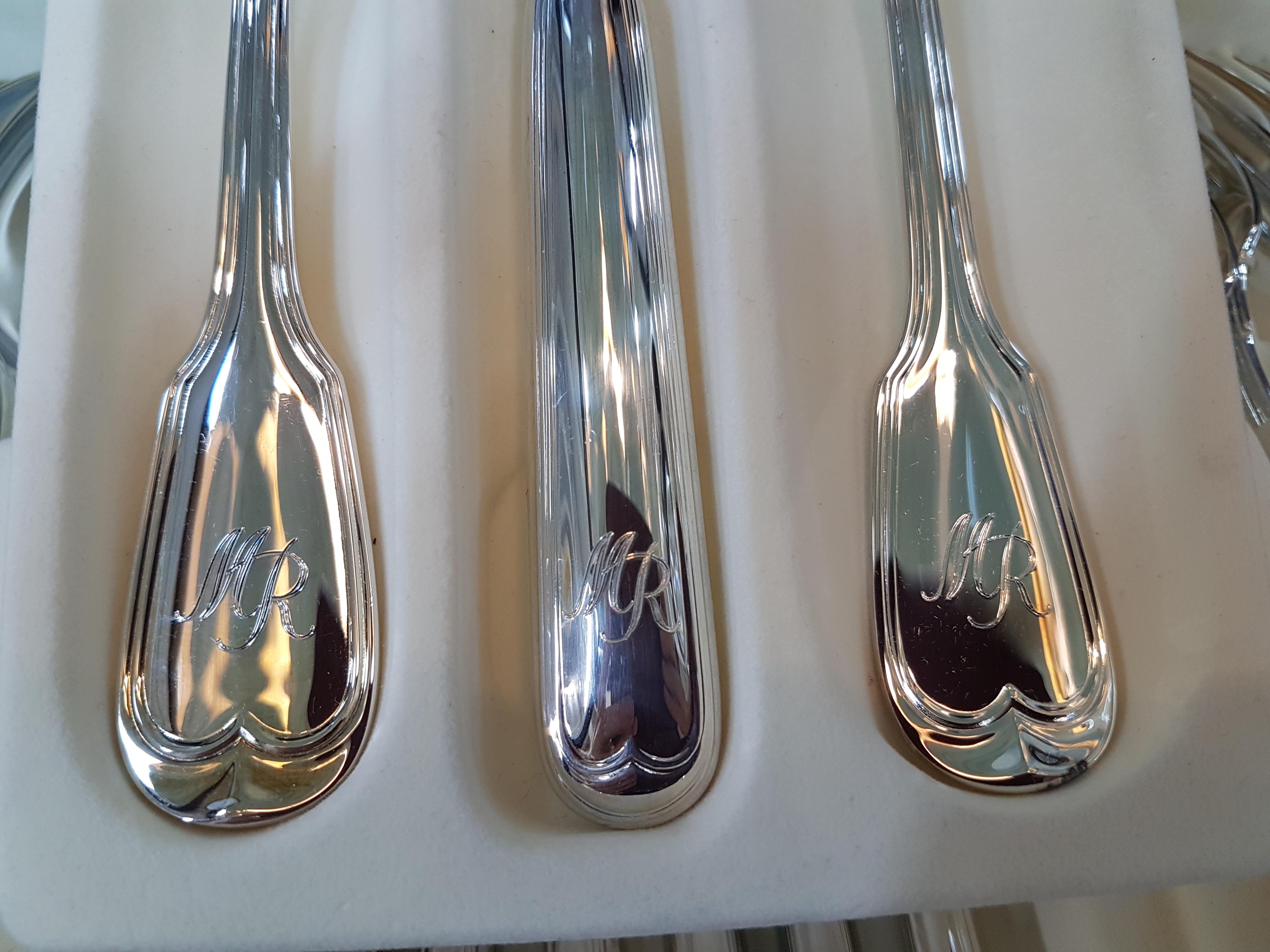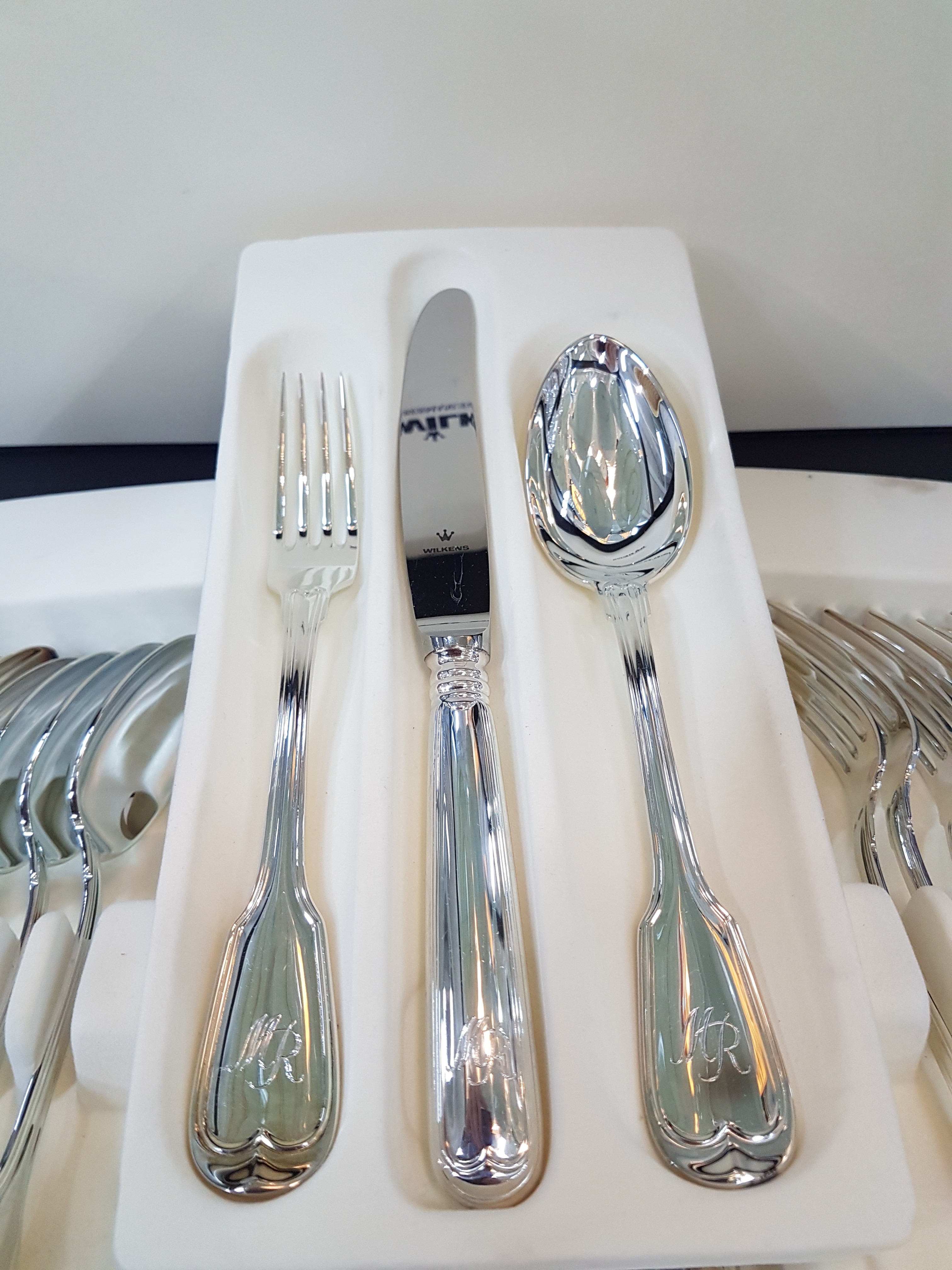 Besteck für 12 Personen, Wilkens Bremen, Modell Augsburger Faden, 925er Sterling Silber, Monogramm MR, 12 Messer, 12 Gabeln, 12 Löffel, 12 Kaffeelöffel, 12 Kuchengabeln, Suppenkelle, Soßenkelle, Tortenheber, 2 tlg. Salatbesteck, 2 Fleischgabeln, 2 Gemüselöffel,Sahnelöffel, Zuckerlöffel, Gesamtgewicht ca. 4964 g., Gewicht ohne Messer 3759 g., in orig. Kasten, nahezu unbenutzt