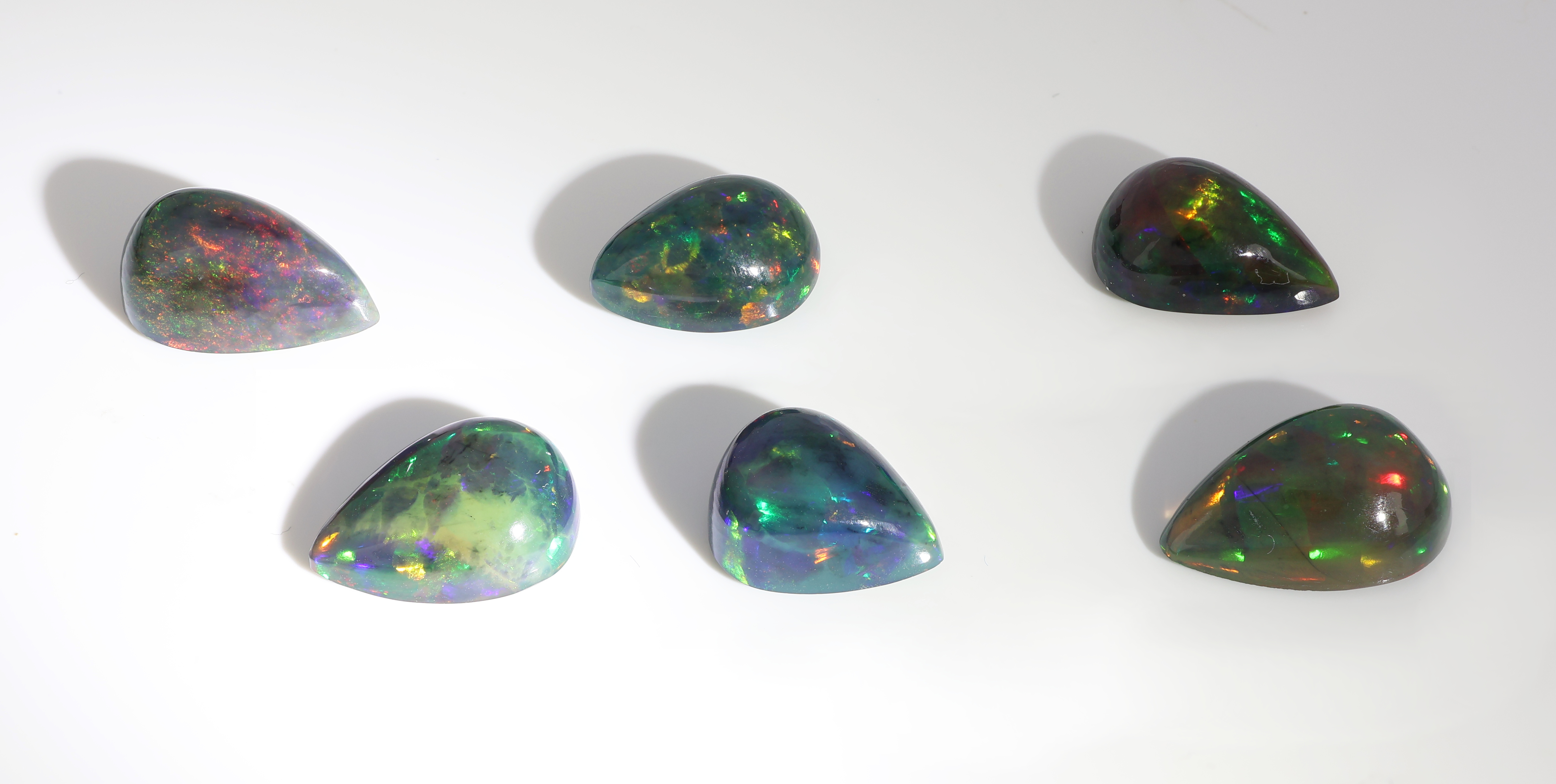 Lot 6 lose schwarze Opale, zus. ca. 17.95 ct, tropfenf. Cabochons in versch. Größen, intensives Farbspiel in Grün, Rot und Blau Schätzpreis: 2100, - EUR