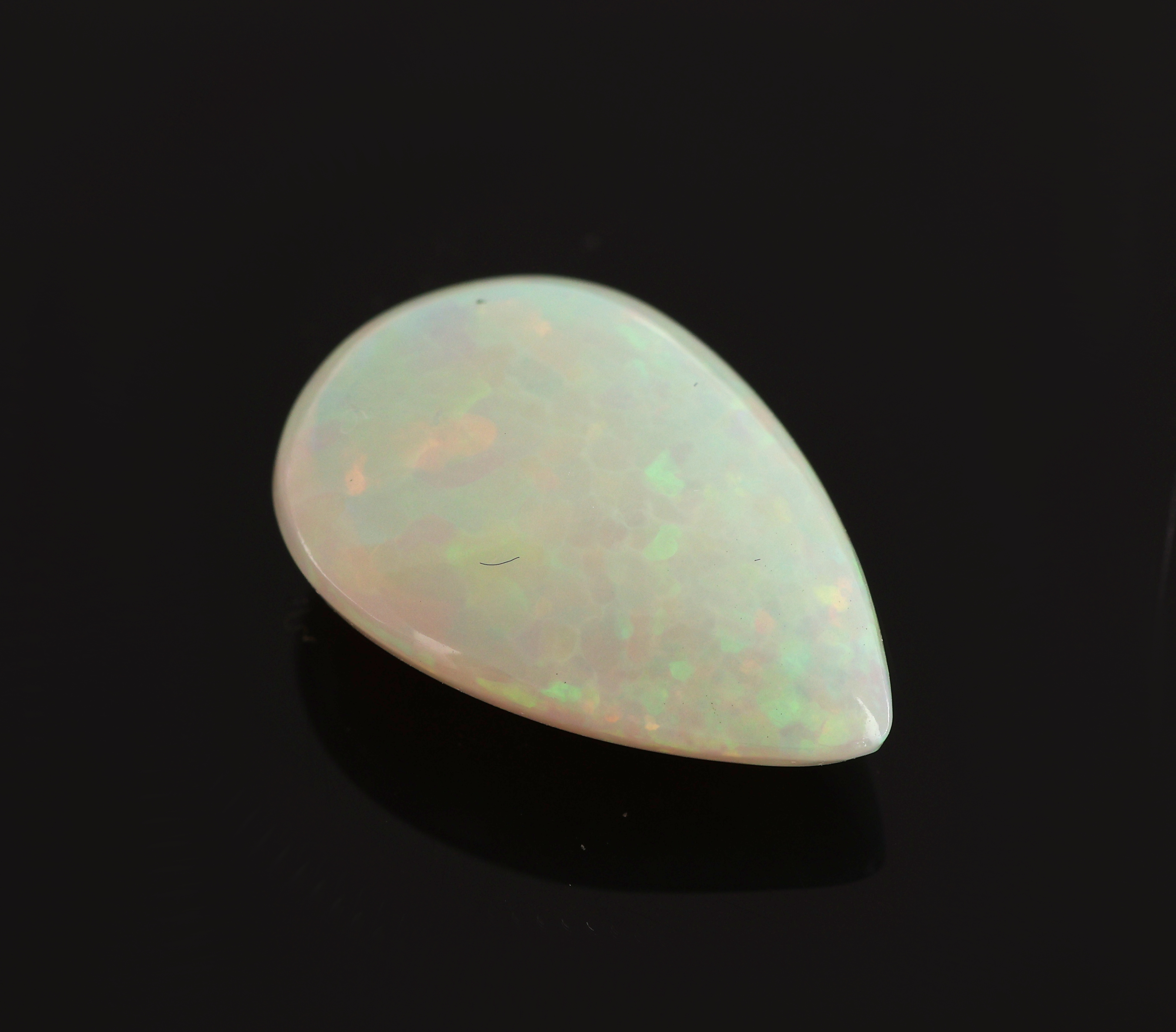 Loser weißer Opal, ca. 5.87 ct, tropfenf. Cabochon, Farbspiel in Grün, Blau und