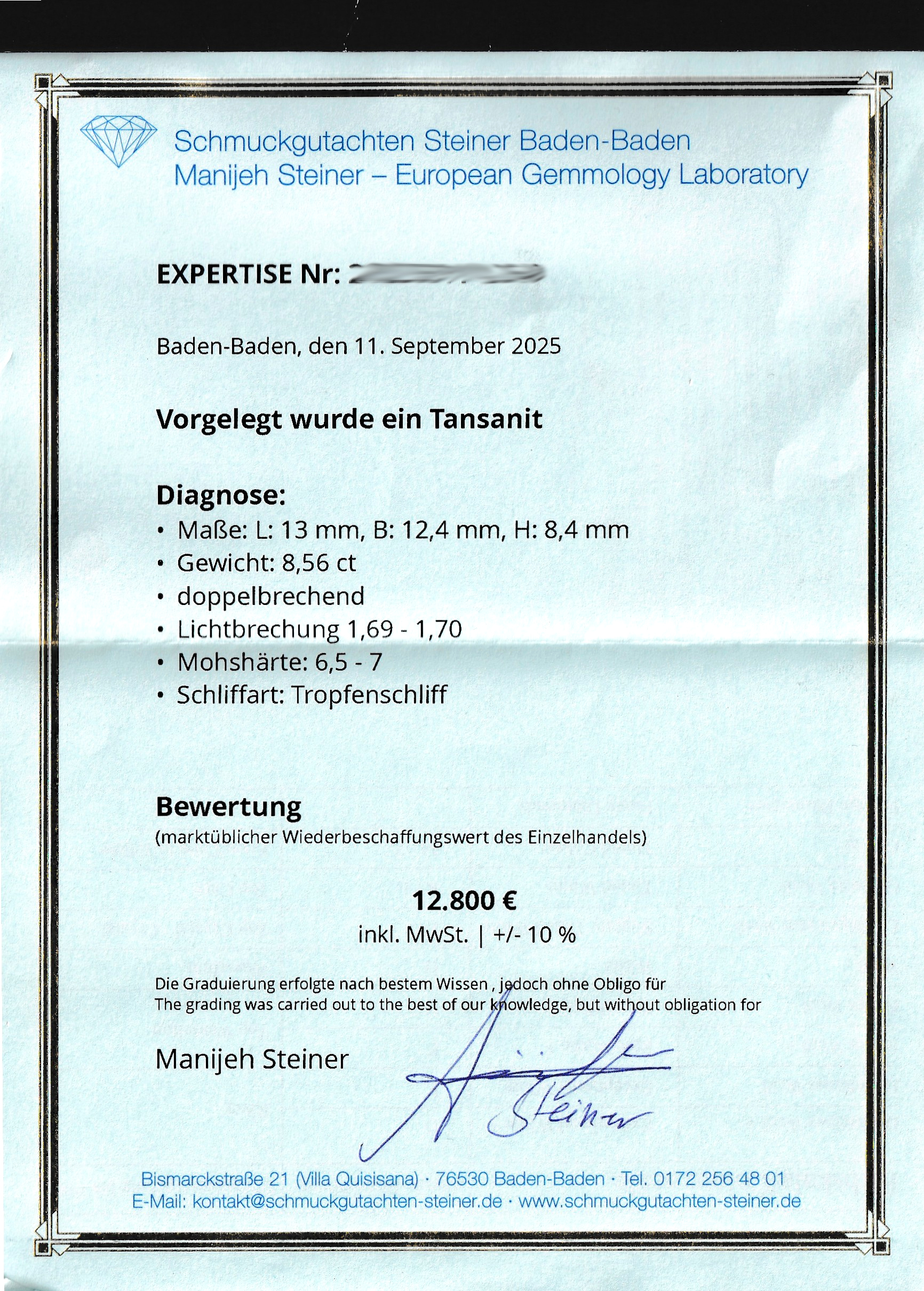 Loser Tansanit, ca. 8.55 ct, facett. Tropfen, sehr schöne Farbe, ca. 12.97 x 12.36 x 8.39 mm, Wertgutachten über 12800 EUR anbei