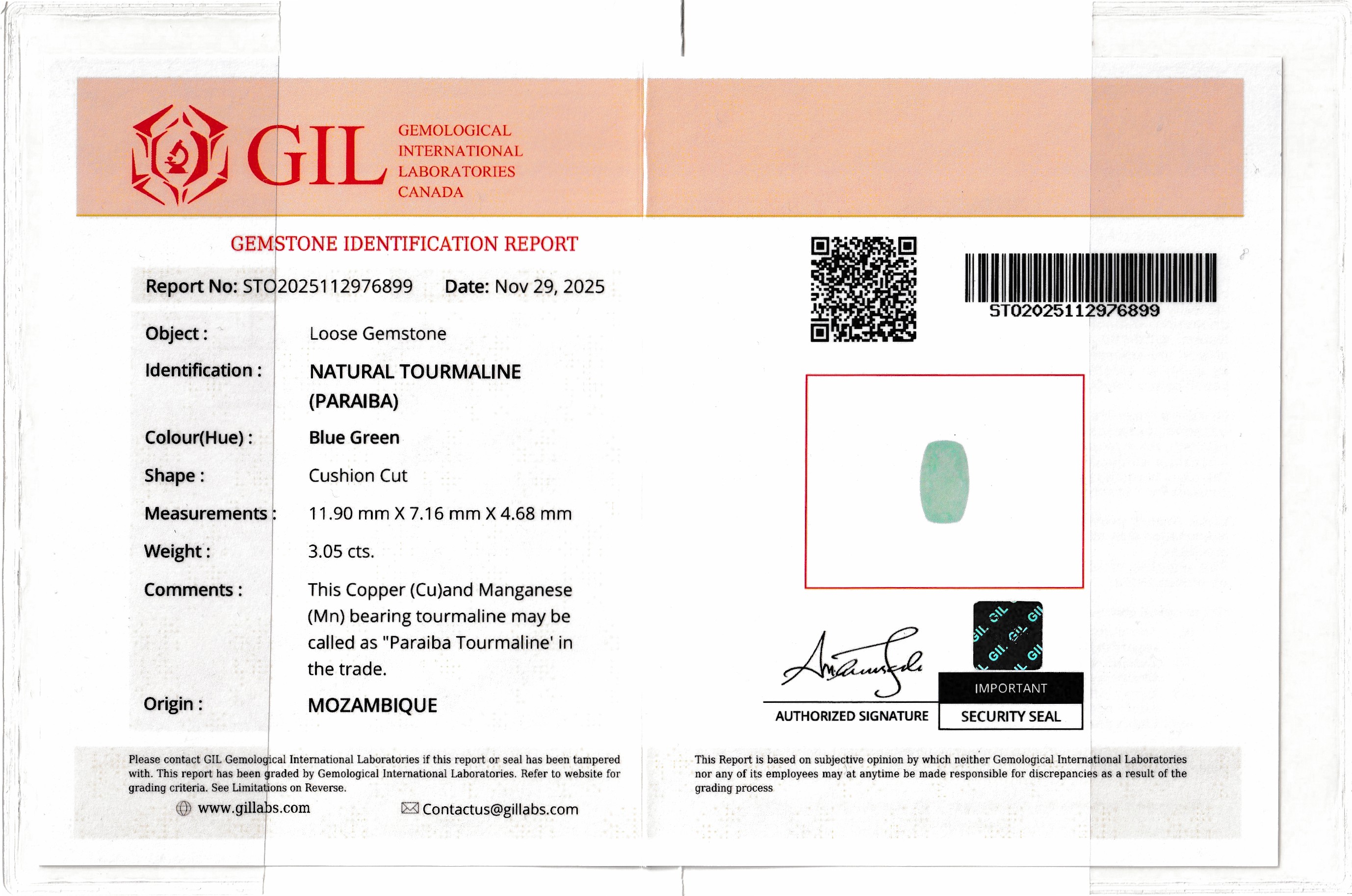 Loser Turmalin, ca. 3.05 ct, Cushion Cut, ca. 11.90 x 7.16 x 4.68 mm, Herkunft Mosambik, GIL-Expertise anbei Schätzpreis: 1400, - EUR
