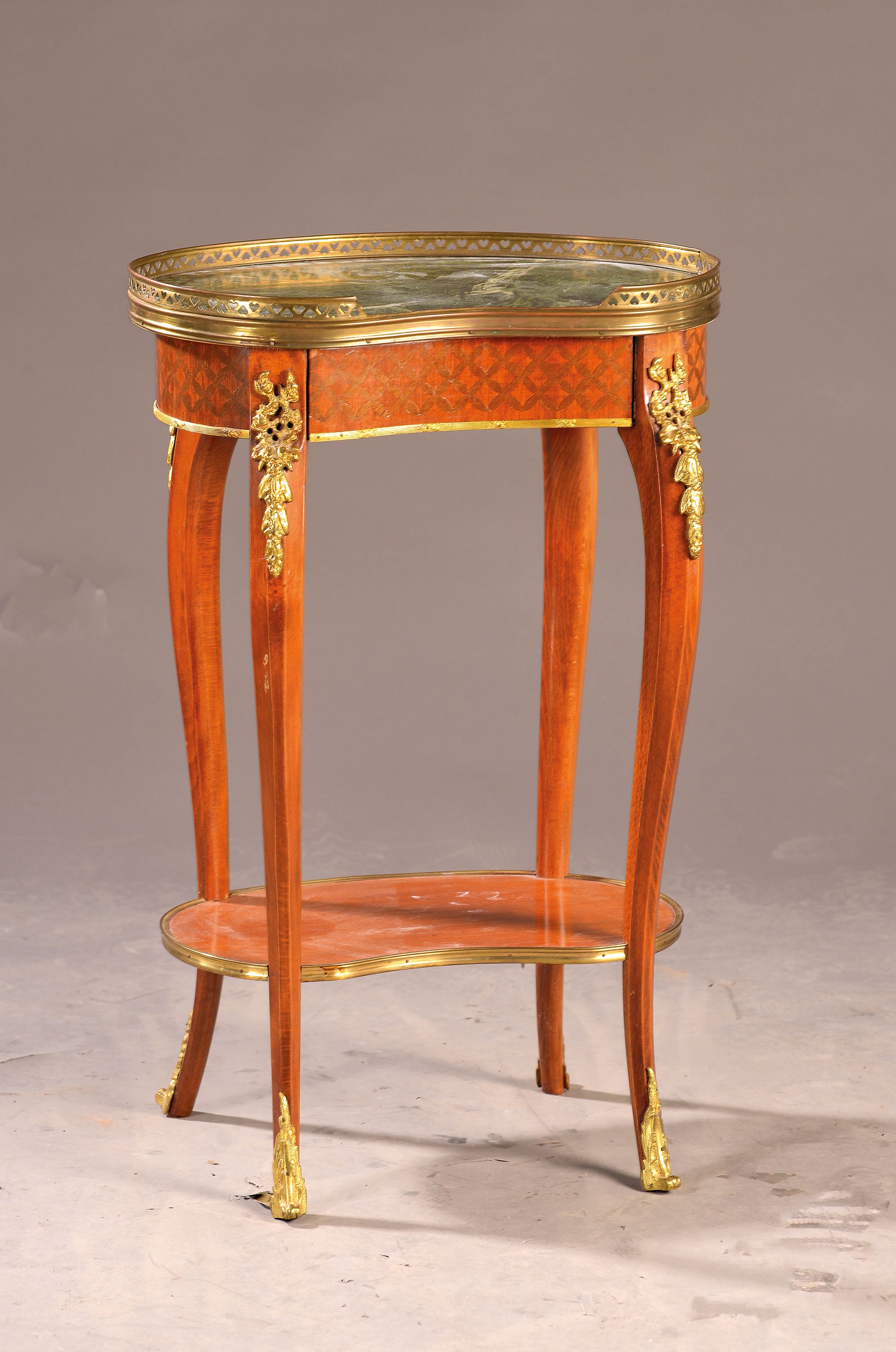 Etagere table, France, around 1900, walnut veneer, brass gallery, embedded marble