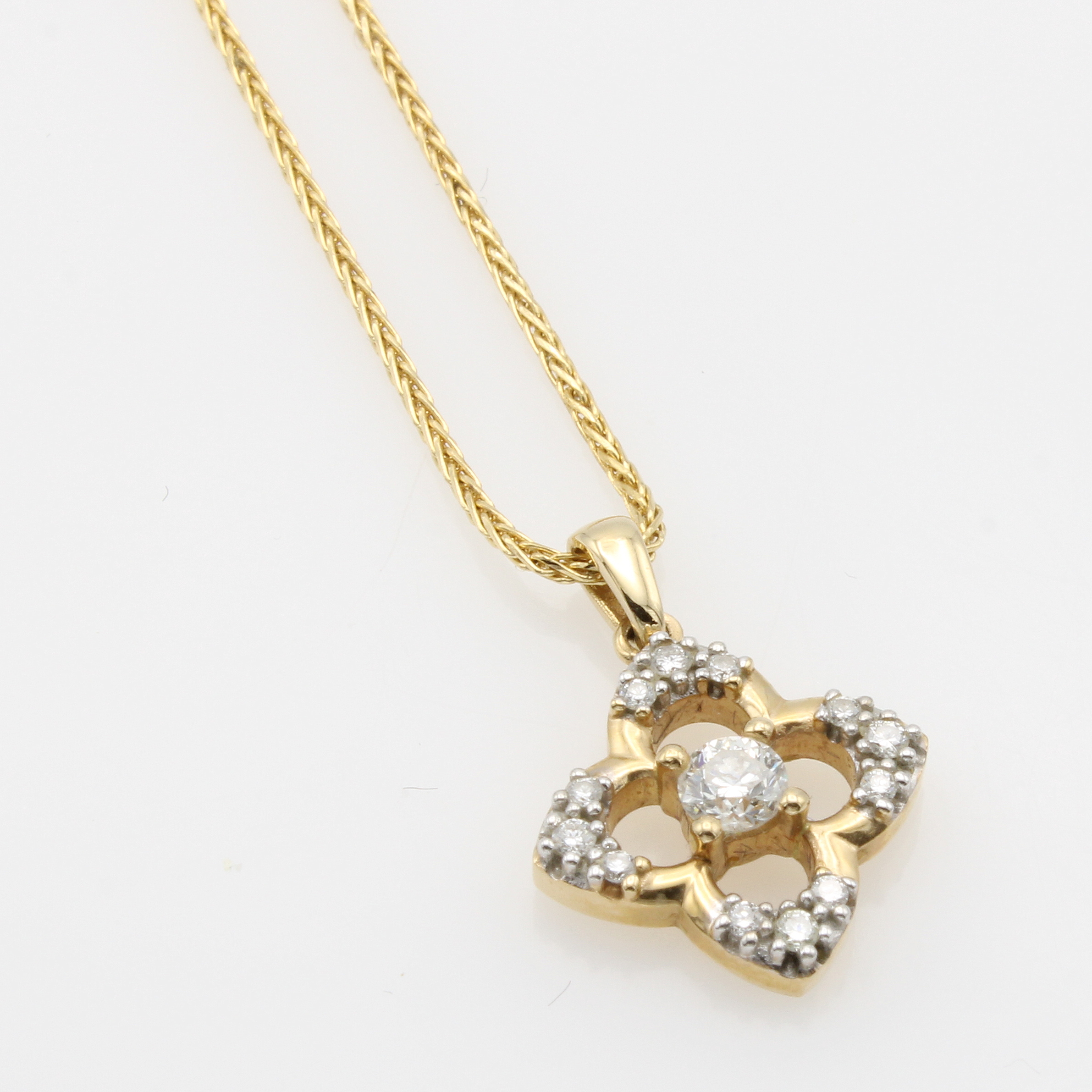 Anhänger mit Brillanten an Kette, GG 585/000, anged. Blütenform, Brill. zus. ca. 0.20 ct Weiß/p, in L. ca. 47 u. 50 cm zu tragen Schätzpreis: 1470, - EUR