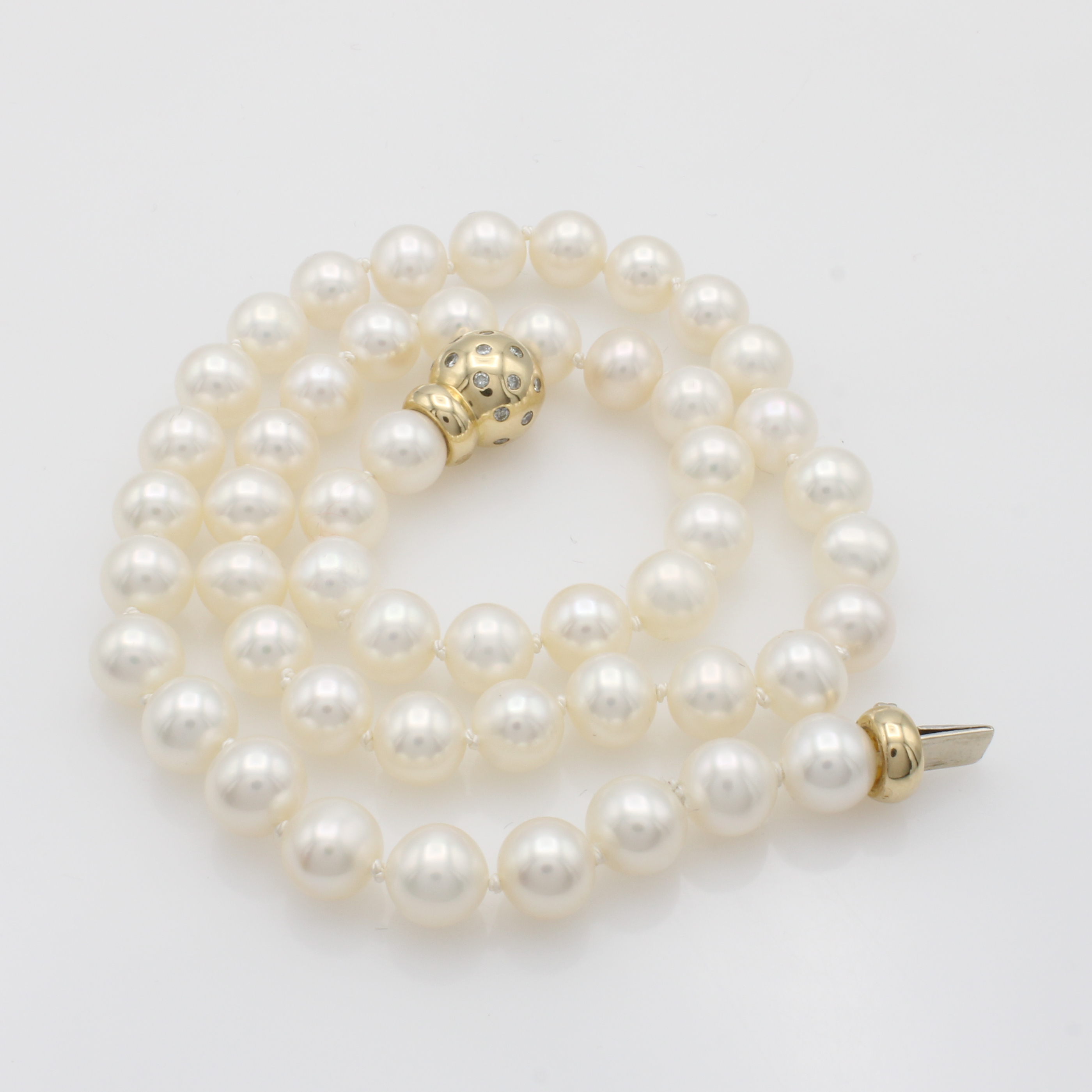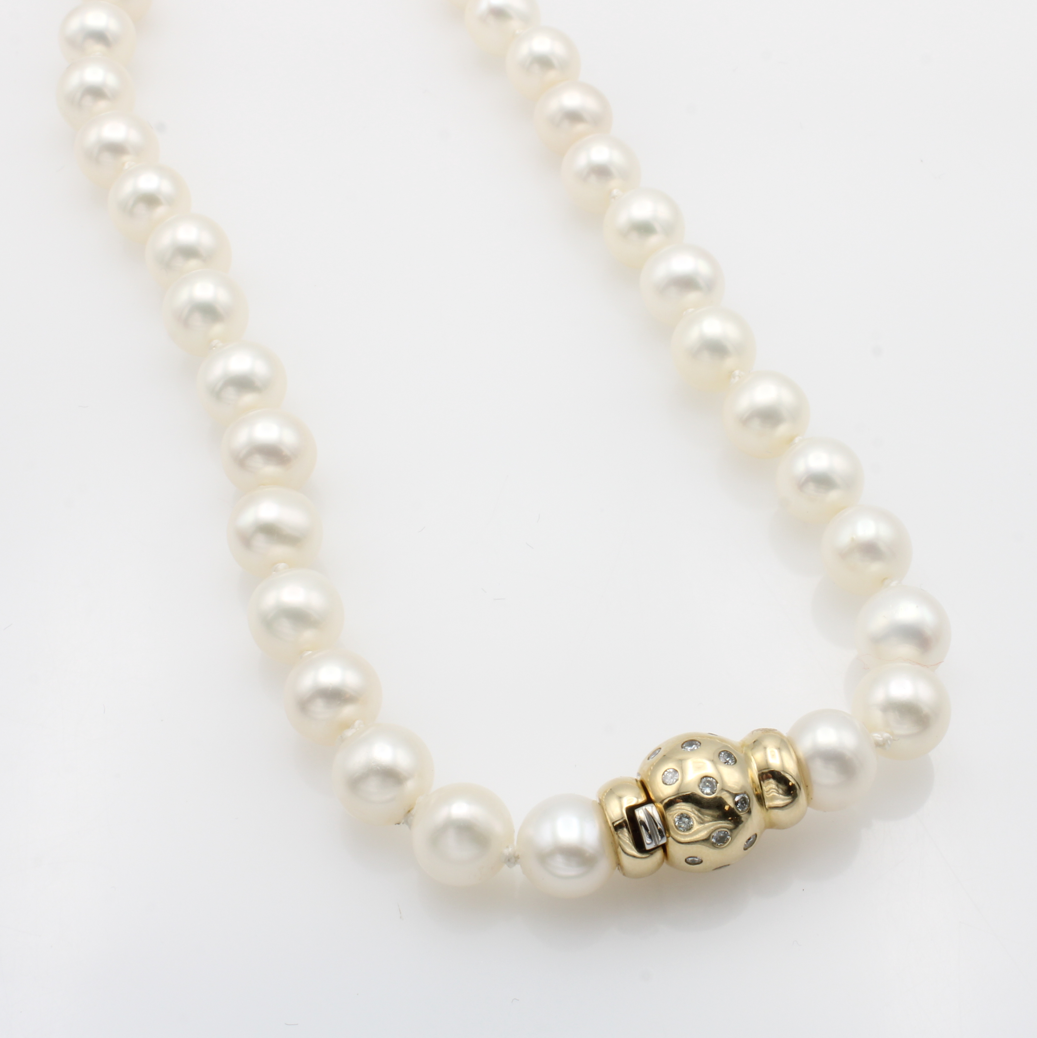 Brillantschließe an Süßwasserzuchtperlenkette, GG 585/000, Brill. verstreut gef. zus. ca. 0.50 ct Weiß/p, weiße Perlen ca. 8-8.5 mm. L. ca. 46 cm Schätzpreis: 4160, - EUR