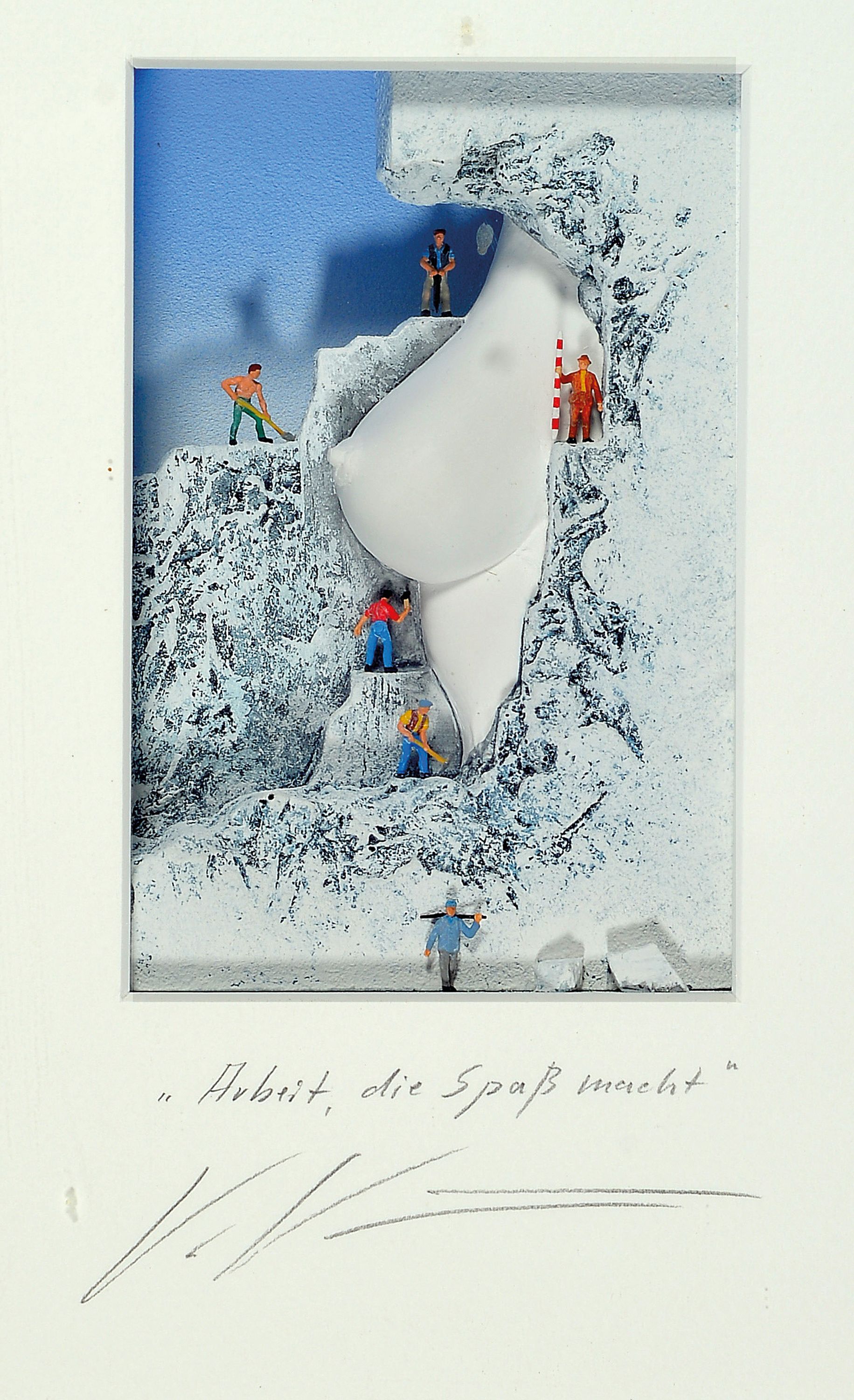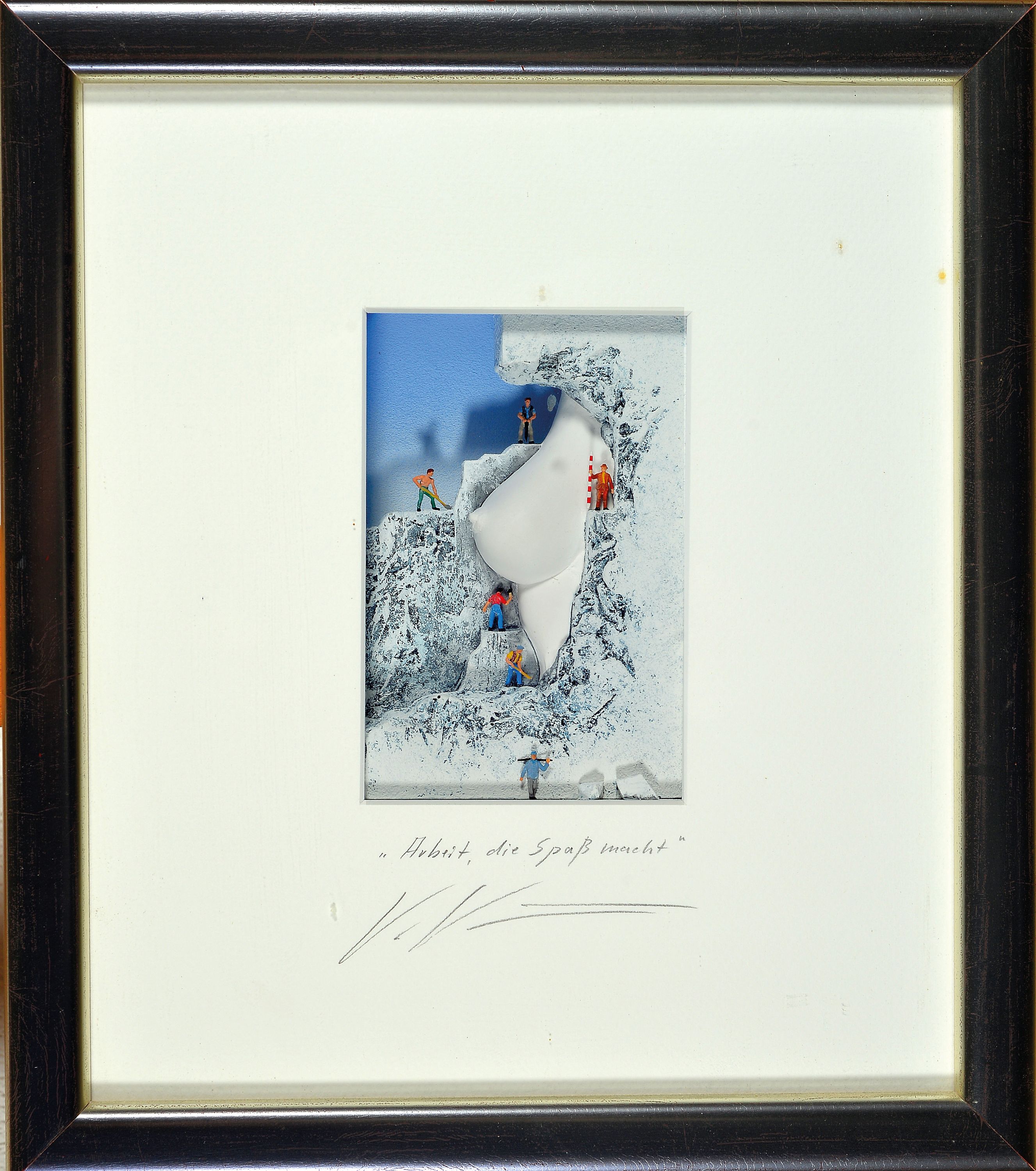 Volker Kühn, geb. 1948, "Arbeit, die Spaß macht", 3D-Objekt im Objektkasten hinter