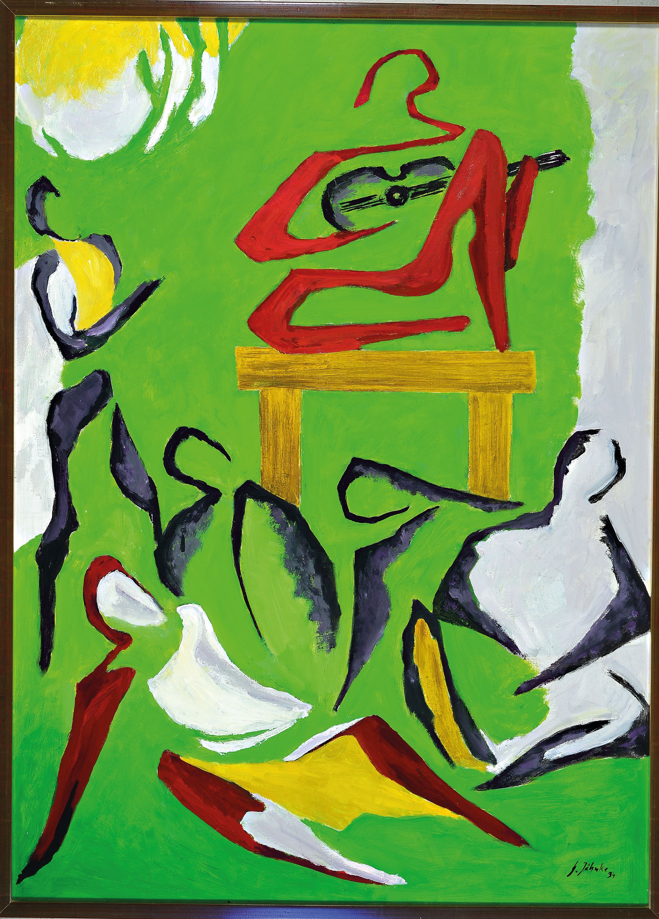 Gerd Jähnke, 1921-2005, Figurenkomposition auf grünem Grund, rechts unten signiert und datiert 1994, Öl/Lwd, Rahmen 113x82 cm