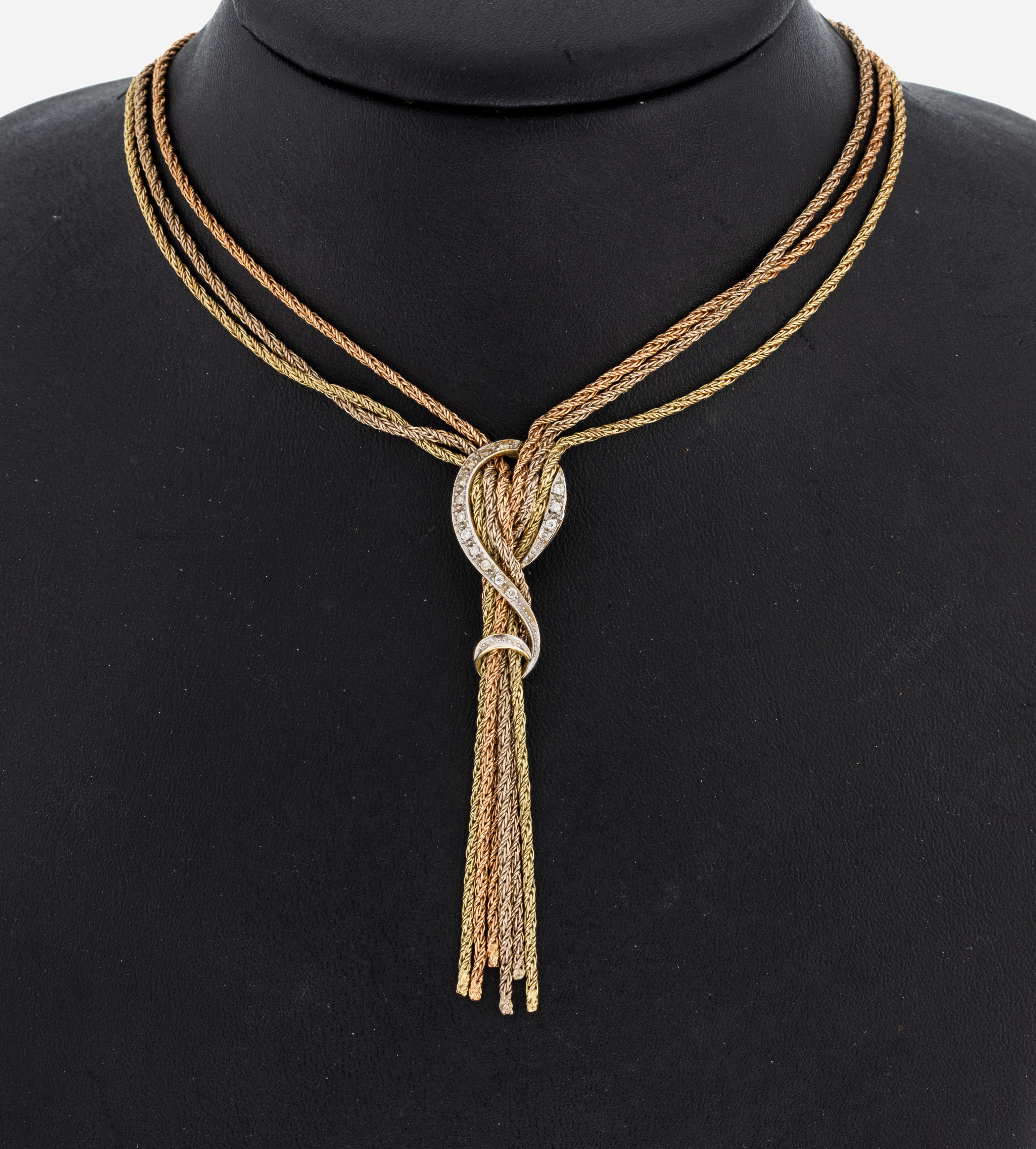 14 kt Gold Diamant-Collier, GG/WG/RG 585/000, sogn. Y-Collier, Mittelteil mit 8/8-