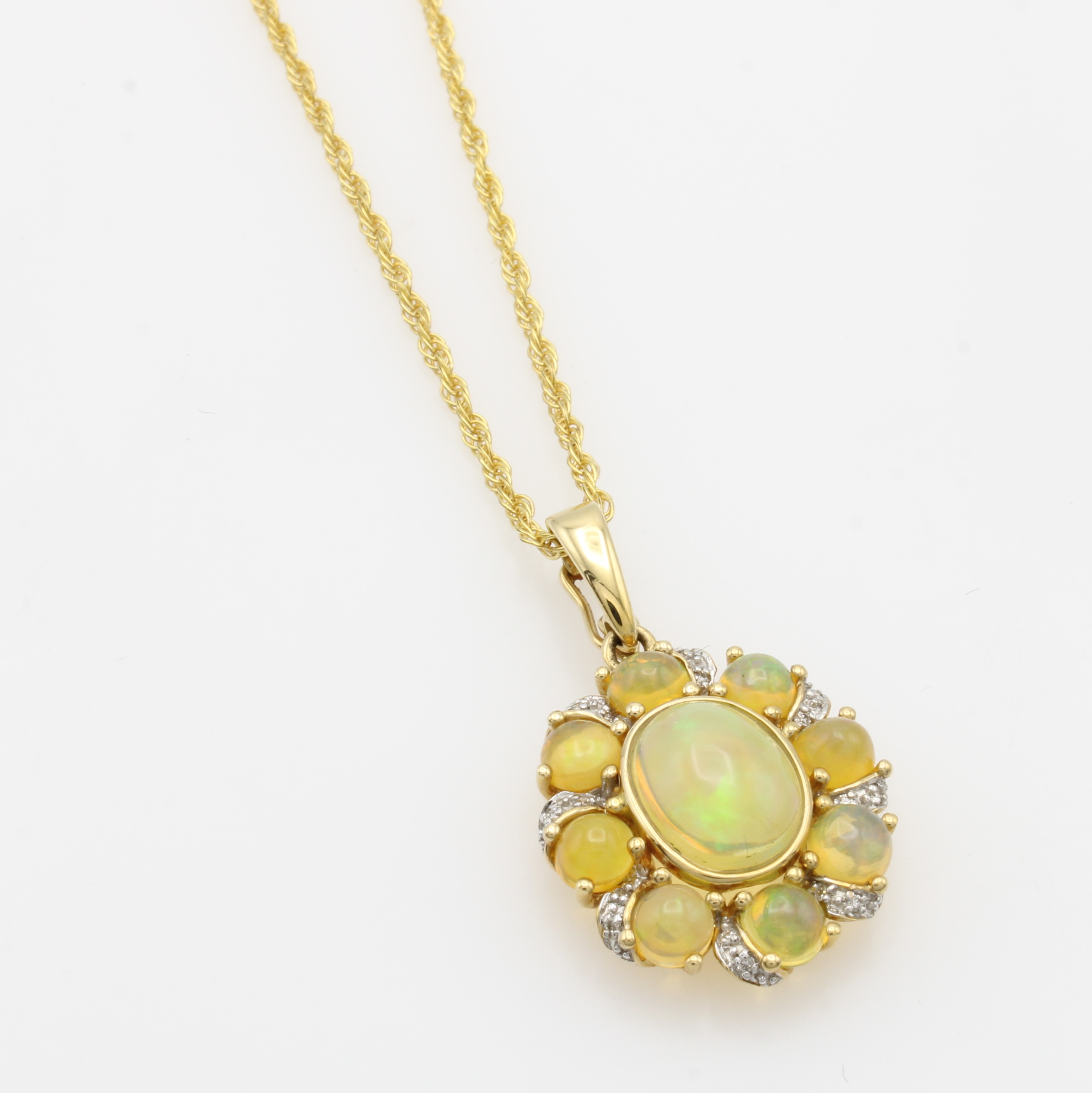 Anhänger mit Opalen und Brillanten an Kette, GG 585/000, ovaler u. runde Opale, Brill. zus. ca. 0.08 ct Weiß/p, L. ca. 45 cm Schätzpreis: 1630, - EUR