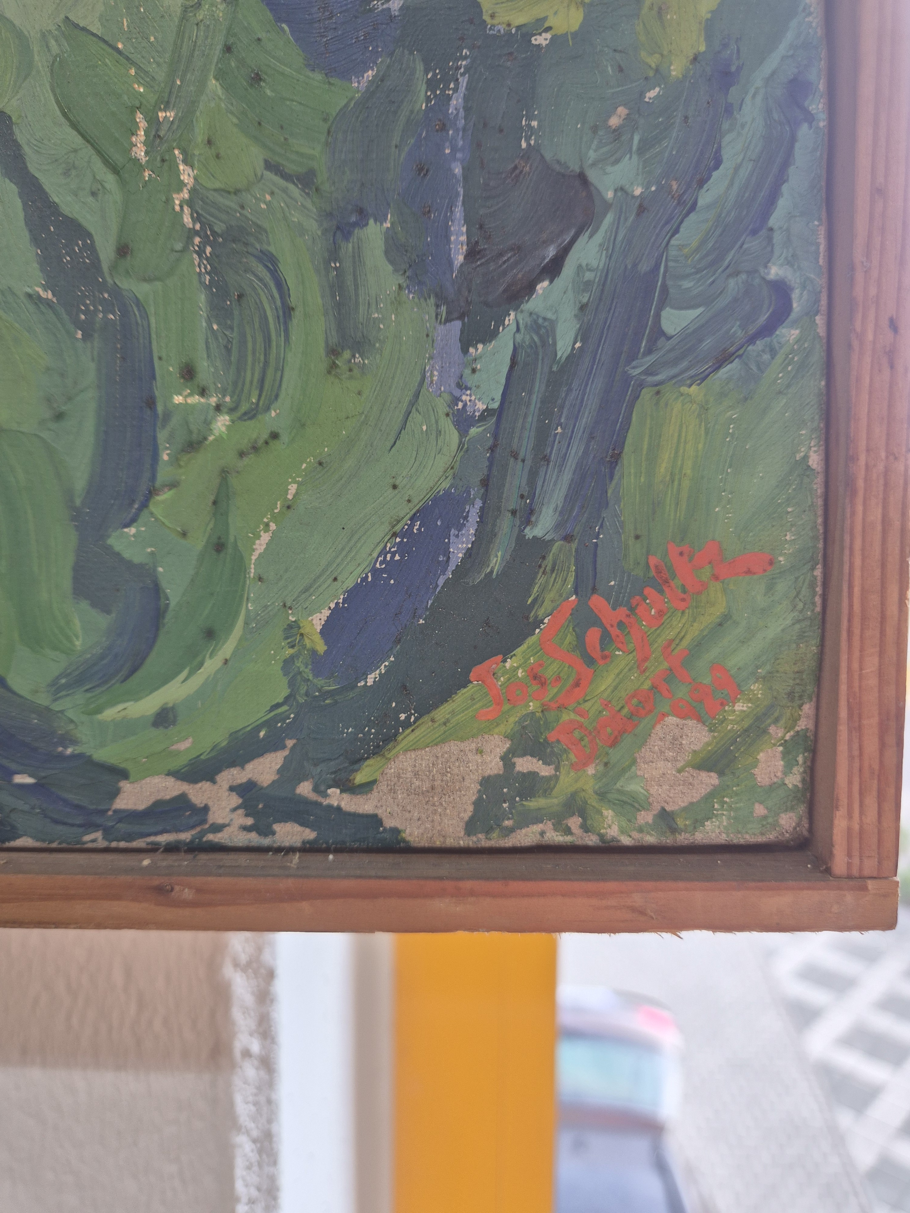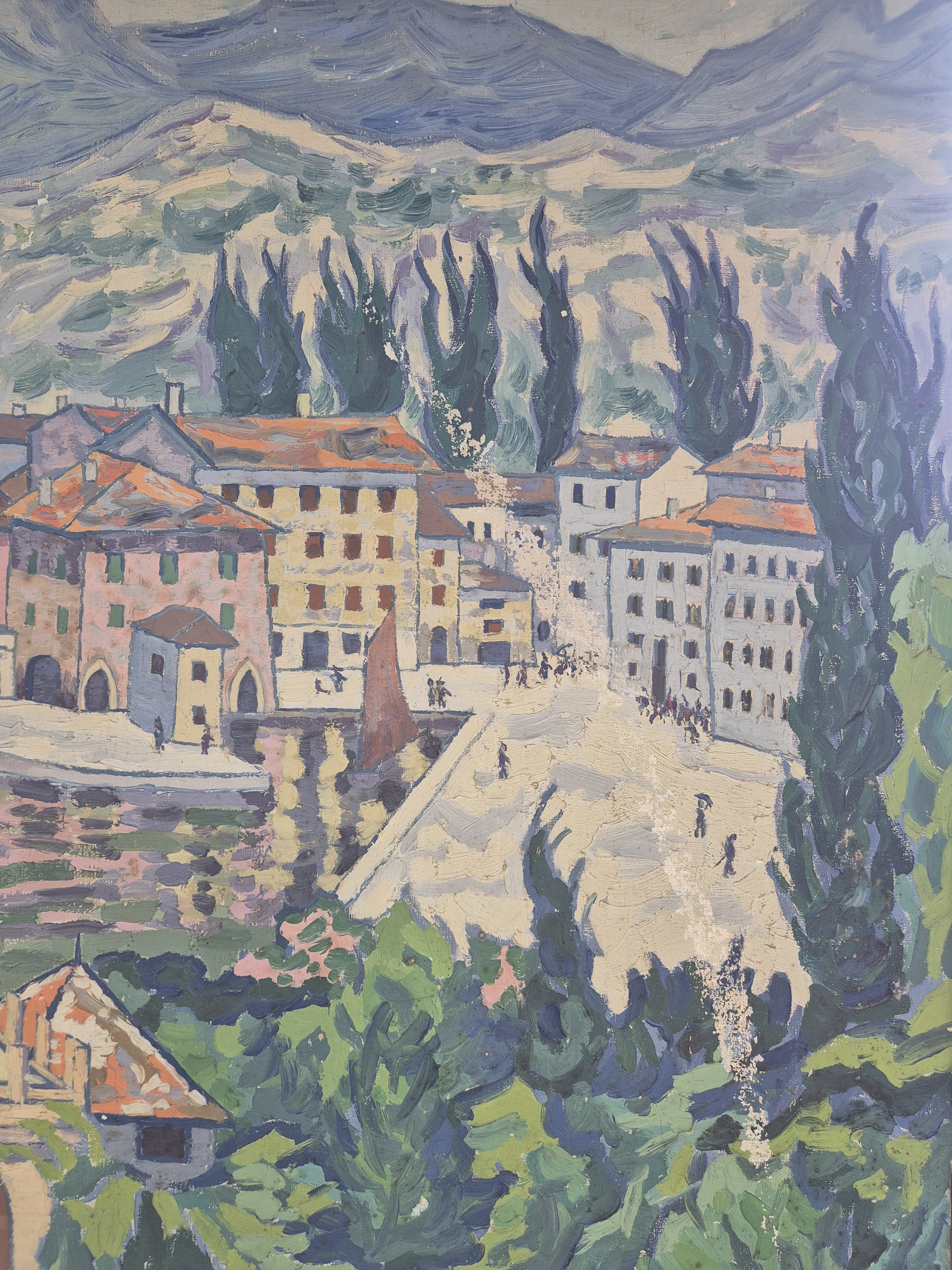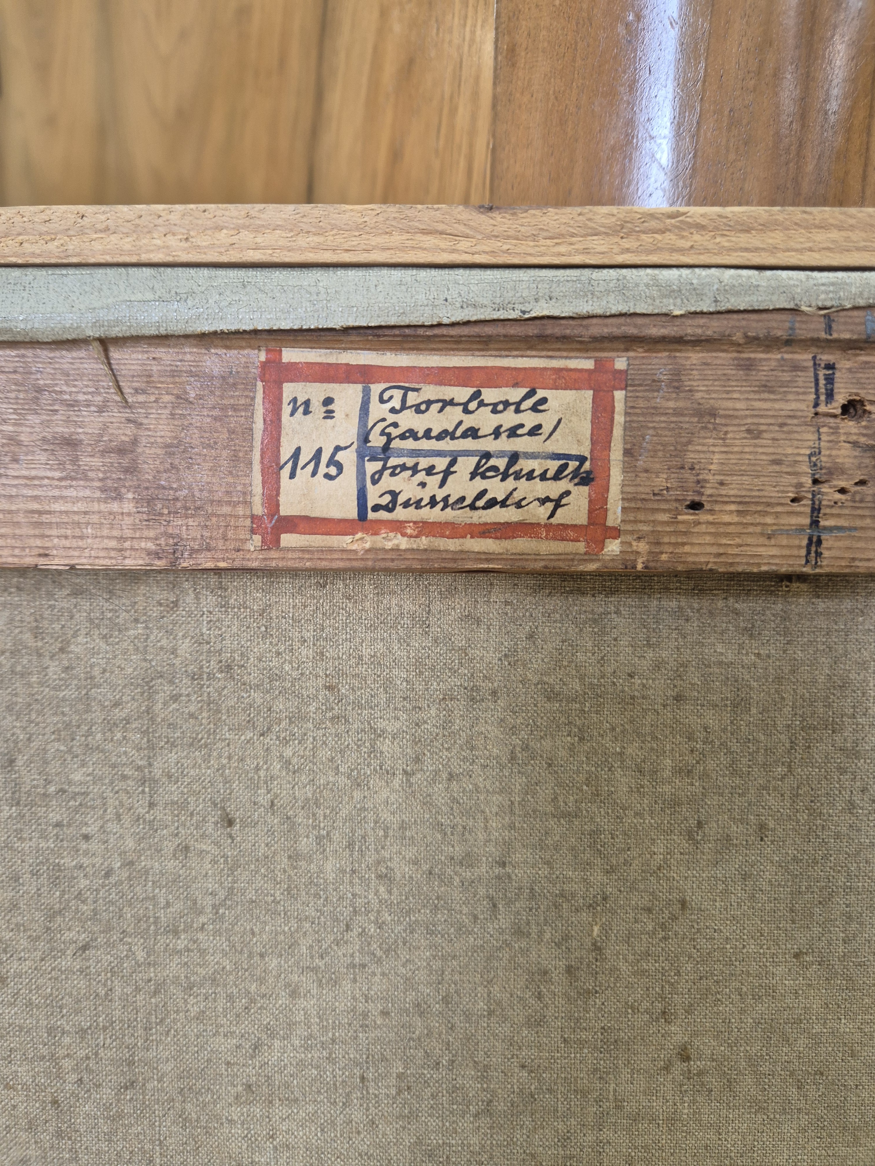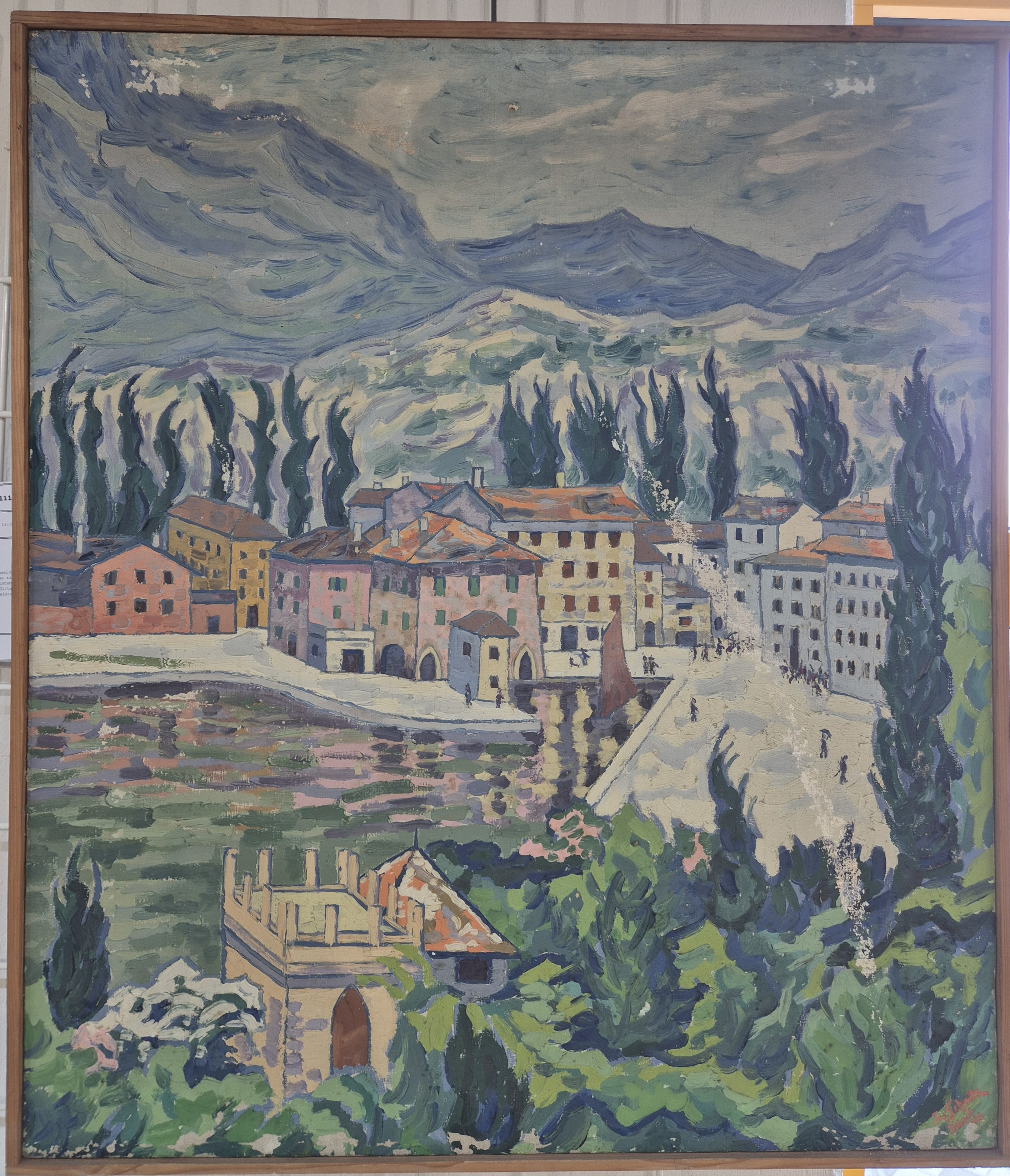 Josef Schultz, 1872-1972 Düsseldorf, "Torbole (Gardasee)" so verso auf altem Etikett bezeichnet, rechts unten signiert und datiert 1929, Öl/Lwd, stärkere Farbfehlstellen, Leistenrahmen 80x71 cm