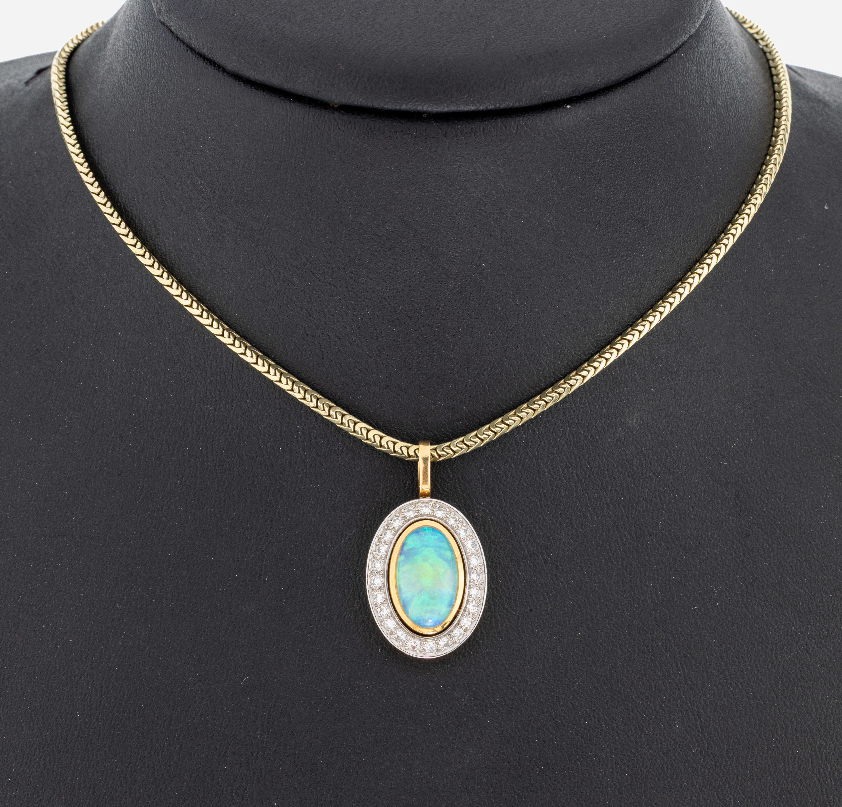 18 kt Gold Opal-Diamant-Anhänger, GG/WG 750/000, mittig mit ovalem Opalcabochon