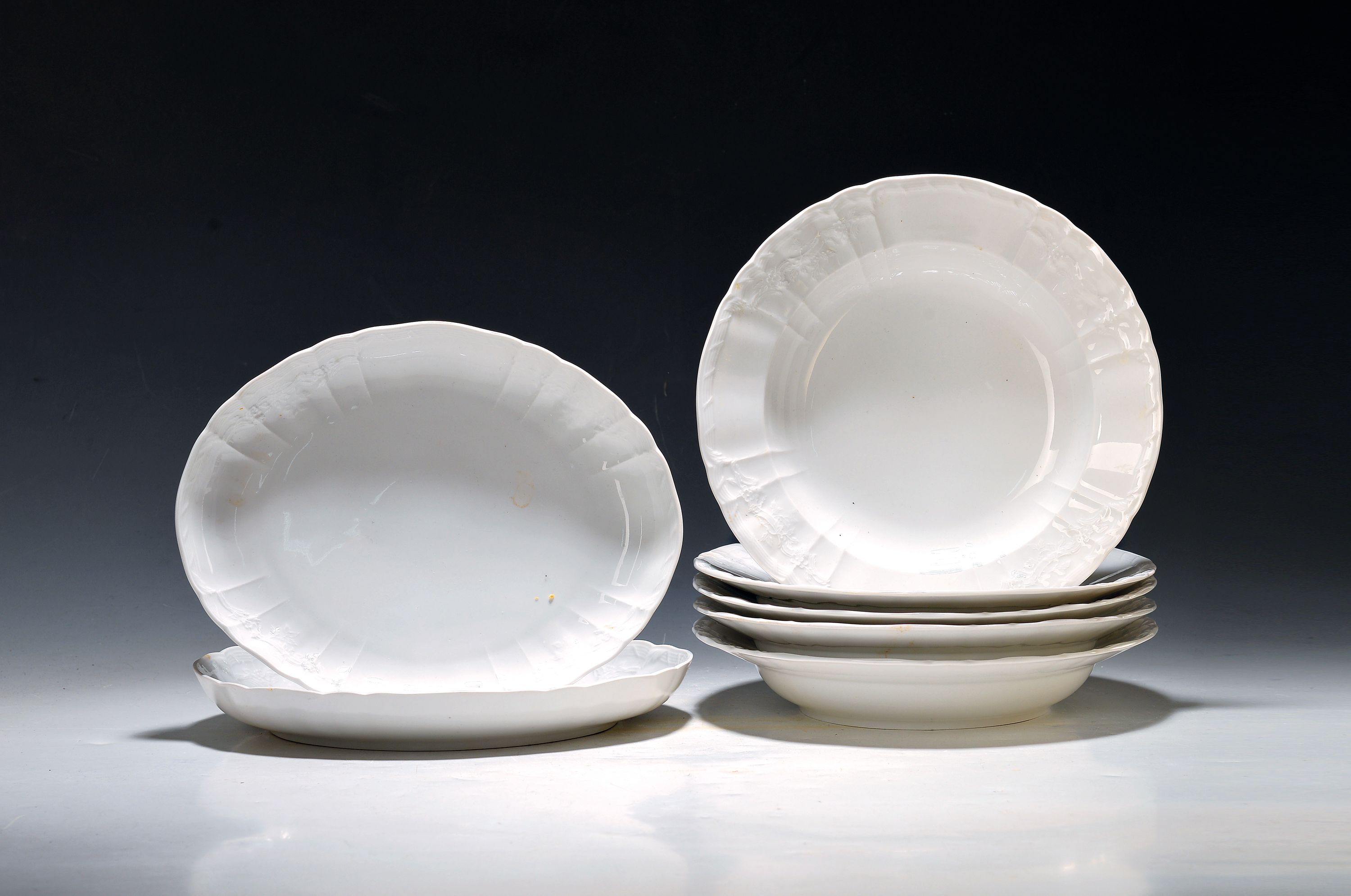 5 tiefe Teller und zwei ovale Schalen, KPM Berlin, 1960er Jahre, weiß, Rocaillenrelief,