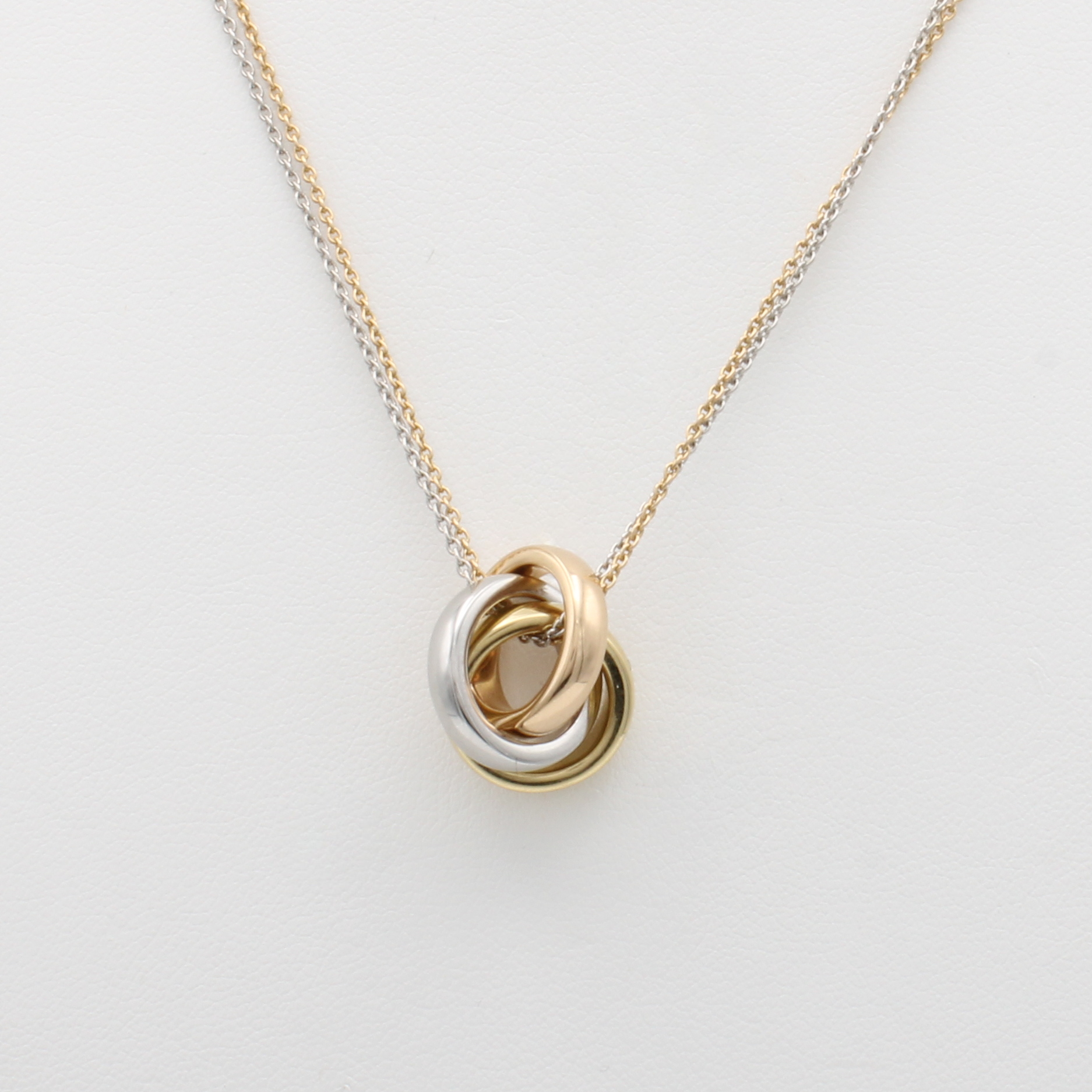 3-teiliger Anhänger an 2-reihiger Kette, RG/GG/WG 750/000, massive Ringe ineinander ver- schlungen, L. ca. 46 cm Schätzpreis: 4200, - EUR