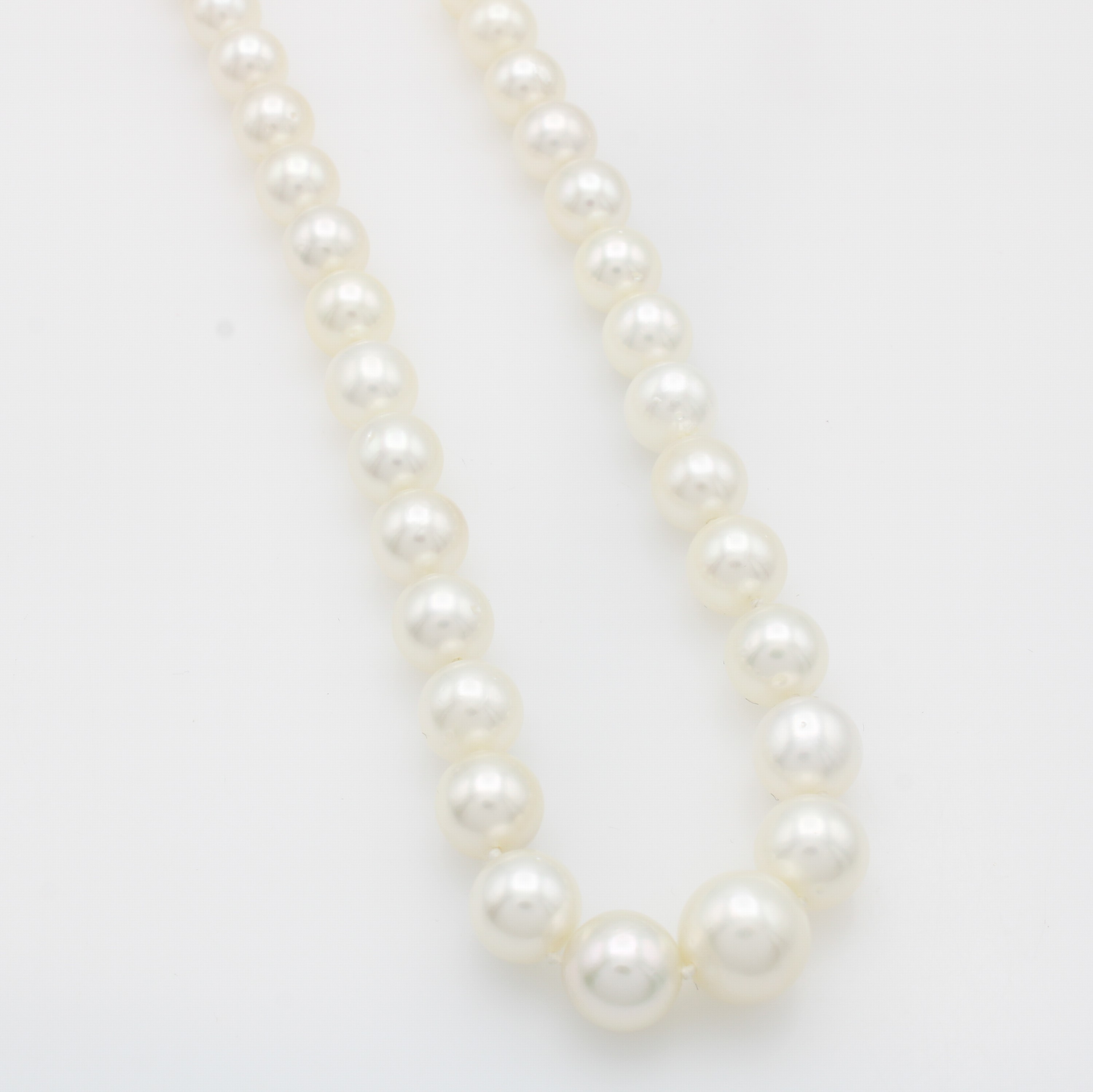 Südseeperlenkette, Kugelschl. GG 585/000, im Verlauf gearb., 51 weiße Perlen ca. 7-10 mm, L. ca. 46 cm Schätzpreis: 3800, - EUR