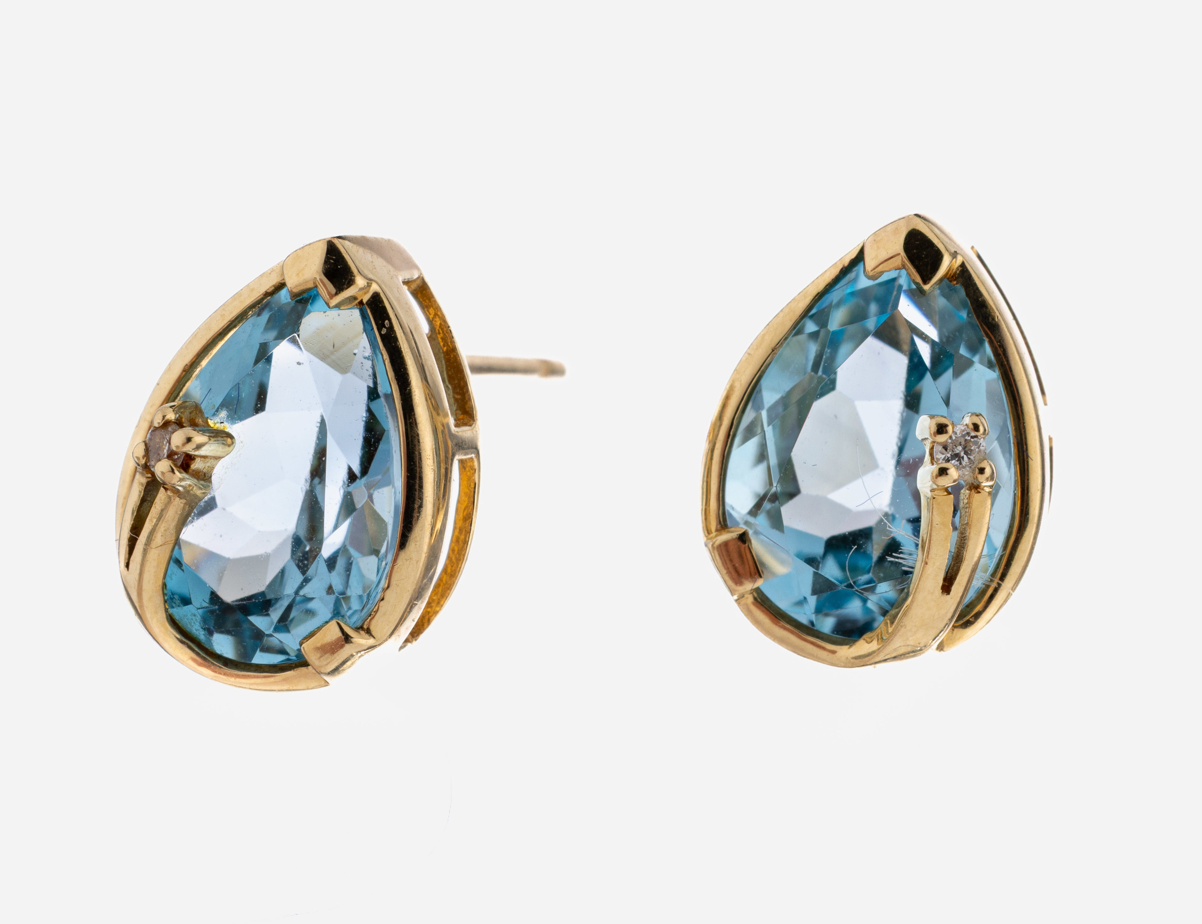 Pair of 14 kt gold topaz-diamond-earrings , YG 585/000, 2 bevelled blue topaz pears