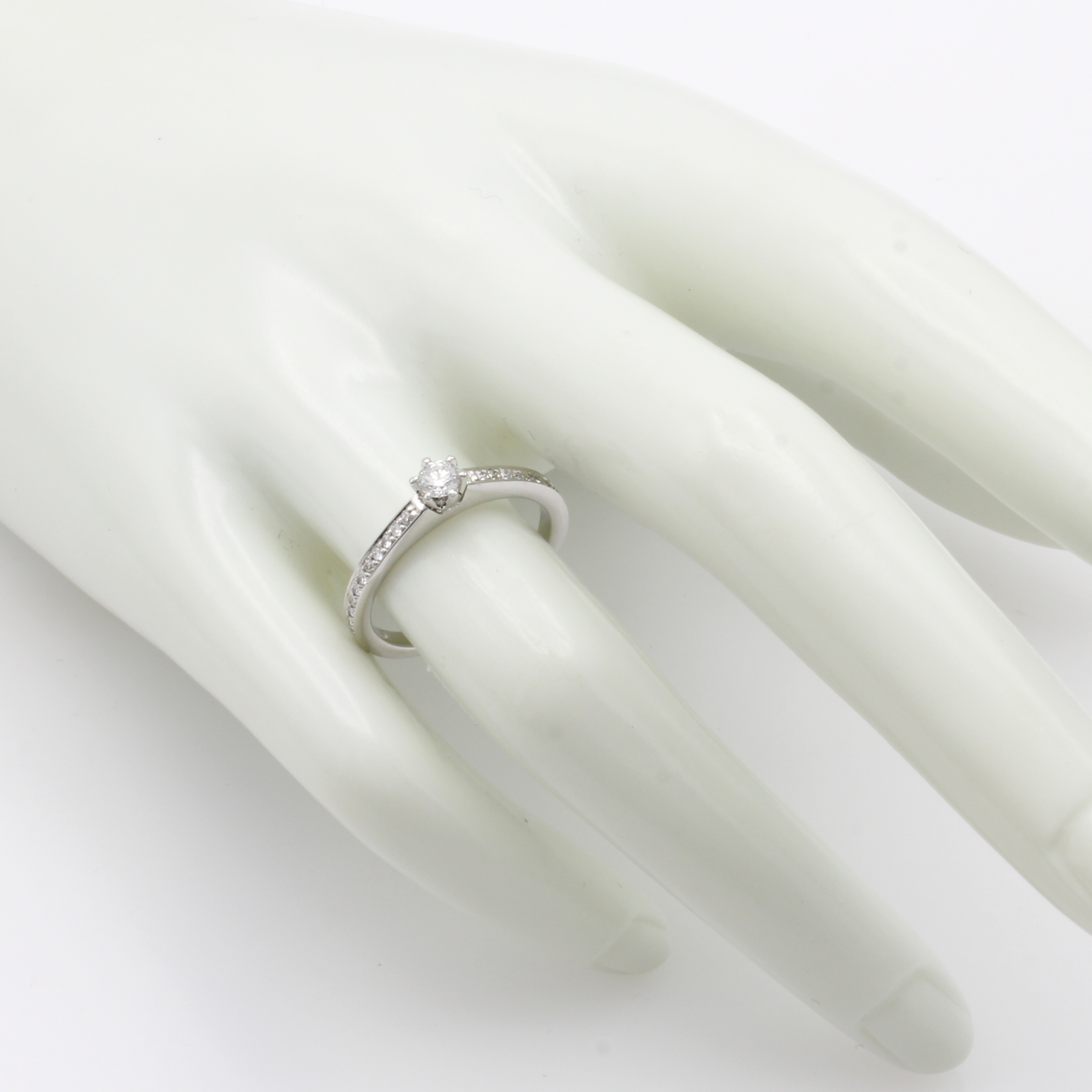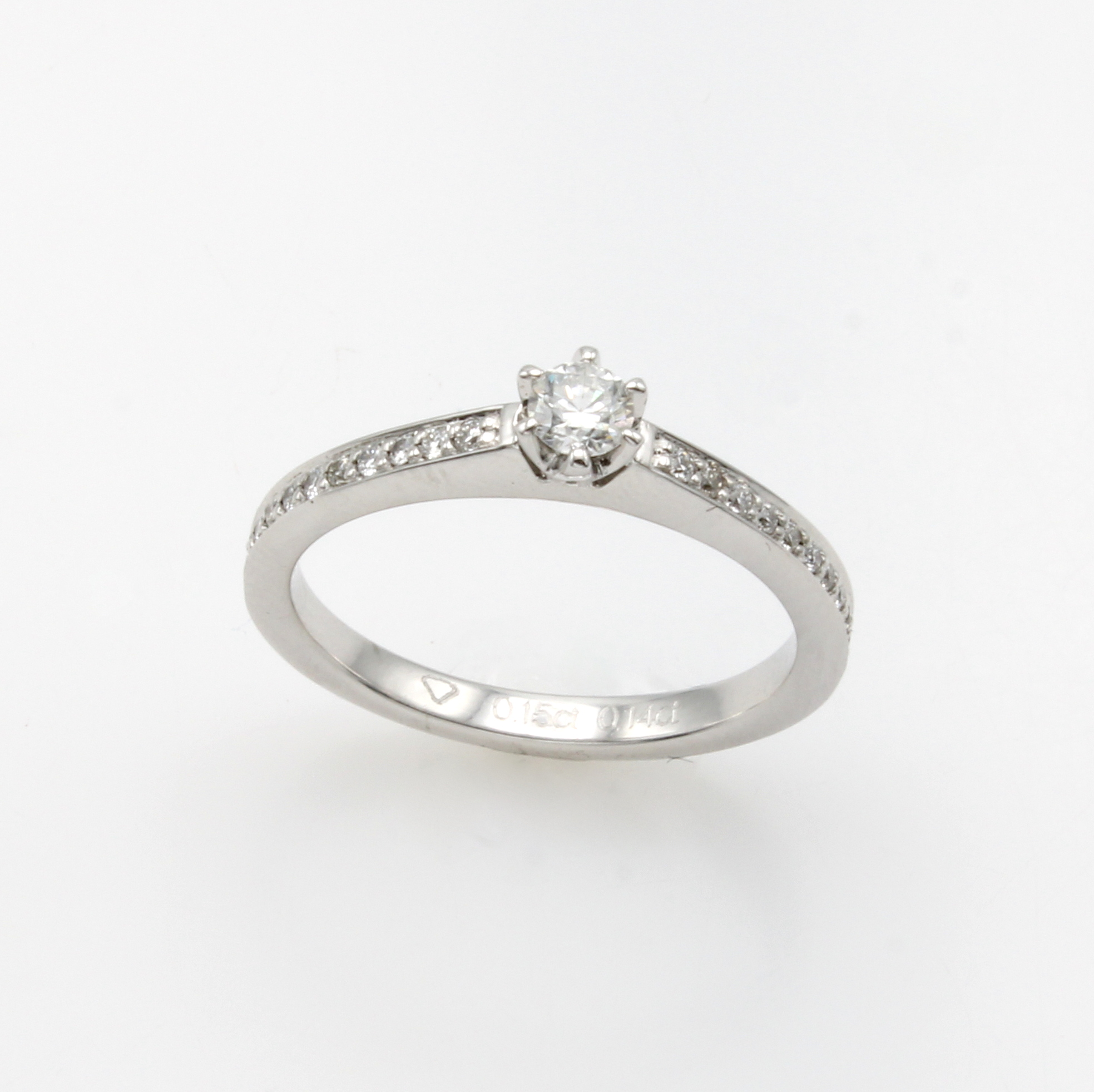 Ring mit Brillanten, WG 750/000, Schiene halb bes. m. 23 Brill. zus. ca. 0.15 ct und 1 Solitär ca. 0.14 ct Weiß/si, RW ca. 54 Schätzpreis: 3200, - EUR