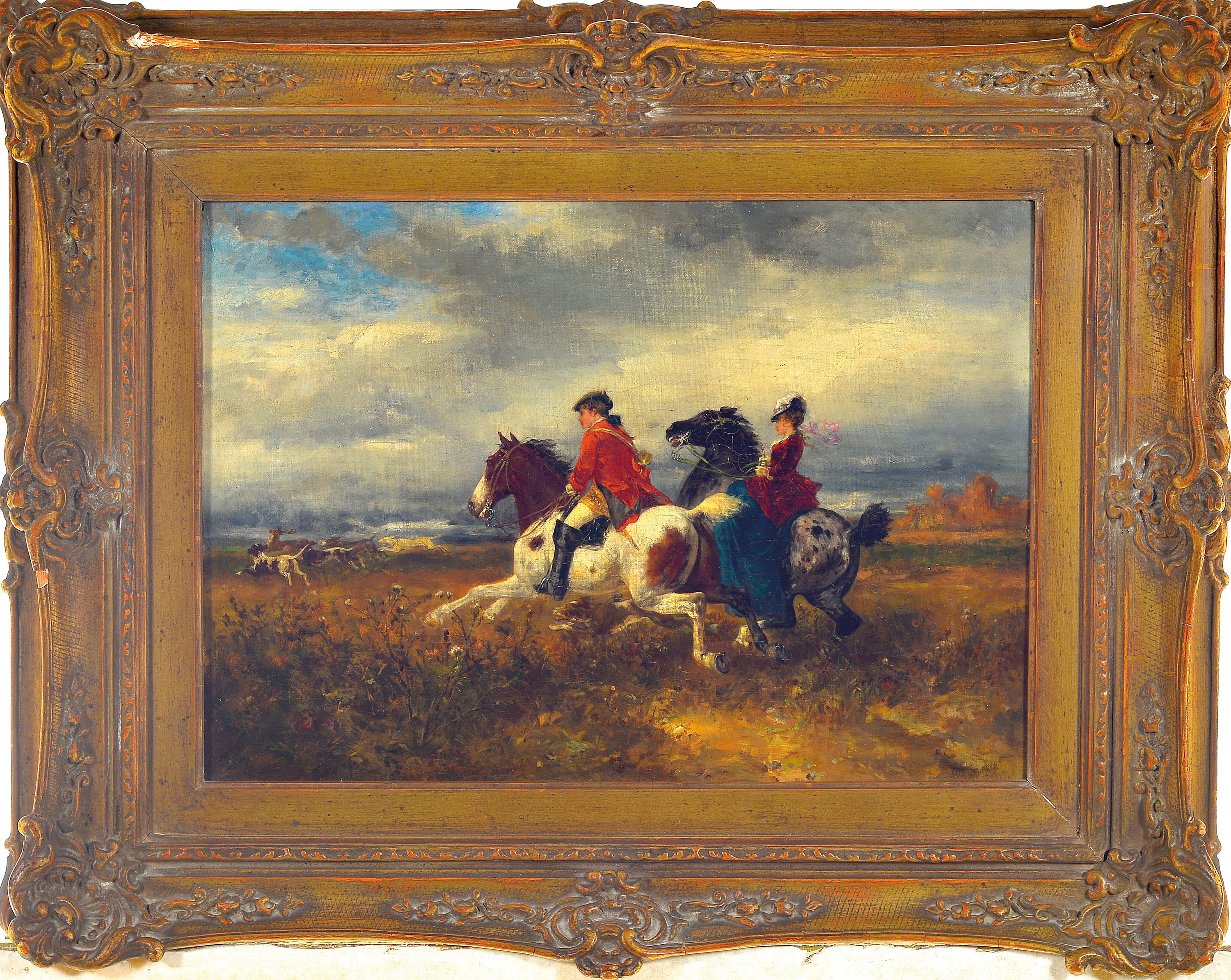 Julius Schoger, Salzburg 1847-85 Hallein, Hirschhatz, galoppierendes Paar mit Jagdhunden, Öl/Lwd, signiert und dat. 1885, krakeliert, ca. 33 x 46 cm, Prunkrahmen l. best., ca. 54 x 67 cm