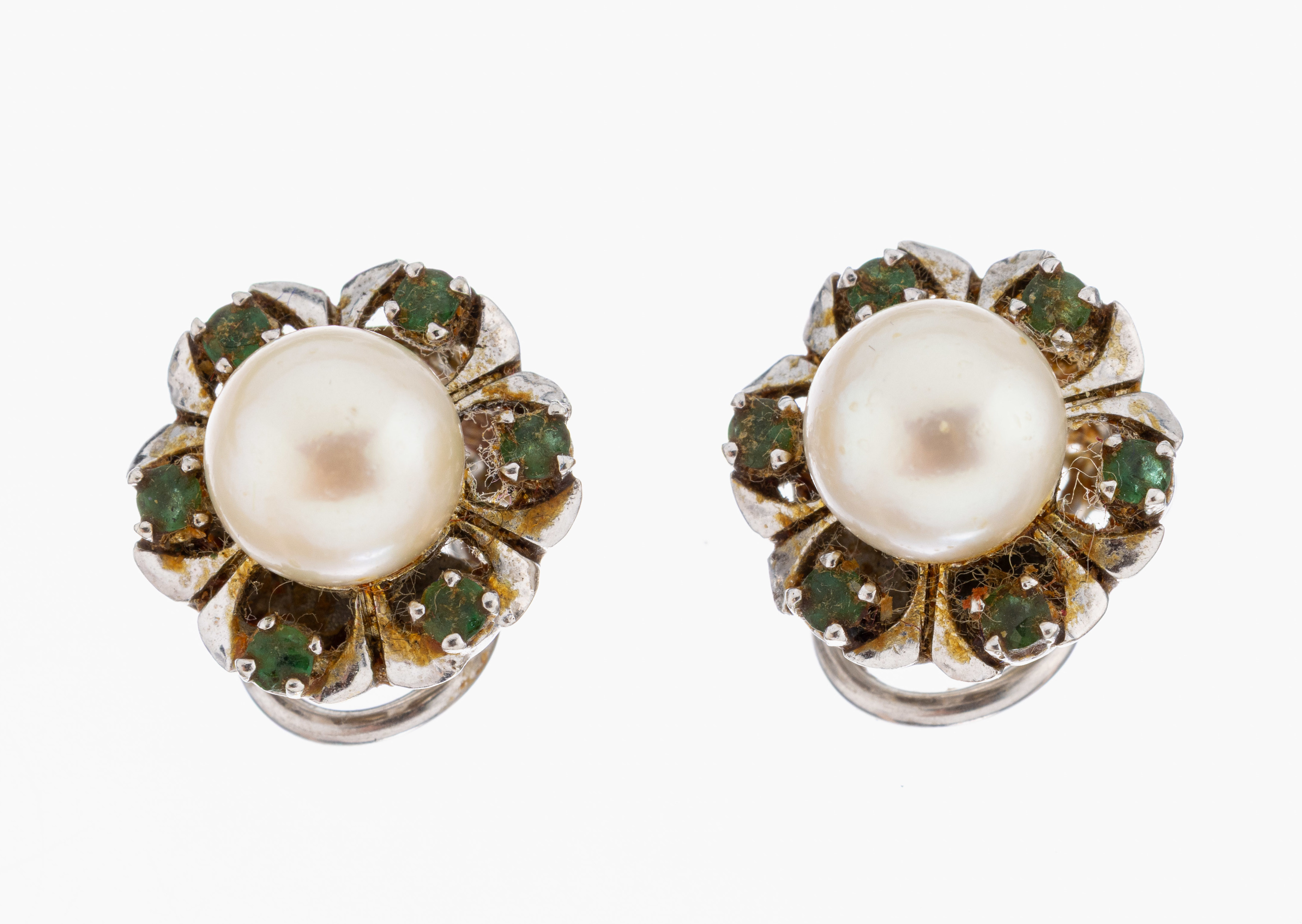 Paar 14 kt Gold Perl-Smaragd-Ohrclips, WG 585/000, blütenf., 2 Akoyazuchtperlen,