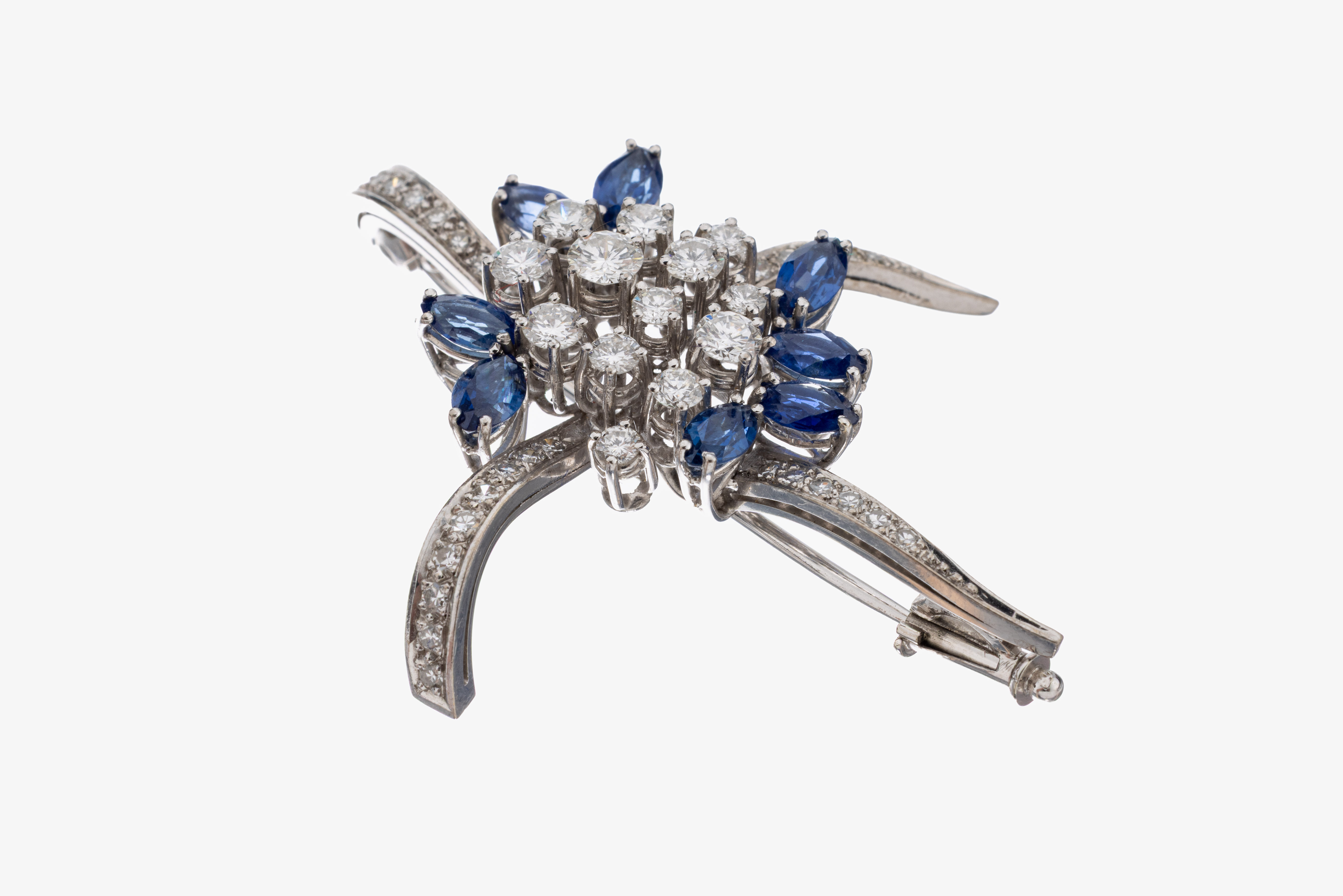 18 kt Gold Saphir-Diamant-Brosche, WG 750/000, abstrakte Gestaltung, 8 Saphirnavettes