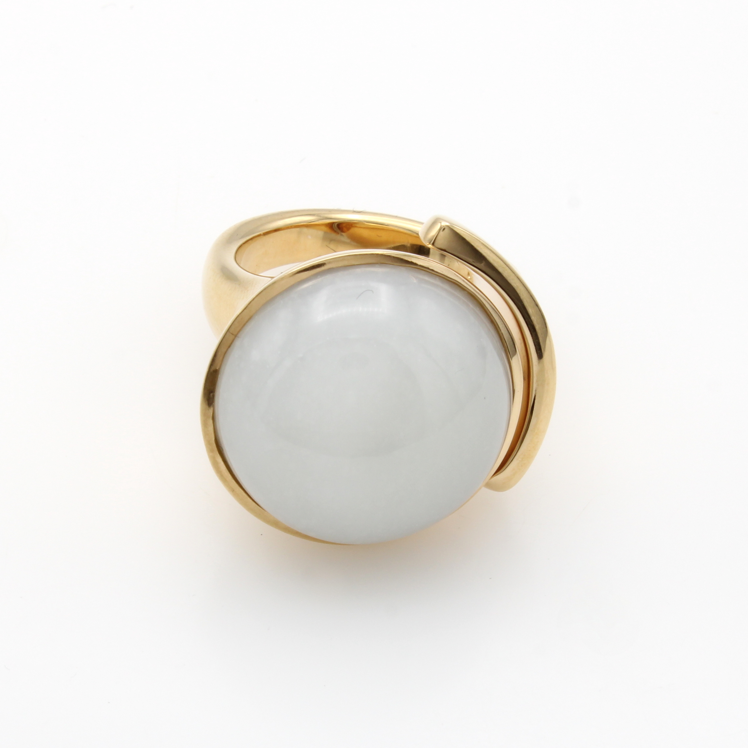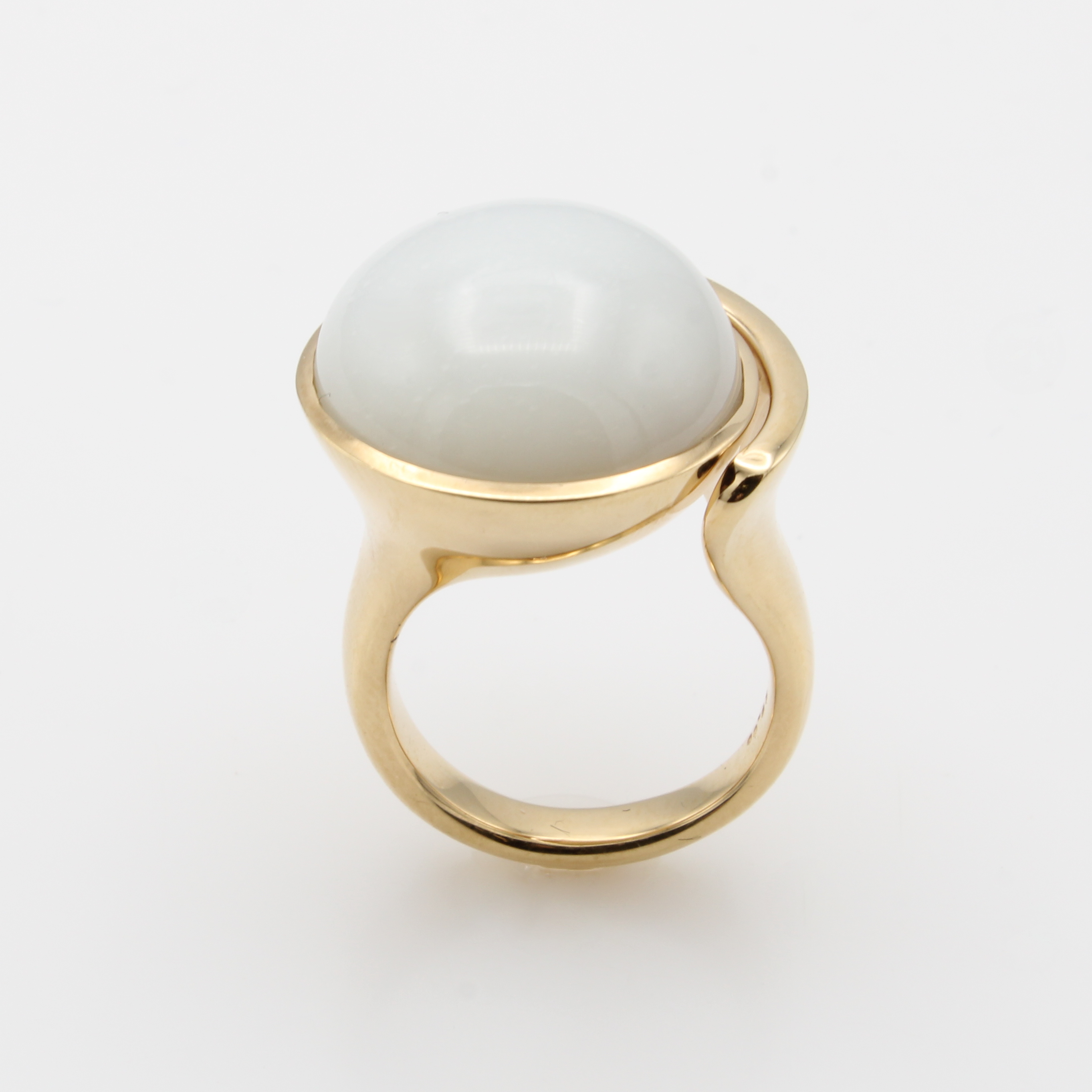 Ring mit Mondstein, RG 750/000, runder Mondsteincabochon ca. 22 ct, D. ca. 20 mm, RW ca. 57 Schätzpreis: 8690, - EUR