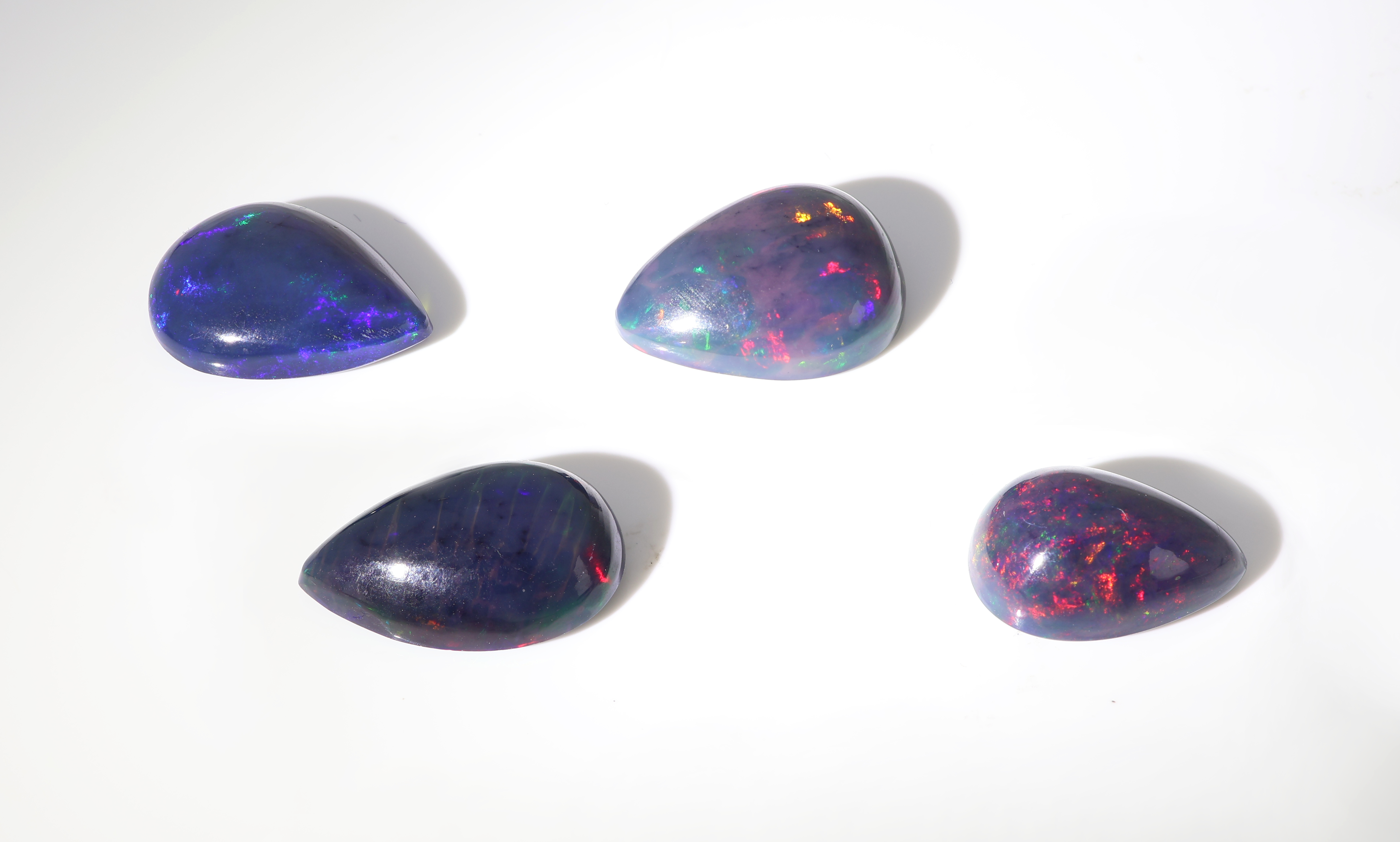 lot 4 lose schwarze Opale, zus. ca. 12.05 ct, tropfenf. Cabochons in versch. Größen, Farbspiel in Blau, Grün und Rot Schätzpreis: 1600, - EUR