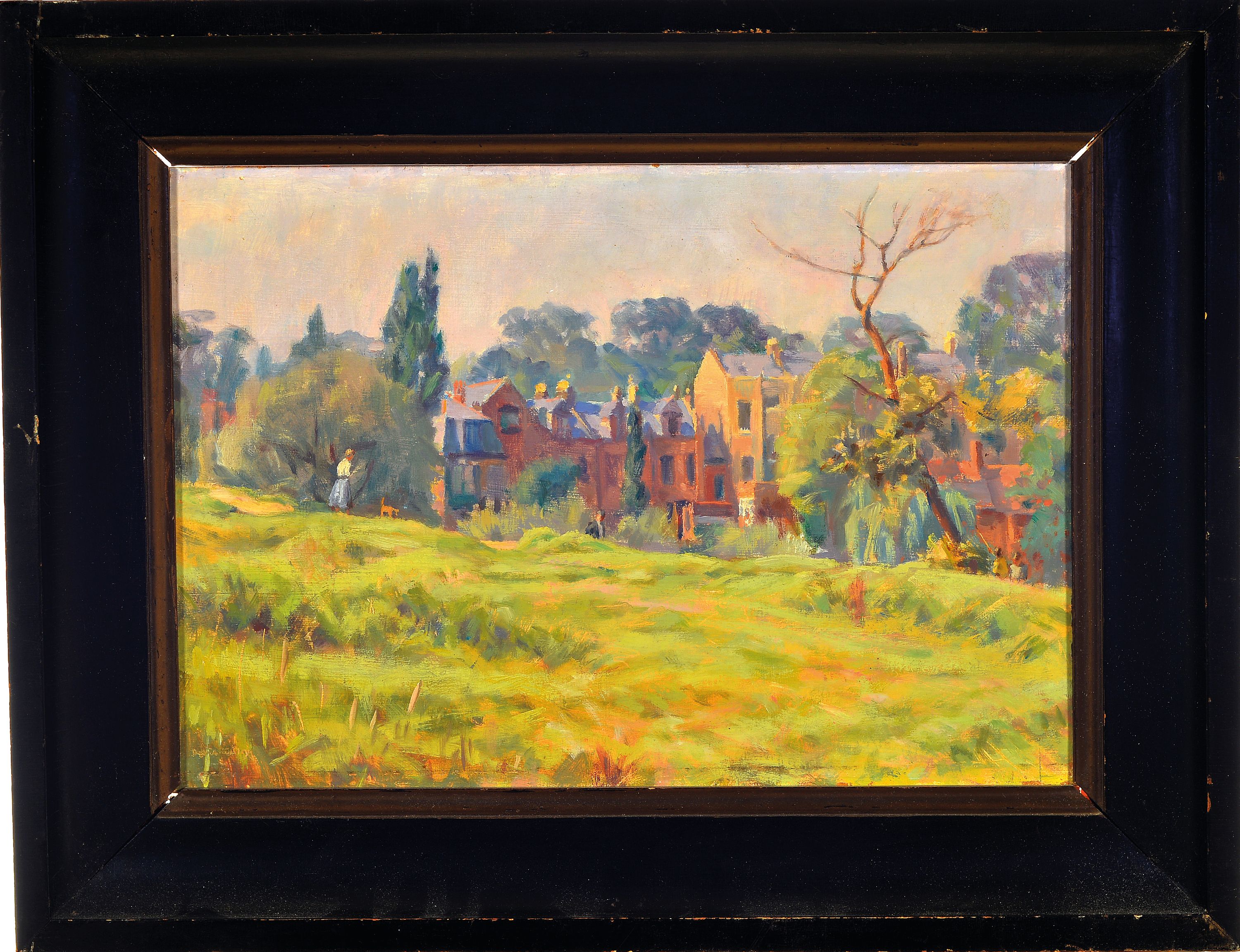 Unbekannter Künstler der Jahrhundertwende, französische Landschaft mit Blick auf ein Dorf, monogrammiert, Öl/Karton, 28x40 cm, Rahmen 42x53 cm
