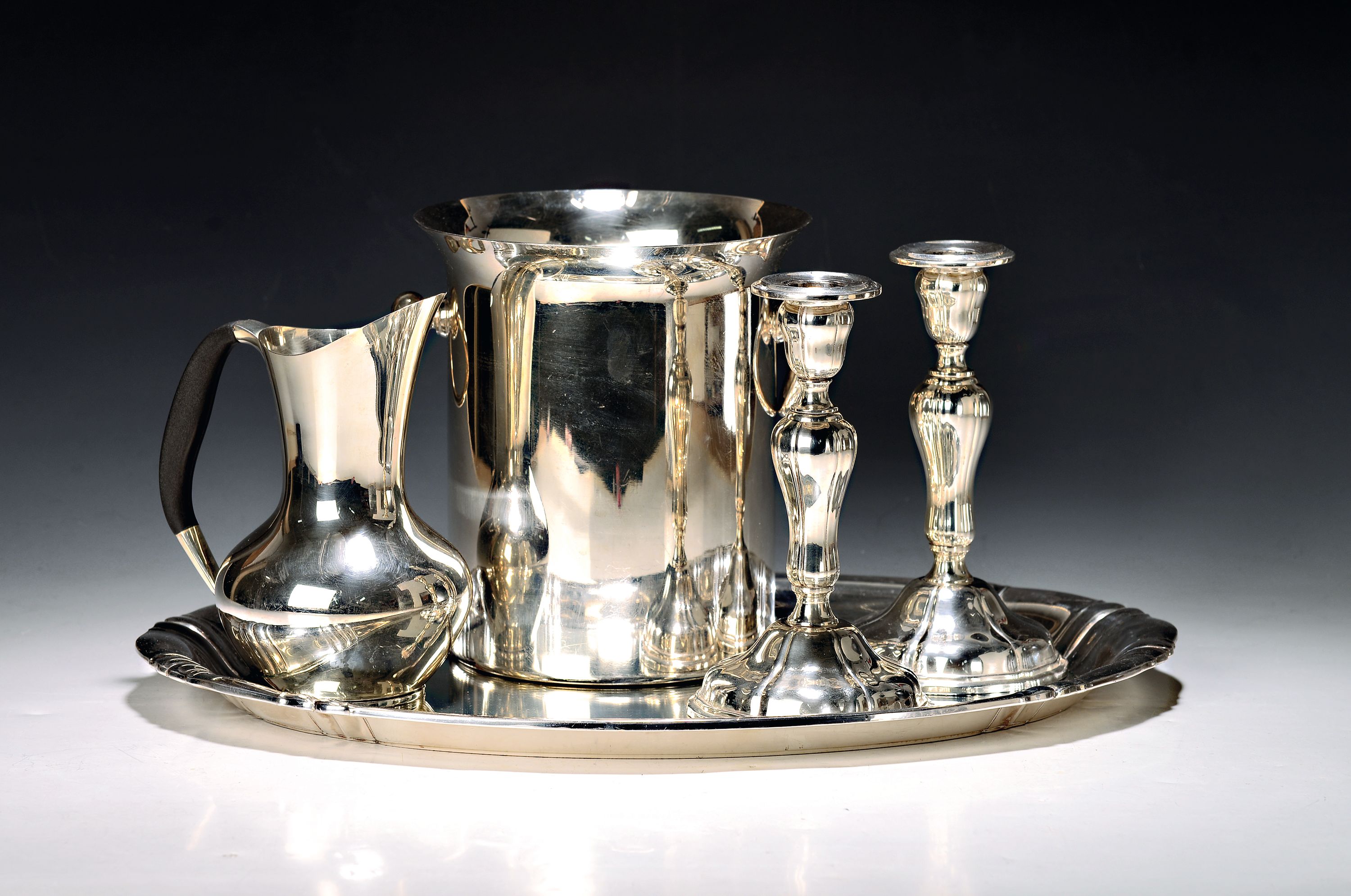 Leuchterpaar von WMF, H. 20cm; Kanne von Cohr, H. 19 cm; ovales Tablett ohne Marke,