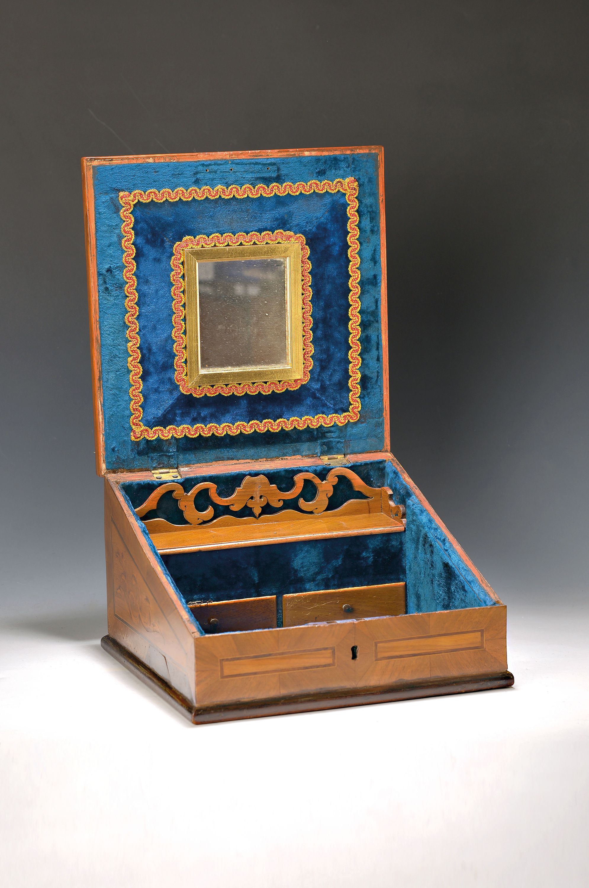 Seiten mit Rankenmotive, Innenschübe und Deckellade, Auskleidung mit blauem Samt,