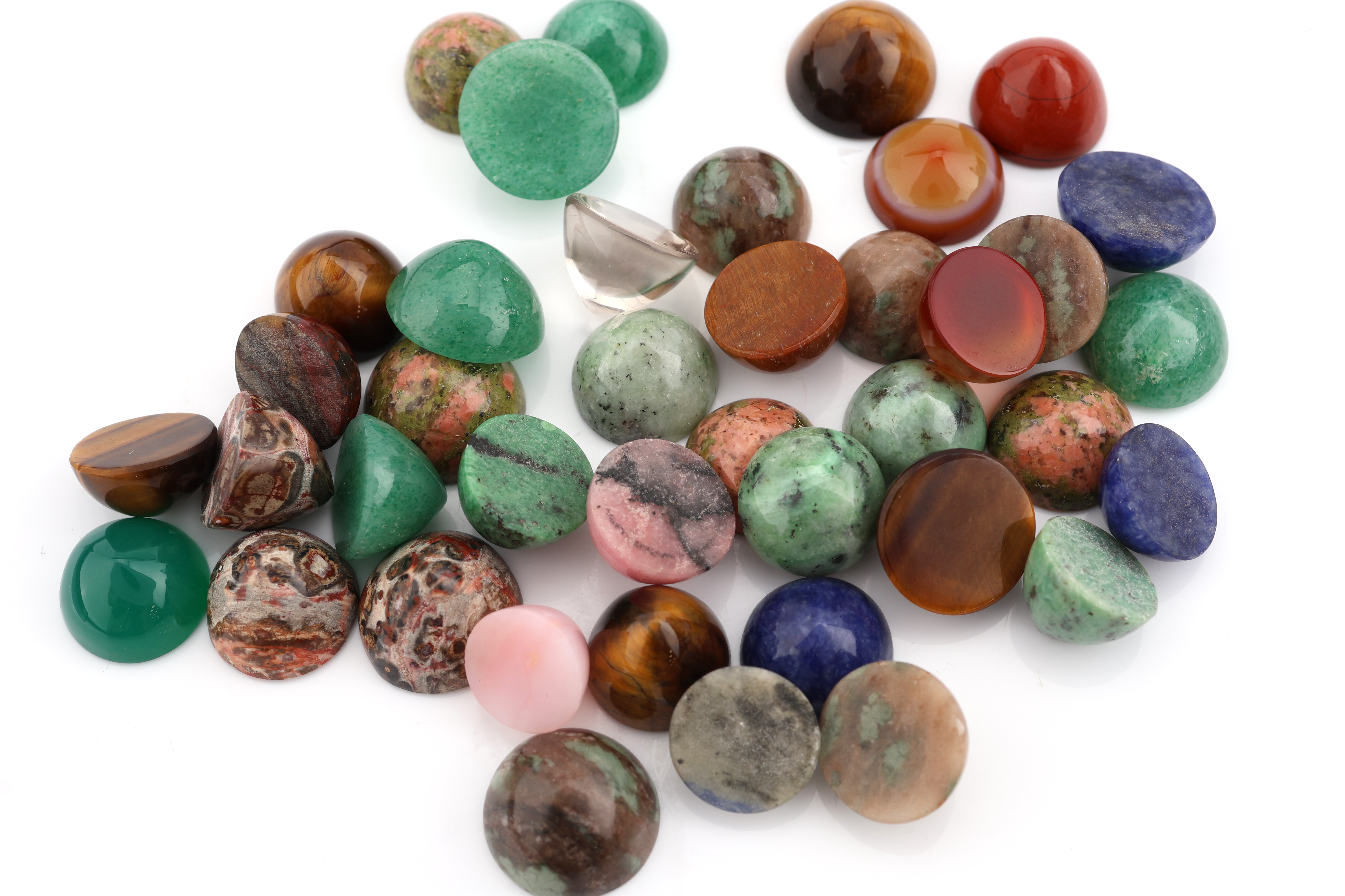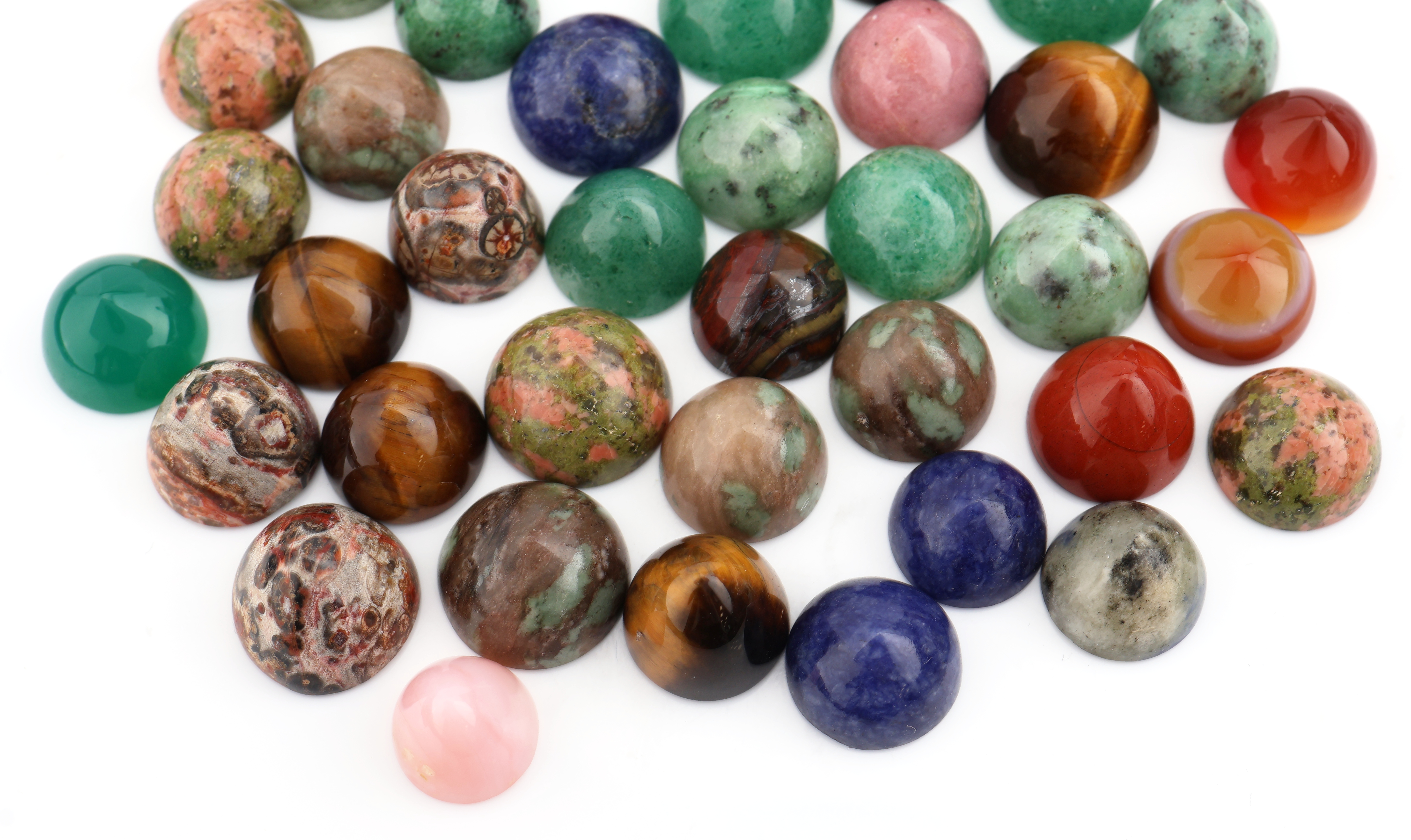 Lot lose Farbsteine, 291.60 ct, runde Cabochons, u.a. Tigerauge, Sodalith, Karneol,
