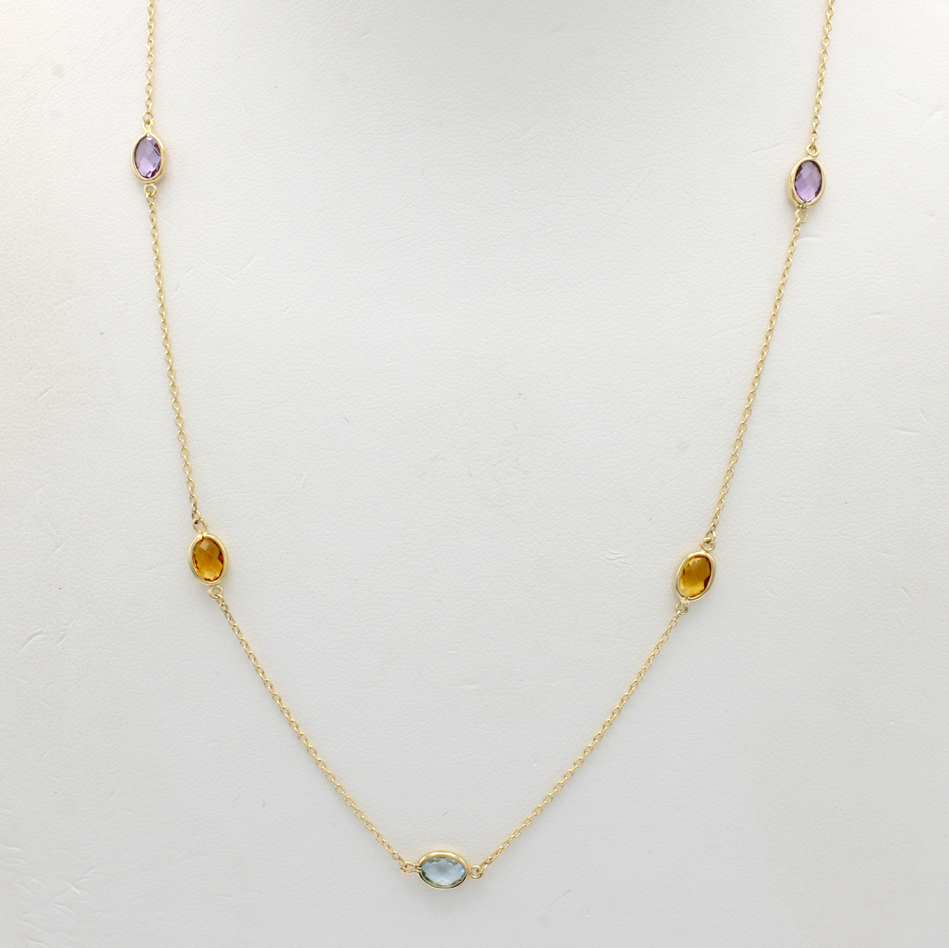 Rundankerkette mit Farbsteinen, GG 585/000, Karabinerschl., je 2 oval facett. Amethyste und Citrine, ein Blautopas (beh.), L. ca. 45 cm Schätzpreis: 1050, - EUR