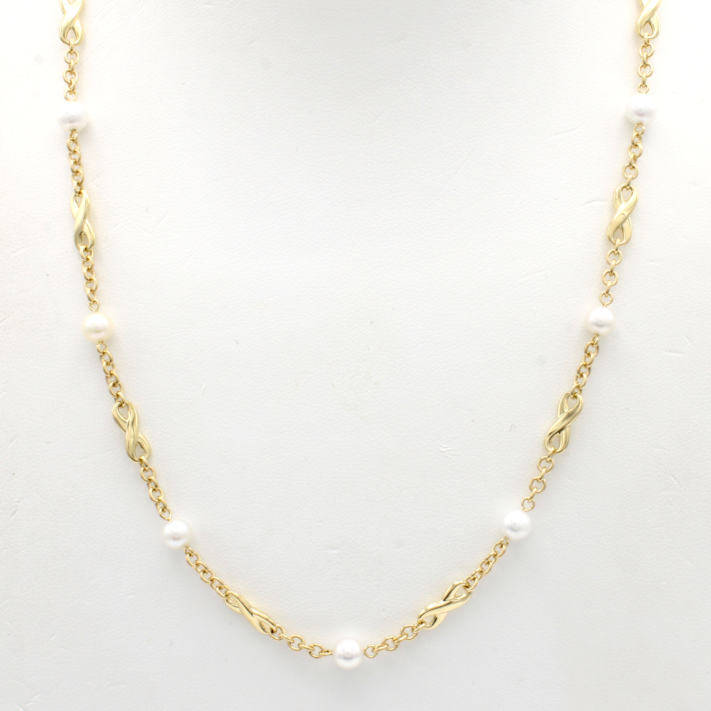 Collier "Infinity" mit Süßwasserperlen, GG 585/000, 11 Perlen von weißem Lüster D. ca. 5 mm, Karabinerschl., L. ca. 45 cm Schätzpreis: 2200, - EUR