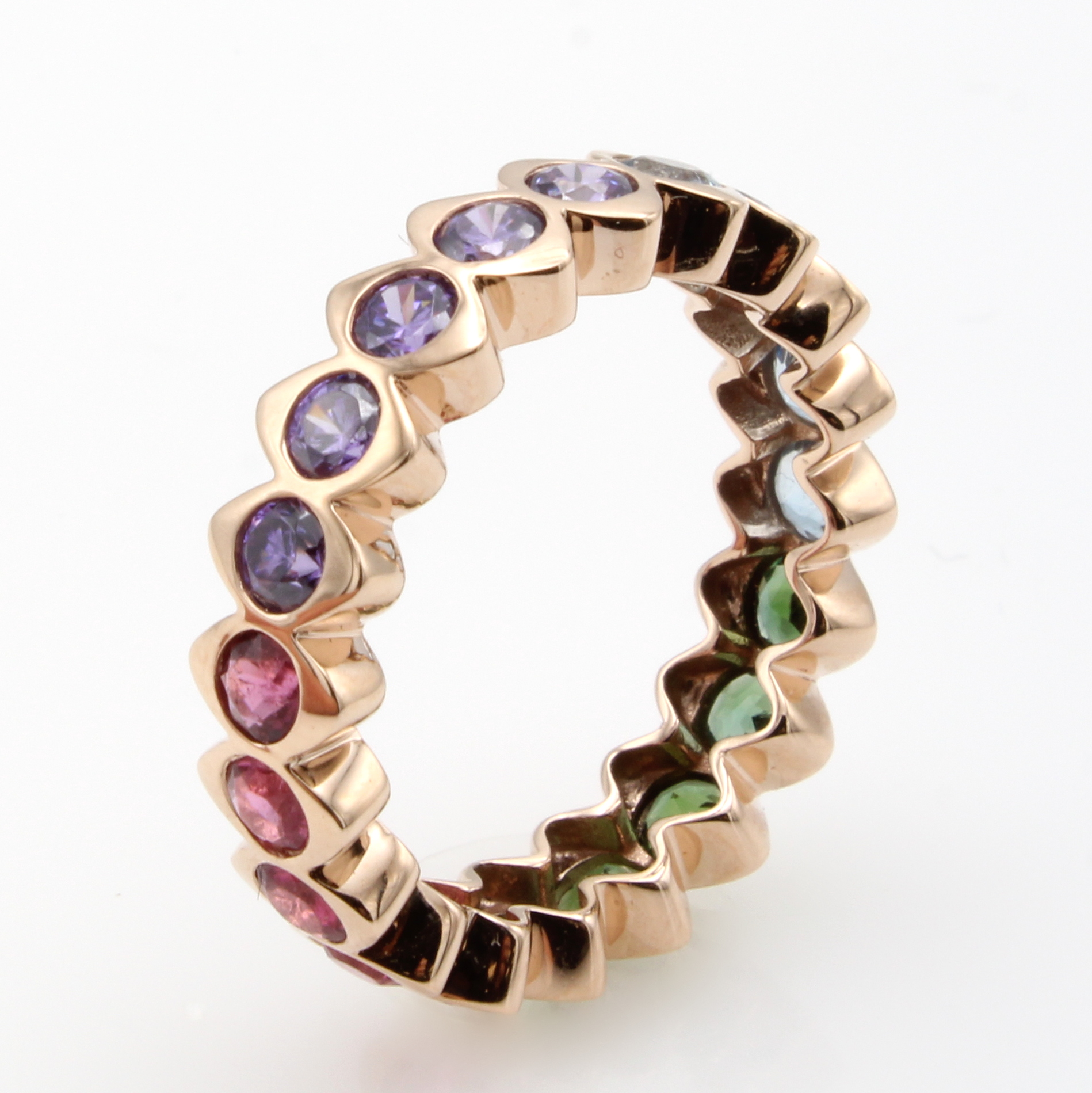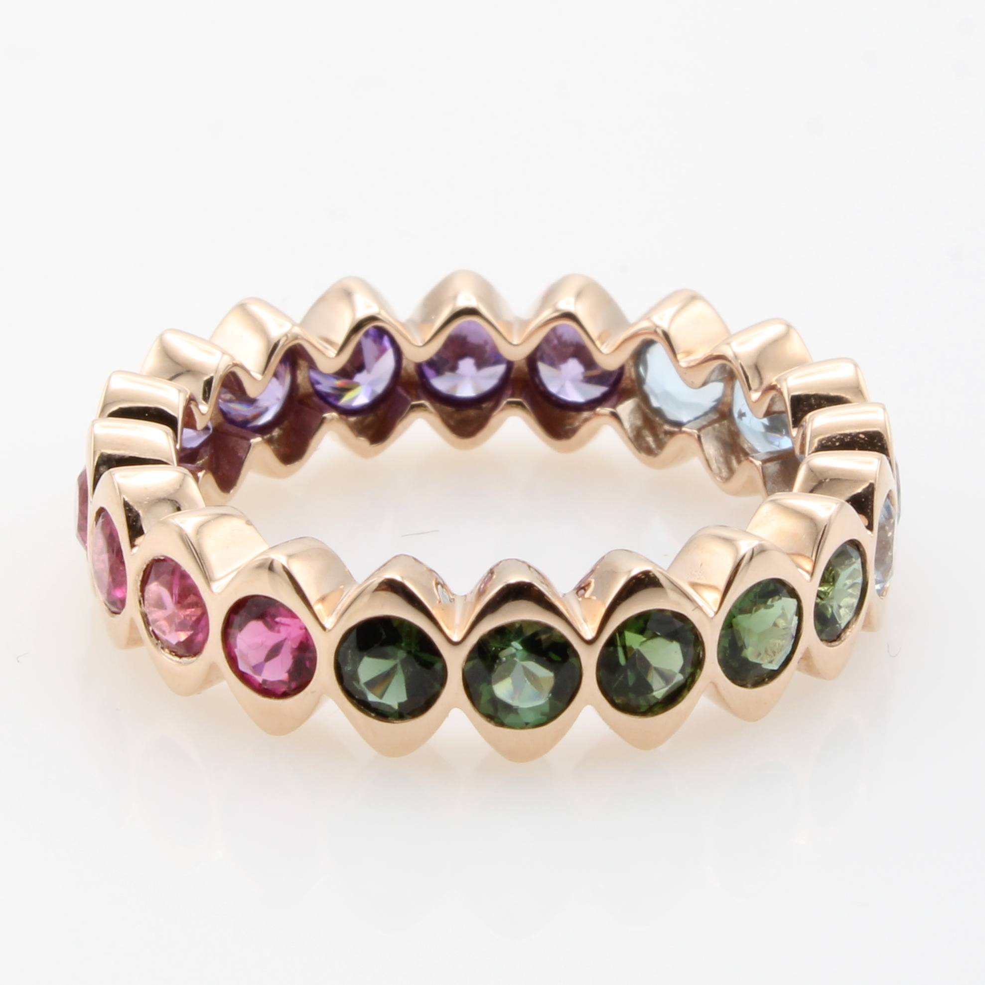 Ring mit Farbsteinen, RoséG 585/000, 5 Ame- thyste zus. ca. 1.04 ct, 5 Aquamarine zus. ca.0.56 ct, 10 Turmaline zus. ca. 1.12 ct, RW ca.55 Schätzpreis: 1620, - EUR